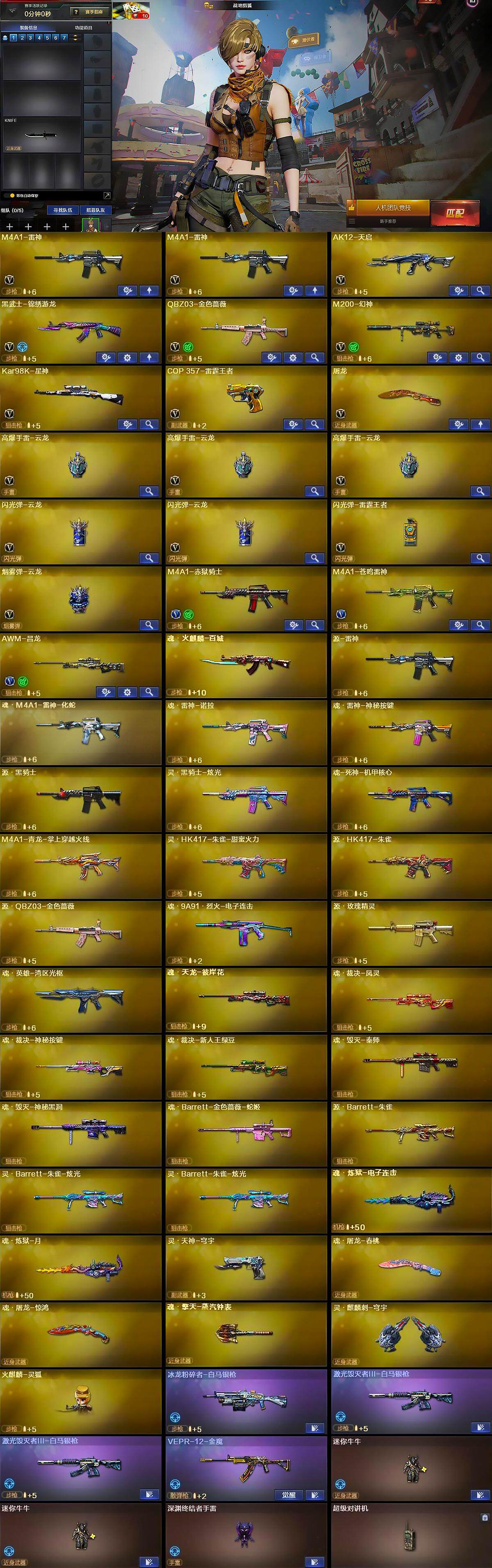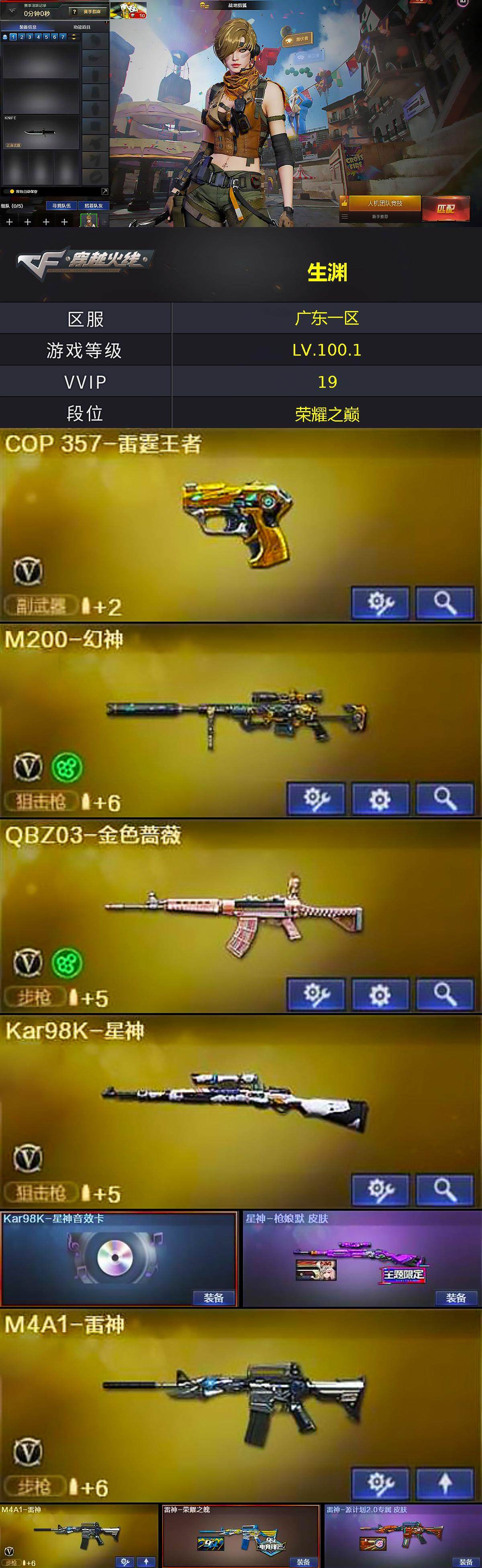 广东一区-19v-3王者-0炫金 【热门武器】:q03-金色蔷薇,m200-幻神,kar98k-星神 【音效卡】:kar98k-星神音效卡,awm-昌龙-怀旧音效卡 【皮肤】:星神-呛娘默 皮肤,雷神-荣耀之魄,雷神-源计划2.0专属 皮肤,毁灭-荣耀之怒,毁灭-秦师 皮肤,无影耀金皮肤 【角色】:战地猎狐,王者沙漠玫瑰,奇洋探员,乔伊教练,修道士,云海玲珑,炽天使,暗夜-x,电竞少女,芳心审判者,风暴女,猎狐者-追月,龙儿,龙儿-小淘气,麻雀,曼陀罗-x,曼陀罗-礼服,潘多拉-x,潘多拉-甜心教官,潜龙队-x,青霞仙子,蛇姬,蜀雪 【人偶武器】:火麒麟-灵狐,迷你牛牛2,深渊终结者手蕾,灵狐娃娃手蕾 【暴走生化】:超级对讲机 【挑战大师】:冰龙粉碎者-白马银呛,激光毁灭者iii-白马银呛2,vepr-12-金魔 【英雄级武器】:m4a1-雷神2,ak12-天启,黑武士-锦绣游龙,q03-金色蔷薇,m200-幻神,kar98k-星神,cop 357-雷霆王者-觉醒版,屠龙,高爆手蕾-云龙3,闪光丹-云龙2,闪光丹-雷霆王者-觉醒版,盐雾蛋-云龙,m4a1-赤狱骑士,m4a1-苍鸣雷神,awm-昌龙 【道具】:bs战队炫彩背包,亚洲杯纪念炫彩背包,超级背包,黄金曼提柯尔的背包,女皇终结者-魔龙之吻,救世主-黑桃战神,黄金生化钩,绿色巨人,灵魂忍者2,变异宝贝,妖姬,迷雾幽灵2,夺命之镰,防化服3,金色流光-呛王排位,星辰流光-呛王排位,巅峰赛先锋-金色流光,呛王排位28赛季金色流光,呛王排位29赛季金色流光,ep战队名片,防弹头盔4,防弹衣4,c4工具钳4,手蕾包4 【特殊呛械】: