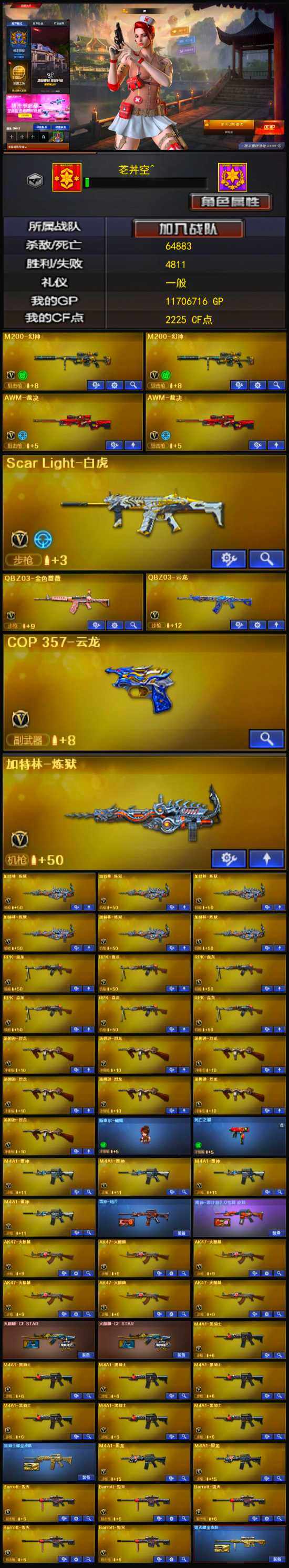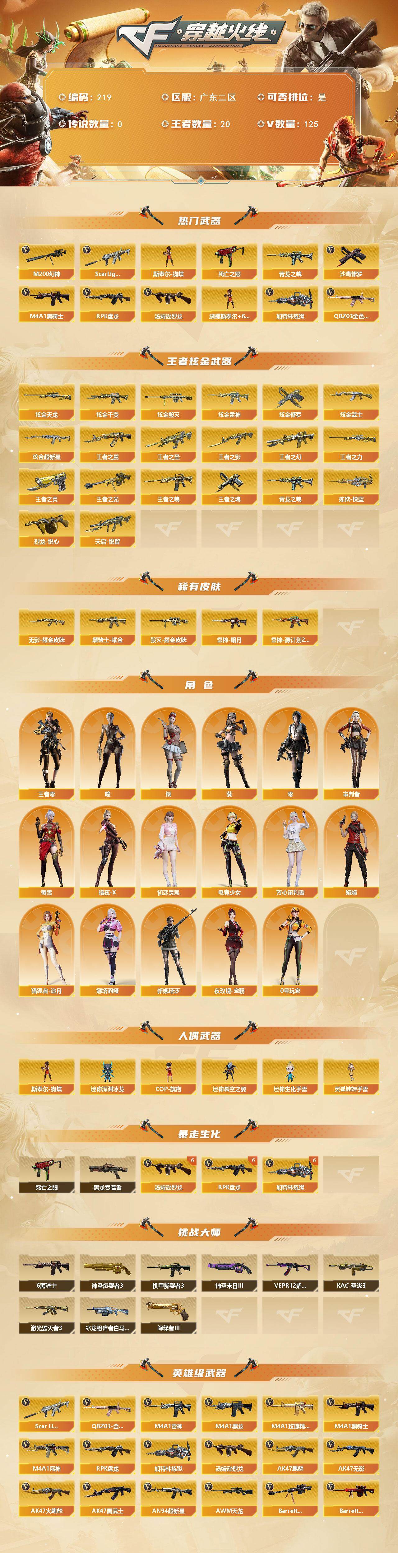 广东二区-125v-20王者-10炫金 【热门武器】:q03-金色蔷薇,scar light-白虎,m200-幻神2,死亡之眼,青龙之魄,m4a1-黑骑士7,汤姆逊-烈龙7,rpk-盘龙6,加特林-炼狱7,斯泰尔-蝴蝶,沙鹰-修罗6 【王者炫金武器】:王者之圣,天启-悦智,王者之幻2,王者之翼,王者之影,王者之魄,青龙之魄,王者之光5,王者之力2,炼狱-悦蓝,烈龙-悦心,