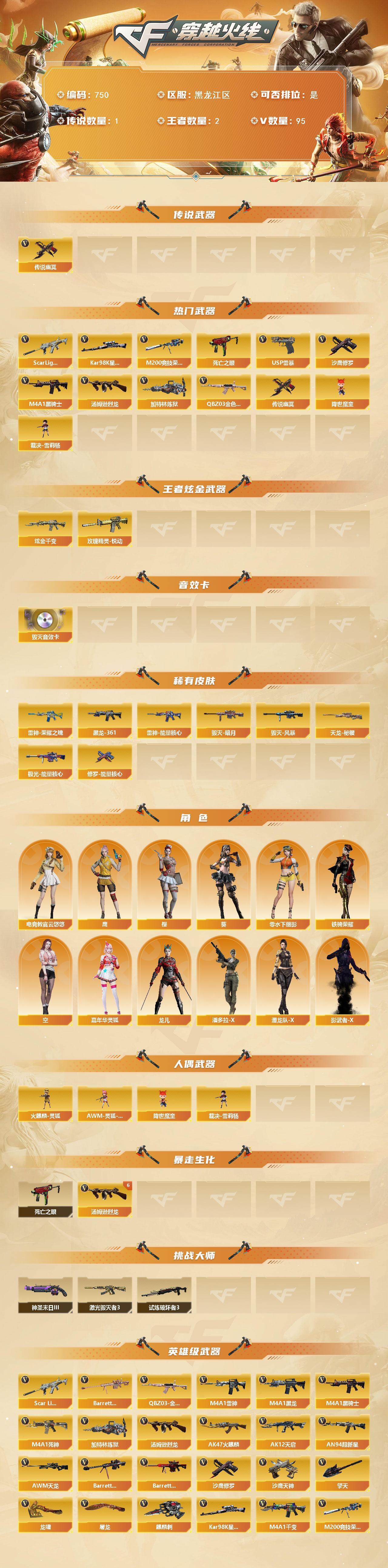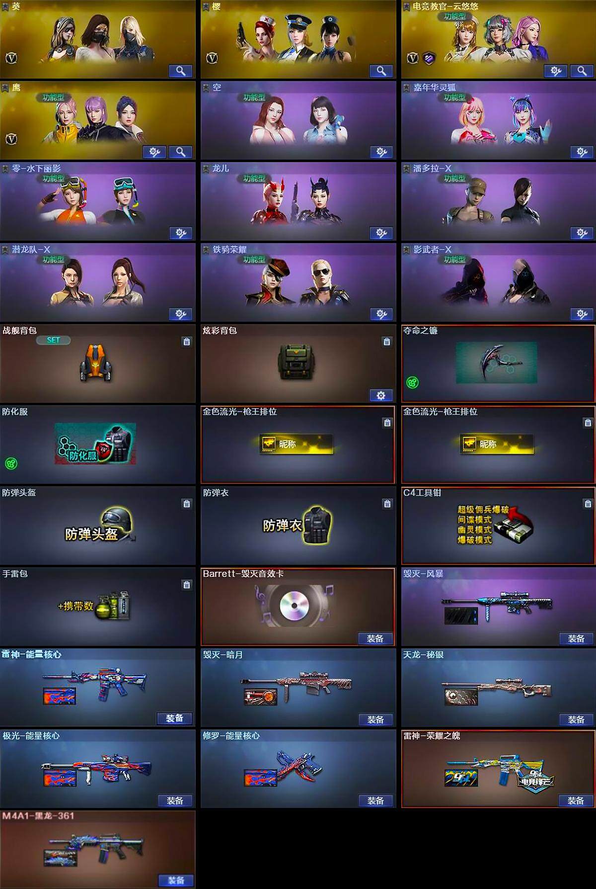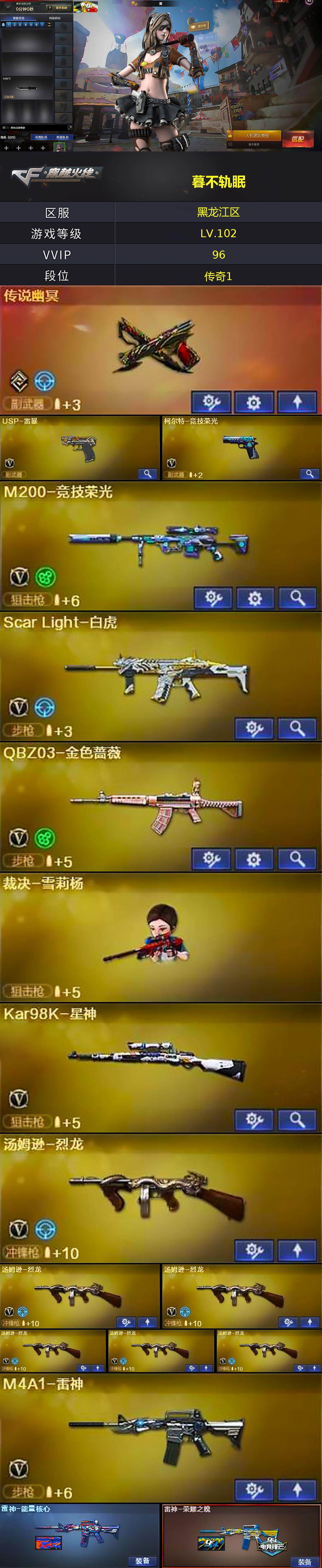 [14391712]黑龙江区-95v-2王者-1炫金 【传说武器】:传说幽冥 【热门武器】:传说幽冥,q03-金色蔷薇,scar light-白虎,m200-竞技荣光,死亡之眼,kar98k-星神,m4a1-黑骑士3,汤姆逊-烈龙6,加特林-炼狱,降世魔童,裁决-雪莉杨,usp-雷暴,沙鹰-修罗6 【王者炫金武器】:玫瑰精灵-悦动,炫金千变 【音效卡】:barrett-毁灭音效卡 【皮肤】:雷神-能量核心,雷神-荣耀之魄,毁灭-暗月,毁灭-风暴,m4a1-黑龙-361,天龙-秘银,极光-能量核心,修罗-能量核心 【角色】:葵,樱,电竞教官-云悠悠,鹰,空,嘉年华灵狐,零-水下丽影,龙儿,潘多拉-x,潜龙队-x,铁骑荣耀,影武者-x 【人偶武器】:裁决-雪莉杨,火麒麟-灵狐,awm-灵狐-15周年嘉年华,降世魔童 【暴走生化】:死亡之眼 【挑战大师】:激光毁灭者iii,试炼破坏者iii,神圣爆裂者-末日iii 【英雄级武器】:m4a1-千变,ak47-火麒麟,m4a1-黑龙,m4a1-雷神,m4a1-黑骑士3,m4a1-死神,ak12-天启,an94-超新星,scar light-白虎,无影-神兵利器,q03-金色蔷薇,王者之心-觉醒版,awm-天龙2,barrett-毁灭3,barrett-极光,kar98k-星神,m200-竞技荣光,barrett-金色蔷薇,加特林-炼狱,汤姆逊-烈龙6,沙鹰-修罗6,沙鹰-天神,usp-雷暴,柯尔特-竞技荣光,屠龙4,龙啸,马来剑-夜魔,擎天3,麒麟刺2,擎天-竞技荣光2,高爆手蕾-雷霆2,高爆手蕾-夜魔,高爆手蕾-竞技荣光7,闪光丹-雷霆2,闪光丹-夜魔,闪光丹-竞技荣光15,盐雾蛋-雷霆2,盐雾蛋-夜魔,盐雾蛋-竞技荣光8,m4a1-赤狱骑士 【道具】:战舰背包,炫彩背包,夺命之镰,防化服,金色流光-呛王排位2,防弹头盔,防弹衣,c4工具钳,手蕾包 【特殊呛械】:1白虎,3黑骑士,6烈龙,1炼狱