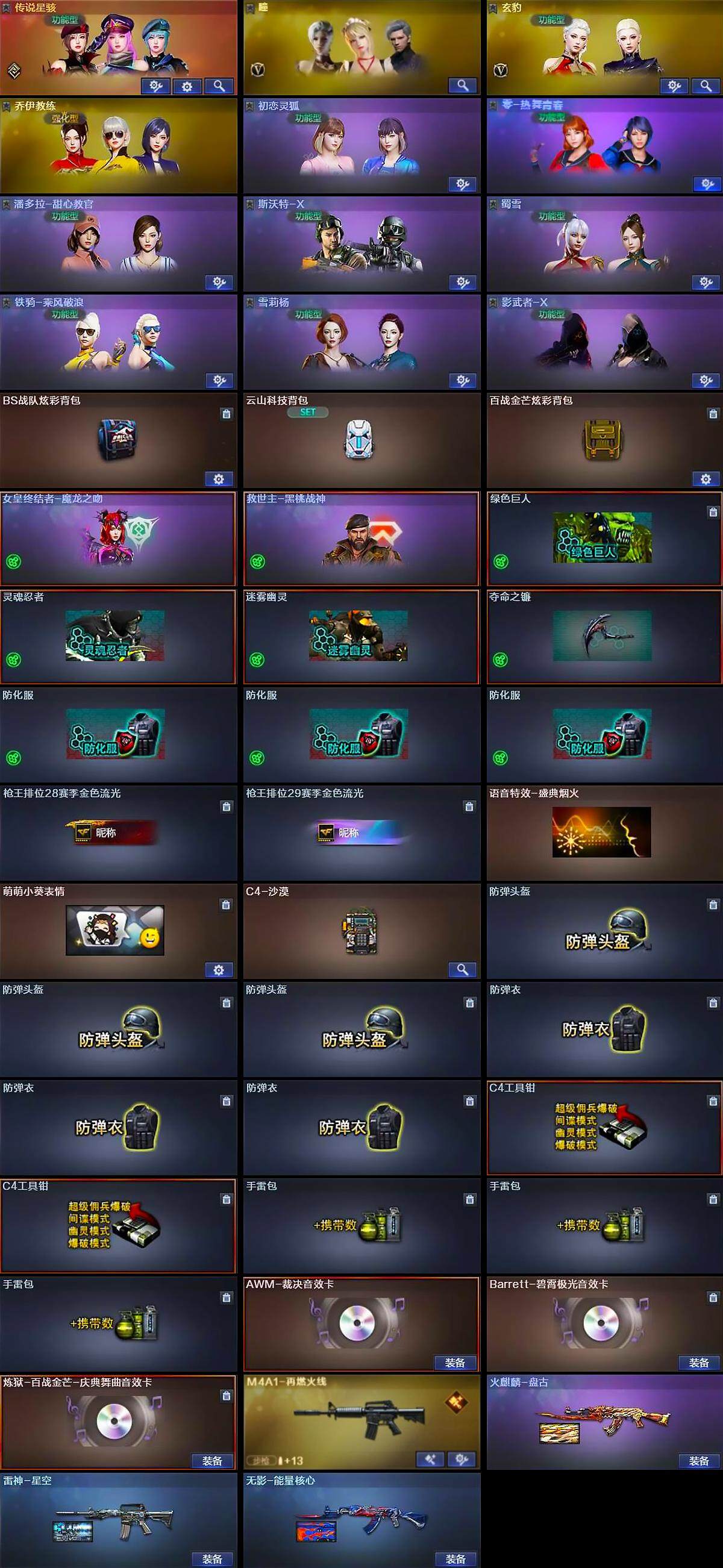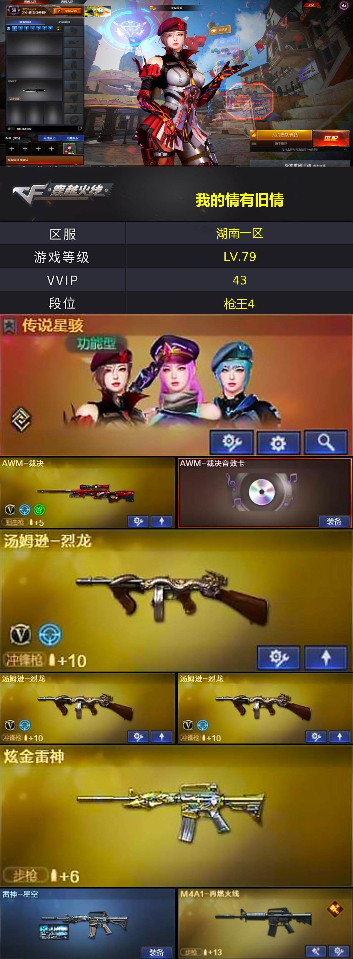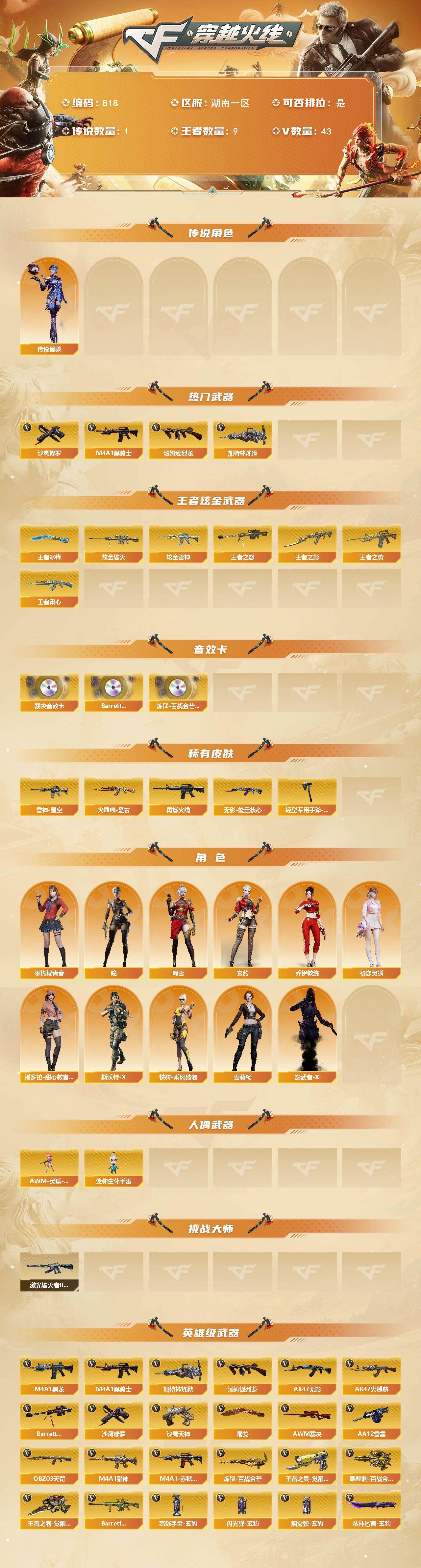 [14392431]湖南一区-43v-9王者-3炫金 【传说角色】:传说星骇 【热门武器】:m4a1-黑骑士2,汤姆逊-烈龙3,加特林-炼狱,沙鹰-修罗 【王者炫金武器】:王者之势,王者之影,王者霜心2,王者之怒,王者冰锋,炫金雷神,炫金毁灭2 【音效卡】:awm-裁决音效卡,barrett-碧霄极光音效卡,炼狱-百战金芒-庆典舞曲音效卡 【皮肤】:雷神-星空,m4a1-再燃火线,火麒麟-盘古,无影-能量核心,轻型军用手斧-再燃火线 【角色】:瞳,玄豹,乔伊教练,初恋灵狐,零-热舞青春,潘多拉-甜心教官,斯沃特-x,蜀雪,铁骑-乘风破浪,雪莉杨,影武者-x 【人偶武器】:awm-灵狐-15周年嘉年华,迷你生化手蕾 【挑战大师】:激光毁灭者iii-白马银呛 【英雄级武器】:ak47-火麒麟,m4a1-黑龙,m4a1-黑骑士2,ak47-无影,q03-天罚,m4a1-猎神,barrett-毁灭,awm-裁决,加特林-炼狱,炼狱-百战金芒,汤姆逊-烈龙3,aa-12-雷霆,沙鹰-修罗,沙鹰-天神3,王者之灵-觉醒版,屠龙,麒麟刺-百战金芒,王者之刺-觉醒版2,丛林匕首-玄豹,高爆手蕾-玄豹6,闪光丹-玄豹4,盐雾蛋-玄豹5,m4a1-赤狱骑士,barrett-碧霄极光 【道具】:bs战队炫彩背包,云山科技背包,百战金芒炫彩背包,女皇终结者-魔龙之吻,救世主-黑桃战神,绿色巨人,灵魂忍者,迷雾幽灵,夺命之镰,防化服3,呛王排位28赛季金色流光,呛王排位29赛季金色流光,语音特效-盛典烟火,萌萌小葵表情,c4-沙漠,防弹头盔3,防弹衣3,c4工具钳2,手蕾包3 【特殊呛械】:2黑骑士,3烈龙,1炼狱