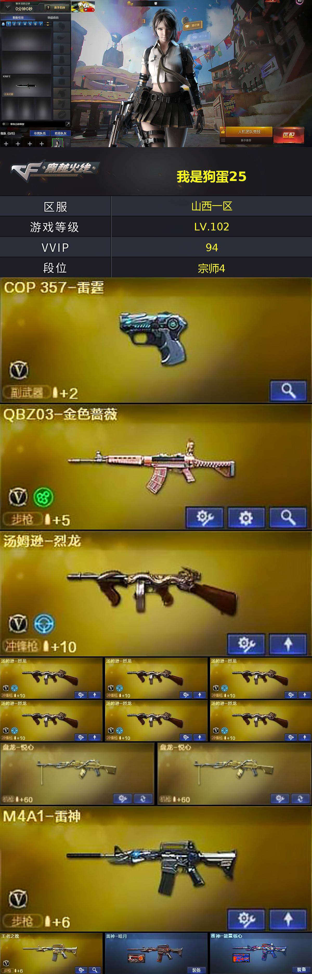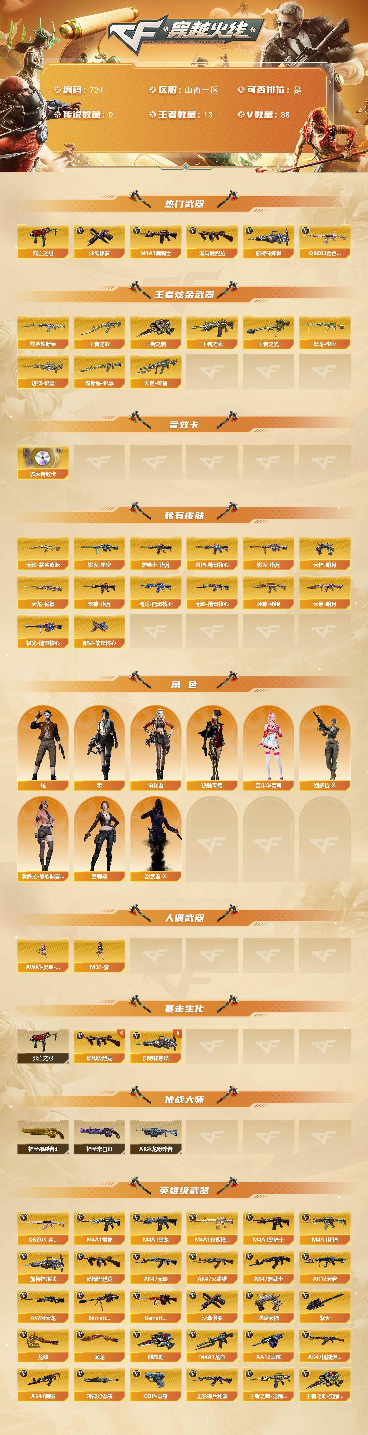 山西一区-88v-13王者-2炫金 【热门武器】:q03-金色蔷薇,死亡之眼,m4a1-黑骑士,汤姆逊-烈龙7,加特林-炼狱8,沙鹰-修罗7 【王者炫金武器】:超新星-悦享,天启-悦智,王者之武2,王者之影,王者之光,盘龙-悦心2,炼狱-悦蓝2,王者之刺,炫金超新星2 【音效卡】:barrett-毁灭音效卡 【皮肤】:雷神-暗月,雷神-能量核心,毁灭-暗月,毁灭-星空,黑龙-