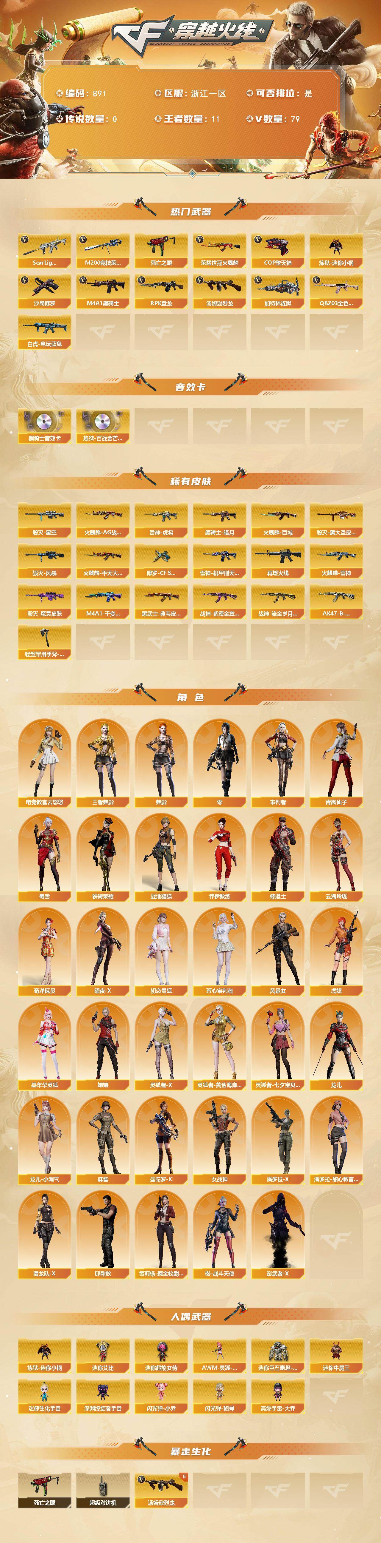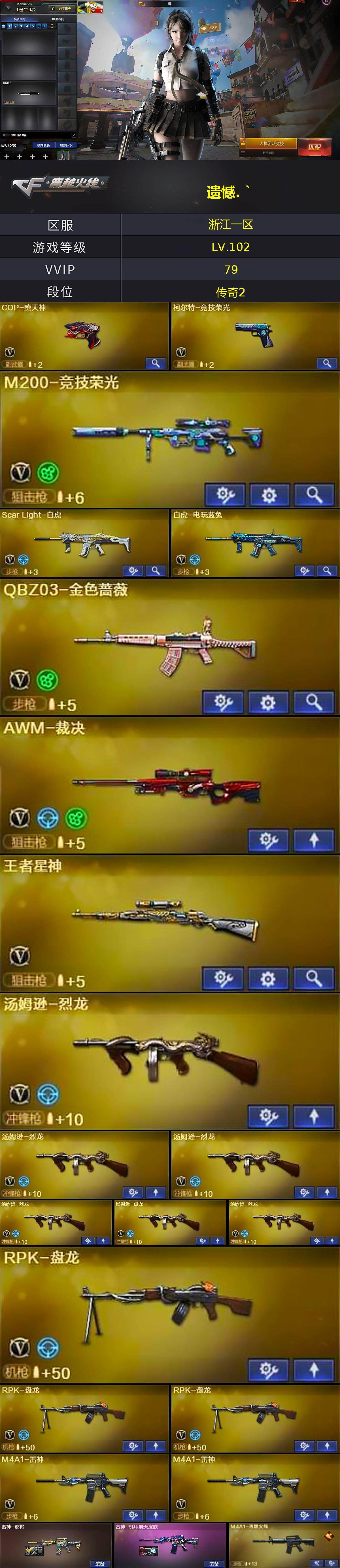 浙江一区-79v-11王者-0炫金 【热门武器】:q03-金色蔷薇,scar light-白虎,m200-竞技荣光,死亡之眼2,荣耀世冠-火麒麟,白虎-电玩蓝兔,炼狱-迷你小钢,m4a1-黑骑士,汤姆逊-烈龙6,rpk-盘龙3,加特林-炼狱3,cop-堕天神,沙鹰-修罗3 【音效卡】:m4a1-黑骑士音效卡,炼狱-百战金芒-庆典舞曲音效卡 【皮肤】:雷神-虎将,雷神-机甲刑天皮肤