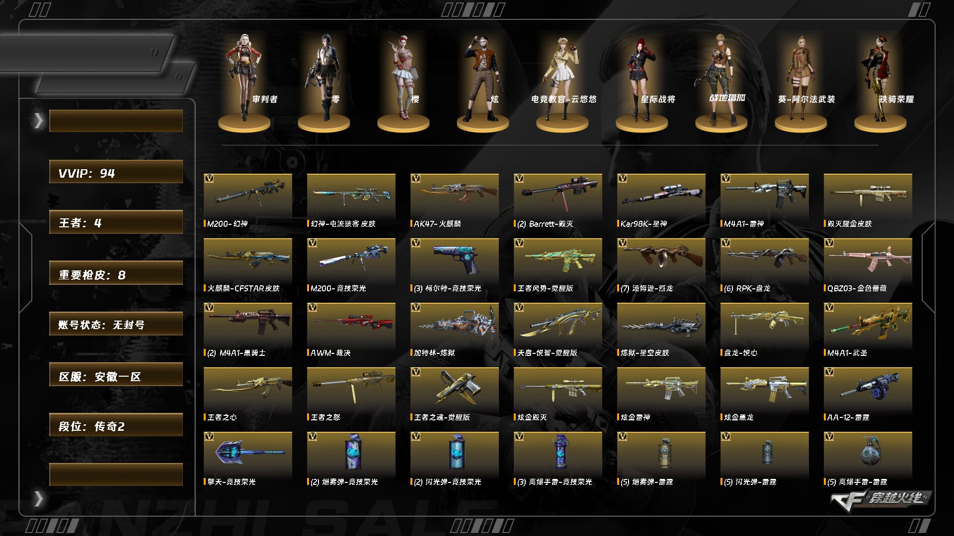 [14409417]8959/钱包十五天/东部/安徽一区/可排位【传奇2】/lv.102 荣耀元帅/vip3/94v/幻神/幻神电流骇客/m200竞技荣光套/星神/星神音效卡/白虎电玩蓝兔/q金色蔷薇/q音效卡/g36c幻影/裁决/柯尔特荣耀世冠2023/cop雷霆之契/柯尔特竞技荣光/
