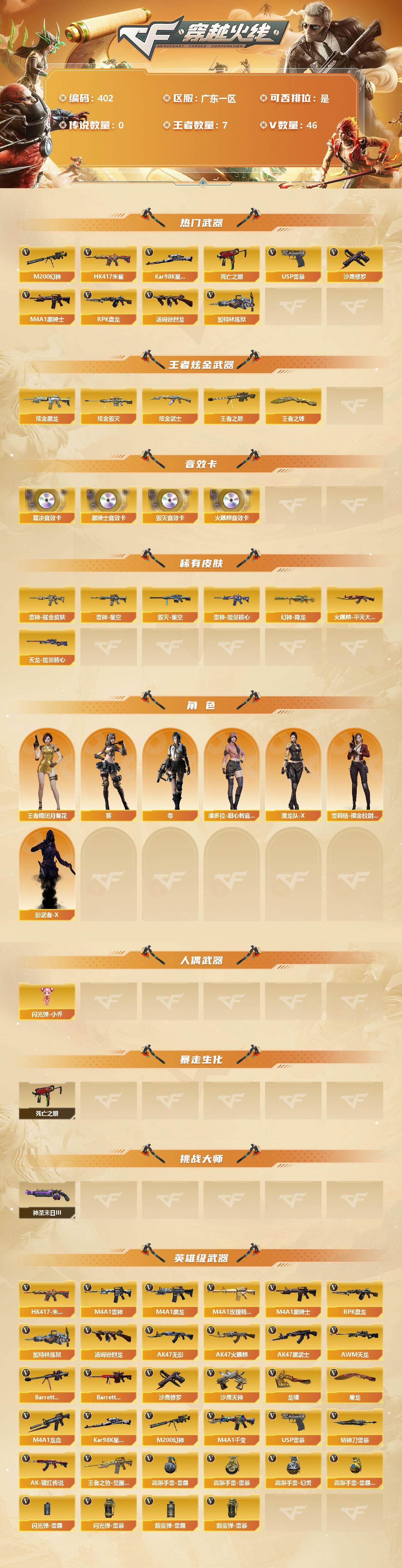 [14411758]广东一区-46v-7王者-3炫金 【热门武器】:hk417-朱雀,m200-幻神,死亡之眼2,kar98k-星神,m4a1-黑骑士2,汤姆逊-烈龙,rpk-盘龙,加特林-炼狱,usp-雷暴,沙鹰-修罗3 【王者炫金武器】:王者之怒,王者之锋,炫金黑龙,炫金毁灭,炫金武士 【音效卡】:ak47-火麒麟音效卡,m4a1-黑骑士音效卡,barrett-毁灭音效卡,awm-裁决音效卡 【皮肤】:幻神-降龙,雷神-暗月,雷神-能量核心,雷神-星空,雷神-耀金皮肤,火麒麟-雷神,火麒麟-平天大圣,毁灭-星空,黑龙-暗月2,黑骑士-少林,无影-能量核心,战神-紫绶金章皮肤,战神-流金岁月皮肤,ak47-b-常胜将军-曹操,天龙-能量核心,极光-能量核心,修罗-能量核心 【角色】:零,葵,王者-瞳-闭月羞花,潘多拉-甜心教官,潜龙队-x,雪莉杨-摸金校尉,影武者-x 【人偶武器】:闪光丹-小乔 【暴走生化】:死亡之眼2 【挑战大师】:神圣爆裂者-末日iii 【英雄级武器】:m4a1-千变,ak47-火麒麟,m4a1-黑龙,m4a1-雷神,m4a1-黑骑士2,ak47-无影,ak47-黑武士,m4a1-龙血,hk417-朱雀,m4a1-玫瑰精灵,王者之势-觉醒版,ak-47-猩红传说2,awm-天龙2,barrett-毁灭,barrett-极光,m200-幻神,kar98k-星神,rpk-盘龙,加特林-炼狱,汤姆逊-烈龙,沙鹰-修罗3,沙鹰-天神2,usp-雷暴,屠龙2,龙啸,斩神刀-雷暴,高爆手蕾-雷霆,高爆手蕾-雷暴,高爆手蕾-幻灵,高爆手蕾-雷霆王者,闪光丹-雷霆,闪光丹-雷暴,盐雾蛋-雷霆,盐雾蛋-雷暴 【特殊呛械】:2黑骑士,1烈龙,1盘龙,1炼狱