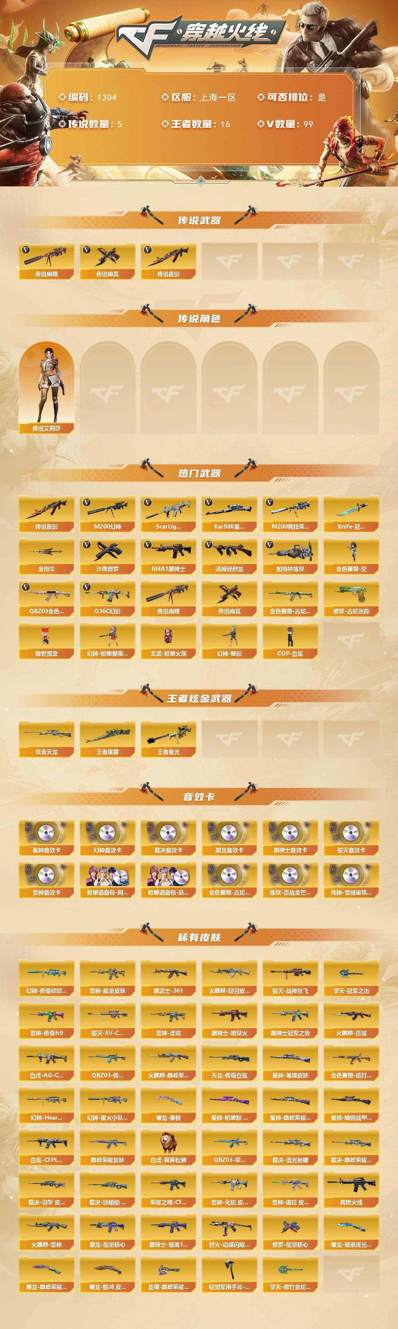 【1304】特24142东部上海一区可排位可二次【上海一区/107v/vip3/5传说】【纯白无封号/超核玩家/送英雄联盟1000皮肤/四防传说艾莉莎/传说幽瞳/8把幻神/幻神三件套3皮肤/星火/传奇欧欧/女团/星神三件套4皮肤/裁决三件套5皮肤/5烈斯泰尔呛娘/传说夜影/传说幽冥/幻神小人呛2个/2把冠军小刀/白虎茸茸/8四防角色/8手呛/7套雷//10张音效卡/ab背包拓展/女团系列皮肤/通行证奖励拉满】【竞技荣光套/武圣套】【m200-幻神8/m200-幻神音效卡/幻神-星火小队签名臻藏版 皮肤/幻神-传奇欧欧 皮肤/幻神-heartshot 皮肤】【kar98k-星神/kar98k-星神音效卡/星神-暗钢战甲/星神-璀璨皮肤/星神-呛娘默 皮肤/星神-巅峰荣耀 皮肤】【awm-裁决2/awm-裁决音效卡/裁决-巅峰荣耀皮肤/流光秘银/百城/运输船/羽掣】【竞技荣光套/武圣套】【王者幻神】【knife-冠军之刃2】【g36c-幻影2】【柯尔特-竞技荣光】【scar light-白虎/白虎-白鲨-cfpls23冠军】【q03-金色蔷薇/q03-金色蔷薇音效卡/q03-荣耀世冠ep皮肤/q03-传奇宠儿/q03-巅峰荣耀皮肤/金色蔷薇-纸灯龙皮肤】【m4a1-雷神/m4a1-雷神音效卡/荣耀之魄-cfpl十周年臻藏版/雷神-传奇n9/雷神-heartshot 皮肤/雷神-耀金皮肤/雷神-虎将】【glock18-武圣】【barrett-毁灭/barrett-毁灭音效卡/毁灭-sv-cfpls16冠军/毁灭-战神张飞】【ak47-火麒麟2/火麒麟-巅峰荣耀/火麒麟-百城/火麒麟-cfstar/火麒麟-轻羽皮肤/火麒麟-雷神】【m4a1-黑骑士/m4a1-黑骑士音效卡/黑骑士-冠军之势/黑骑士-地狱火】【m4a1-黑龙/黑龙-能量核心】【烈火-动感闪耀 皮肤】【ak47-无影/无影-神兵利器】【ak47-黑武士/ak47-黑武士-361】【awm-天龙-传奇白鲨】【m4a1-千变】【汤姆逊-烈龙4/烈龙-云海游龙】【加特林-炼狱】【迷你生化手蕾】【沙鹰-修罗2/修罗-cfstar/修罗-能量核心】【天神-动感闪耀】【麒麟刺】【擎天/擎天-冠军之击/擎天-云海游龙/擎天-竞技荣光3】【屠龙6/屠龙-动感闪耀/屠龙-秘银/屠龙-春桃 皮肤/屠龙-破浪逐光 皮肤2】【龙啸/龙啸-烈火龙威】【电竞教官-云悠悠/呛娘樱/晴雅/关小雨/王者云悠悠/王者炽天使/王者-魅影/王者零-华冠丽服/王者玲珑-小乔/王者-葵-貂蝉/王者-零-国色天香/王者-瞳-闭月羞花/魅影/暗夜-x/月兔特工/司雨/狐影/葵-赛博朋克/木兰/云海玲珑/乔伊教练/兔囡囡/零-水下丽影/灵狐-花神/麻雀/妲己/潘多拉-x/影武者-x/铁骑荣耀/幻影/堕天使/复仇者】【m4a1-武圣】【barrett-暗月传说】【colt1911-小故障/colt 1911-大黄蜂2/cop 357-青龙/新usp-呛王排位奖励2】【金刚伞】【神圣爆裂者-末日iii/激光毁灭者iii-白马银呛/冰龙粉碎者-白马银呛2/巨龙咆哮-深渊金】【斯泰尔-呛娘暗刃/斯泰尔-巧克力2/轻型军用手斧-镜】【龙宝投影/cop-白鲨2/芭蕾特-零-水下丽影/夺魂/斯泰尔-呛娘暗刃/王者m200-无畏金戈/金色蔷薇-空】【王者之魂/王者之啸/王者星霆】【高爆手蕾-竞技荣光6/闪光丹-竞技荣光6/盐雾蛋-竞技荣光4】【手蕾-云海游龙】【高爆手蕾-雷暴/闪光丹-雷暴】【盐雾蛋-雷霆】【盐雾蛋-荣耀世冠白鲨2023】【炫金天龙】【呛娘语音包-阿敏/呛娘语音包-凯萨林/语音特效-云海游龙】【透明头盔/烟雾保护头盔/运动护目镜/超级对讲机/超级背包/炫彩背包/防弹头盔4/防弹衣4/c4工具钳4/手蕾包4/防化服4】源武器多多皮肤多多底价处理机会难得手慢无