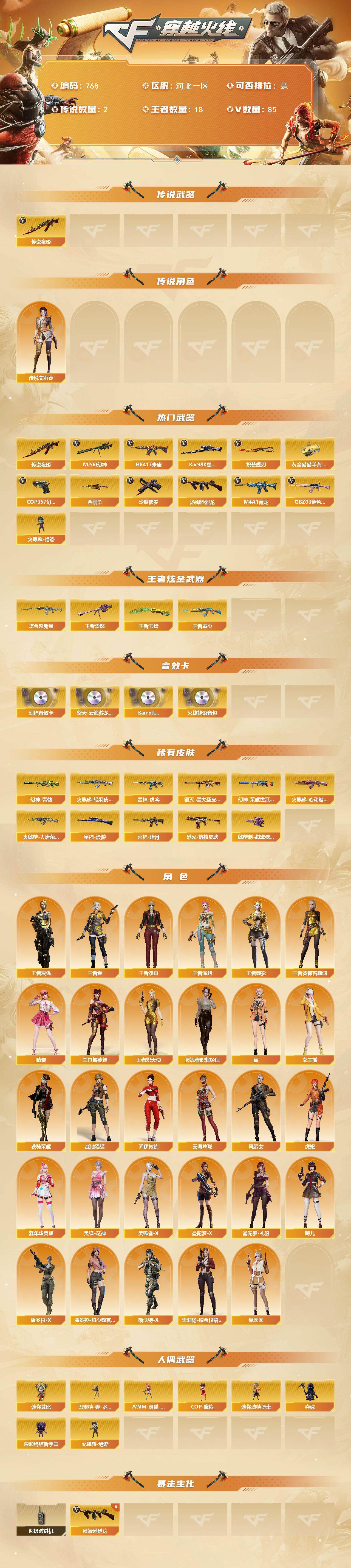 [14415202]河北一区-85v-18王者-1炫金 【传说武器】:传说夜影 【传说角色】:传说艾莉莎 【热门武器】:传说夜影,q03-金色蔷薇,hk417-朱雀,m4a1-青龙,m200-幻神,kar98k-星神,汤姆逊-烈龙8,火麒麟-绝迹,cop 357-幻灵,沙鹰-修罗5,炽芒蝶刃,黄金猫猫手套-白鲨,金刚伞 【王者炫金武器】:王者霜心,王者雷怒,王者玉锋2,炫金超新星 【音效卡】:擎天-云海游龙音效卡,m200-幻神音效卡,barrett-碧霄极光音效卡2,火线妹语音包 【皮肤】:幻神-青鹤,m200-幻神-荣耀世冠白鲨,星神-漫游,雷神-暗月,雷神-虎将,火麒麟-轻羽皮肤,火麒麟-大唐荣光,火麒麟-心动糖果,毁灭-黑大圣皮肤,烈火-熔核皮肤,麒麟刺-甜蜜糖果 皮肤 【角色】:兰-巾帼英雄,晴雅,战地猎狐,王者葵-惊若翩鸿,王者复仇,王者春,王者凌霄,王者涂鸦,王者-魅影,王者炽天使,乔伊教练,云海玲珑,风暴女,虎妞,嘉年华灵狐,灵狐-花神,灵狐者-x,灵狐者-职业经理,曼陀罗-x,曼陀罗-礼服,萌儿,女主播,潘多拉-x,潘多拉-甜心教官,斯沃特-x,铁骑荣耀,兔囡囡,雪莉杨-摸金校尉,幽 【人偶武器】:火麒麟-绝迹,芭蕾特-零-水下丽影,awm-灵狐-15周年嘉年华,cop-旗袍,迷你波特博士,夺魂,深渊终结者手蕾,迷你艾比 【暴走生化】:超级对讲机 【挑战大师】:冰龙粉碎者-白马银呛,激光毁灭者iii-白马银呛 【英雄级武器】:m4a1-千变,ak47-火麒麟,m4a1-黑龙,m4a1-雷神,ak47-机械迷城,m4a1-青龙,hk417-朱雀,q03-天罚,m4a1-神工天巧,无影-神兵利器,q03-金色蔷薇,烈火-动感闪耀,王者之鲨-觉醒版,王者炎心-觉醒版,王者火魄-觉醒版,q-03-王者蔷薇-觉醒版,白虎之魄-觉醒版,barrett-毁灭,barrett-极光,m200-幻神,kar98k-星神,王者森决-觉醒版,汤姆逊-烈龙8,烈龙-云海游龙,aa-12-雷霆,沙鹰-修罗5,cop 357-幻灵,usp-神工天巧3,天神-动感闪耀,擎天,麒麟刺4,幻灵之锋,炽芒蝶刃,唐刀-神工天巧,屠龙-动感闪耀,擎天-云海游龙,王者之锋-觉醒版,高爆手蕾-幻灵,高爆手蕾-神工天巧9,手蕾-动感闪耀,手蕾-云海游龙,闪光丹-幻灵,闪光丹-神