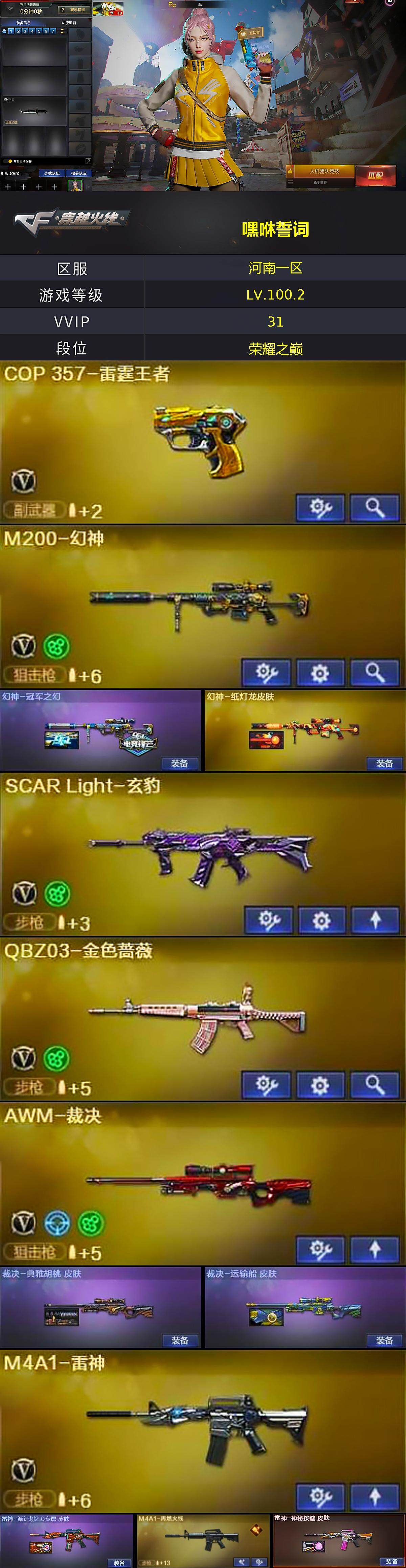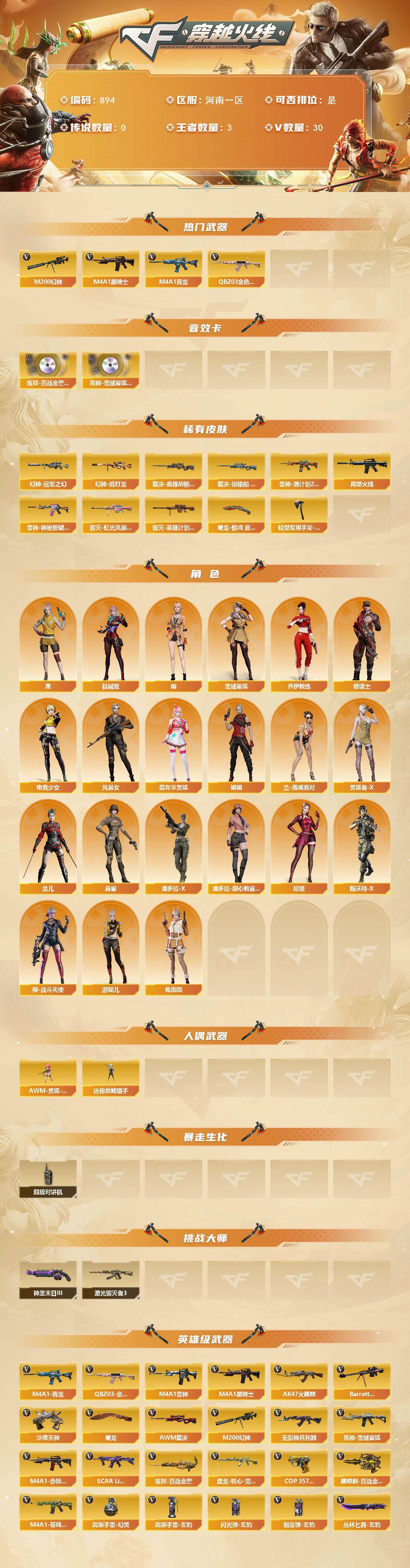 河南一区-30v-3王者-0炫金 【热门武器】:q03-金色蔷薇,m4a1-青龙,m200-幻神,m4a1-黑骑士 【音效卡】:炼狱-百战金芒-庆典舞曲音效卡,死神-雪域霜狐-怀旧音效卡 【皮肤】:幻神-冠军之幻,幻神-纸灯龙皮肤,裁决-典雅胡桃 皮肤,裁决-运输船 皮肤,雷神-源计划2.0专属 皮肤,m4a1-再燃火线,雷神-神秘按键 皮肤,毁灭-虹光风暴 皮肤,毁灭-英雄计划 皮肤,屠