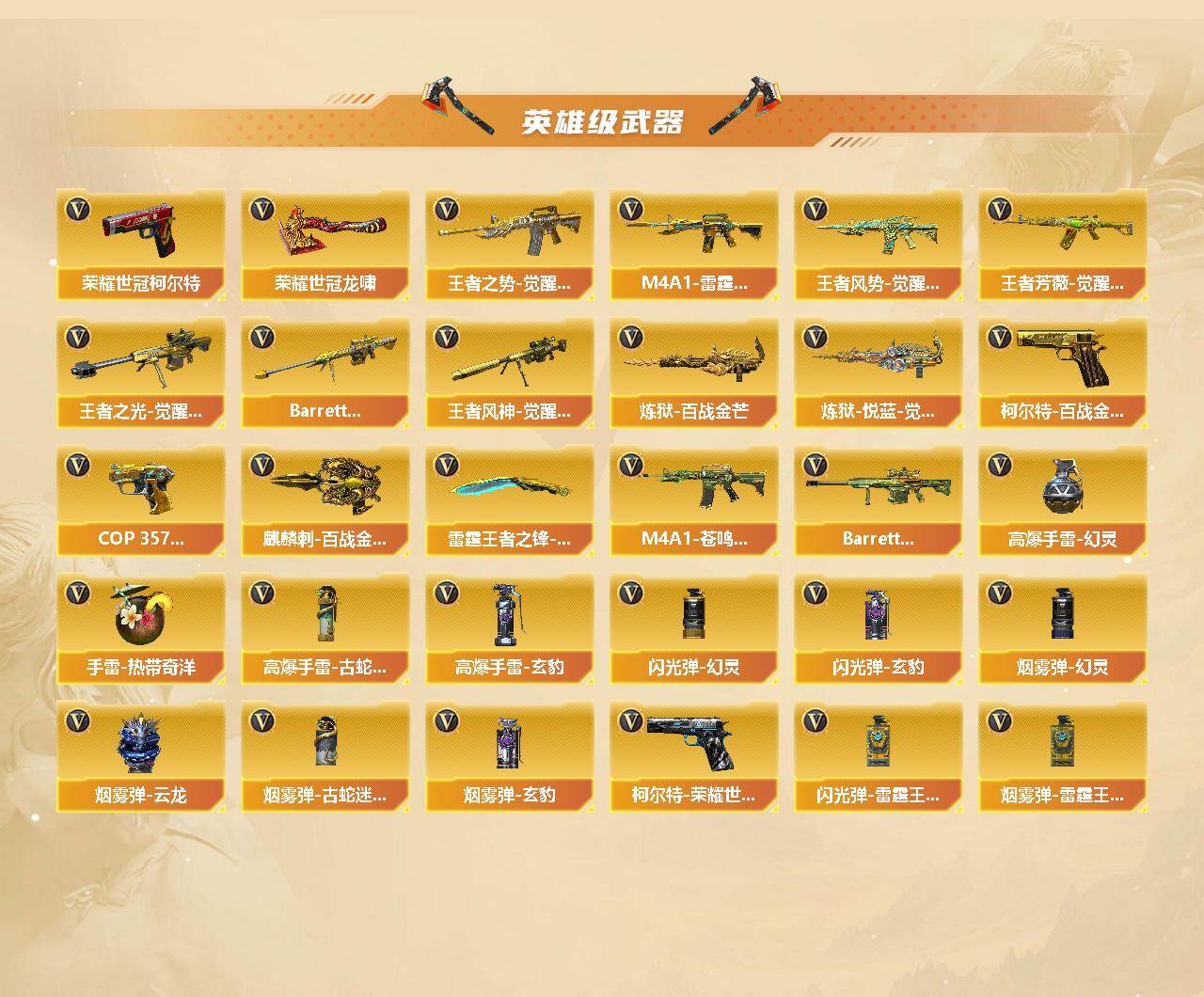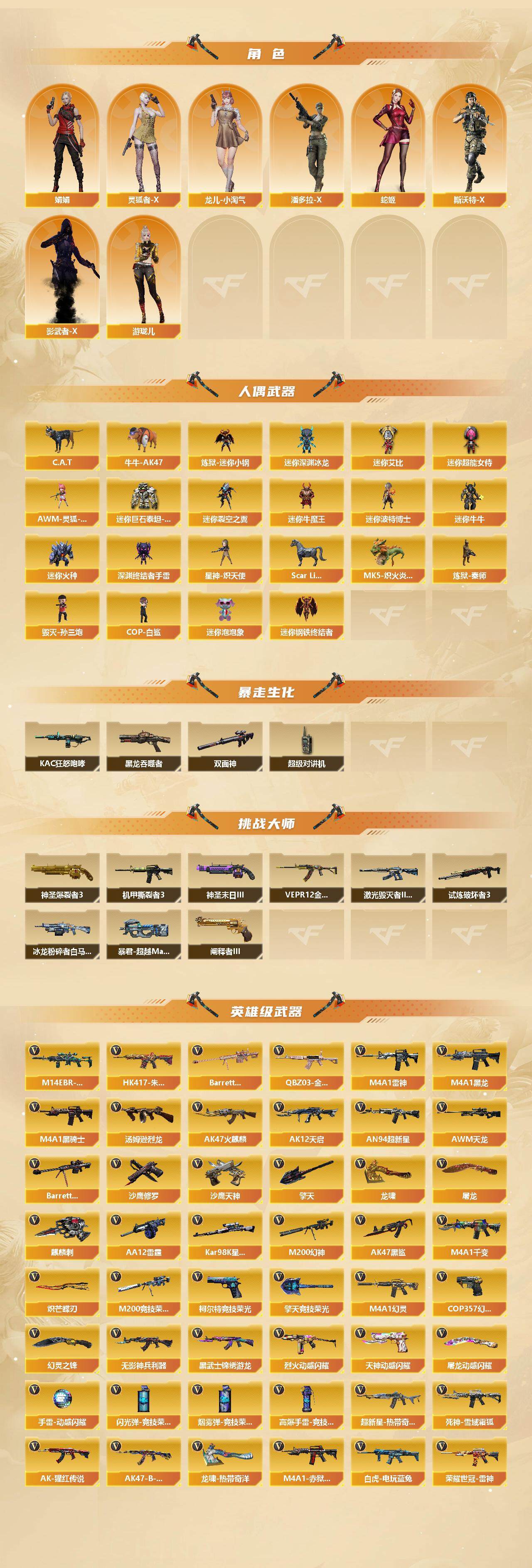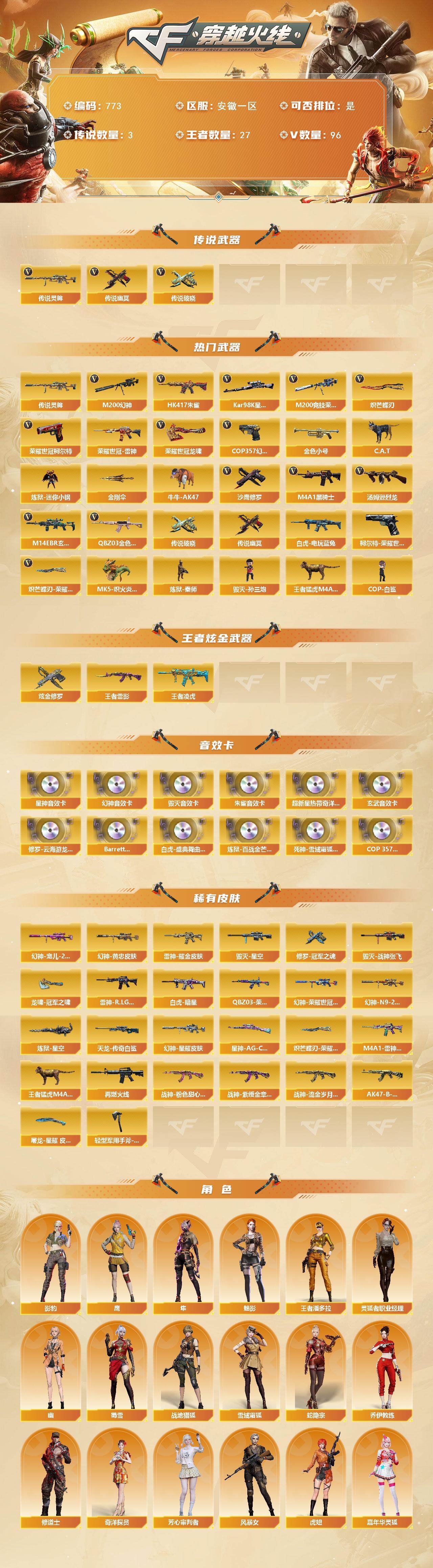 [14415633]安徽一区-96v-27王者-1炫金 【传说武器】:传说灵眸,传说破晓,传说幽冥 【热门武器】:传说灵眸,传说破晓,传说幽冥,q03-金色蔷薇,m14ebr-玄武,hk417-朱雀,m200-幻神,柯尔特-荣耀世冠白鲨2023,m200-竞技荣光,荣耀世冠-雷神,白虎-电玩蓝兔,荣耀世冠-柯尔特,kar98k-星神,金色小号,c.a.t,炼狱-迷你小钢,牛牛-ak47,m4a1-黑骑士2,汤姆逊-烈龙3,mk5-炽火炎龙,炼狱-秦师,毁灭-孙三炮,王者猛虎m4a1,cop-白鲨,cop 357-幻灵,沙鹰-修罗5,炽芒蝶刃,炽芒蝶刃-荣耀世冠白鲨2023 皮肤,荣耀世冠-龙啸,金刚伞 【王者炫金武器】:王者雷影,王者凌虎,炫金修罗 【音效卡】:修罗-云海游龙音效卡,an94-超新星-热带奇洋音效卡,m200-幻神音效卡,barrett-毁灭音效卡,kar98k-星神音效卡,hk417-朱雀音效卡,m14ebr-玄武音效卡,barrett-碧霄极光音效卡,白虎-盛典舞曲音效卡,炼狱-百战金芒-庆典舞曲音效卡,死神-雪域霜狐-怀旧音效卡,cop 357-雪域霜狐-怀旧音效卡 【皮肤】:m200-幻神-黄忠皮肤,幻神-宠儿-2021mvp,m200-幻神-荣耀世冠白鲨,m200-幻神-n9-2022mvp,幻神-星耀 皮肤,scar light-白虎-暗星,q03-荣耀世冠白鲨,kar98k-星神-ag-cfpls21冠军皮肤,雷神-耀金皮肤,雷神-r.lgd-cfpls18冠军2,m4a1-雷神-巅峰荣耀皮肤,王者猛虎m4a1,m4a1-再燃火线,毁灭-星空,毁灭-战神张飞,战神-粉色甜心皮肤2,战神-紫绶金章皮肤,战神-流金岁月皮肤,ak47-b-常胜将军-孙权,awm-天龙-传奇白鲨,炼狱-星空,修罗-冠军之魂,屠龙-星耀 皮肤,龙啸-冠军之啸,轻型军用手斧-再燃火线,炽芒蝶刃-荣耀世冠白鲨2023 皮肤 【角色】:魅影,影豹,鹰,隼,战地猎狐,王者潘多拉,雪域霜狐,蛇隐宗,奇洋探员,乔伊教练,修道士,芳心审判者,风暴女,虎妞,嘉年华灵狐,娟娟,灵狐者-x,灵狐者-职业经理,龙儿-小淘气,潘多拉-x,蛇姬,斯沃特-x,蜀雪,影武者-x,幽,游珑儿 【人偶武器】:炼狱-秦师,cop-白鲨,毁灭-孙三炮,星神-炽天使,炼狱-迷你小钢,迷你钢铁终结者,m