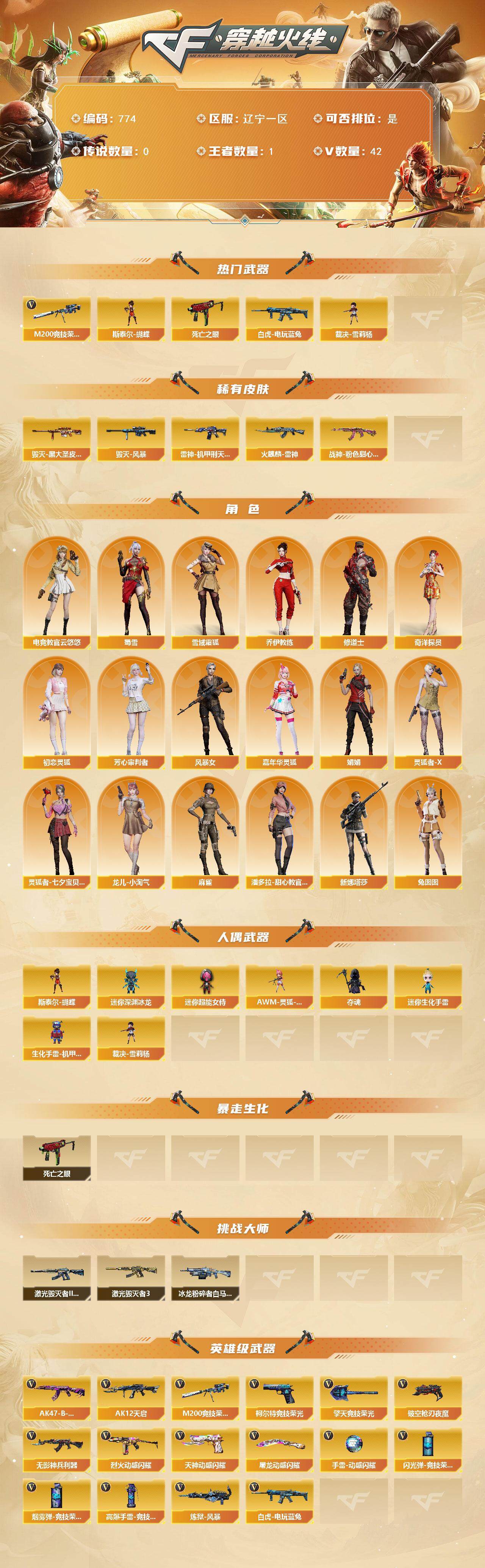 [14415661]辽宁一区-42v-1王者-0炫金 【热门武器】:m200-竞技荣光,死亡之眼,白虎-电玩蓝兔,斯泰尔-蝴蝶,裁决-雪莉杨 【皮肤】:雷神-机甲刑天皮肤,火麒麟-雷神,毁灭-黑大圣皮肤,毁灭-风暴2,战神-粉色甜心皮肤 【角色】:电竞教官-云悠悠,雪域霜狐,奇洋探员,乔伊教练,修道士,初恋灵狐,芳心审判者,风暴女,嘉年华灵狐,娟娟,灵狐者-x,灵狐者-七夕宝贝,龙儿-小淘气,麻雀,潘多拉-甜心教官,蜀雪,兔囡囡,新娜塔莎 【人偶武器】:裁决-雪莉杨,斯泰尔-蝴蝶,awm-灵狐-15周年嘉年华,迷你深渊冰龙,夺魂,迷你生化手蕾,生化手蕾-机甲核心,迷你超能女侍 【暴走生化】:死亡之眼 【挑战大师】:冰龙粉碎者-白马银呛,激光毁灭者iii-白马银呛2,激光毁灭者iii 【英雄级武器】:ak12-天启,无影-神兵利器,烈火-动感闪耀,ak47-b-常胜将军,白虎-电玩蓝兔,m200-竞技荣光,炼狱-风暴,柯尔特-竞技荣光,破空呛刃-夜魔,天神-动感闪耀,擎天-竞技荣光,屠龙-动感闪耀,高爆手蕾-竞技荣光8,手蕾-动感闪耀,闪光丹-竞技荣光10,盐雾蛋-竞技荣光9 【道具】:炫彩背包,背包-洛丽塔,虎牙炫彩背包,超级背包,救世主-黑桃战神,绿色巨人,灵魂忍者,变异宝贝,妖姬,迷雾幽灵,生化弹匣,夺命之镰,防化服3,金色流光-呛王排位2,星辰流光-呛王排位,呛王排位28赛季金色流光,语音特效-怀旧,电玩兔兔表情,动感闪耀表情,防弹头盔3,防弹衣3,c4工具钳3,手蕾包3 【特殊呛械】:蝴蝶斯泰尔0烈龙,1蝴蝶斯泰尔