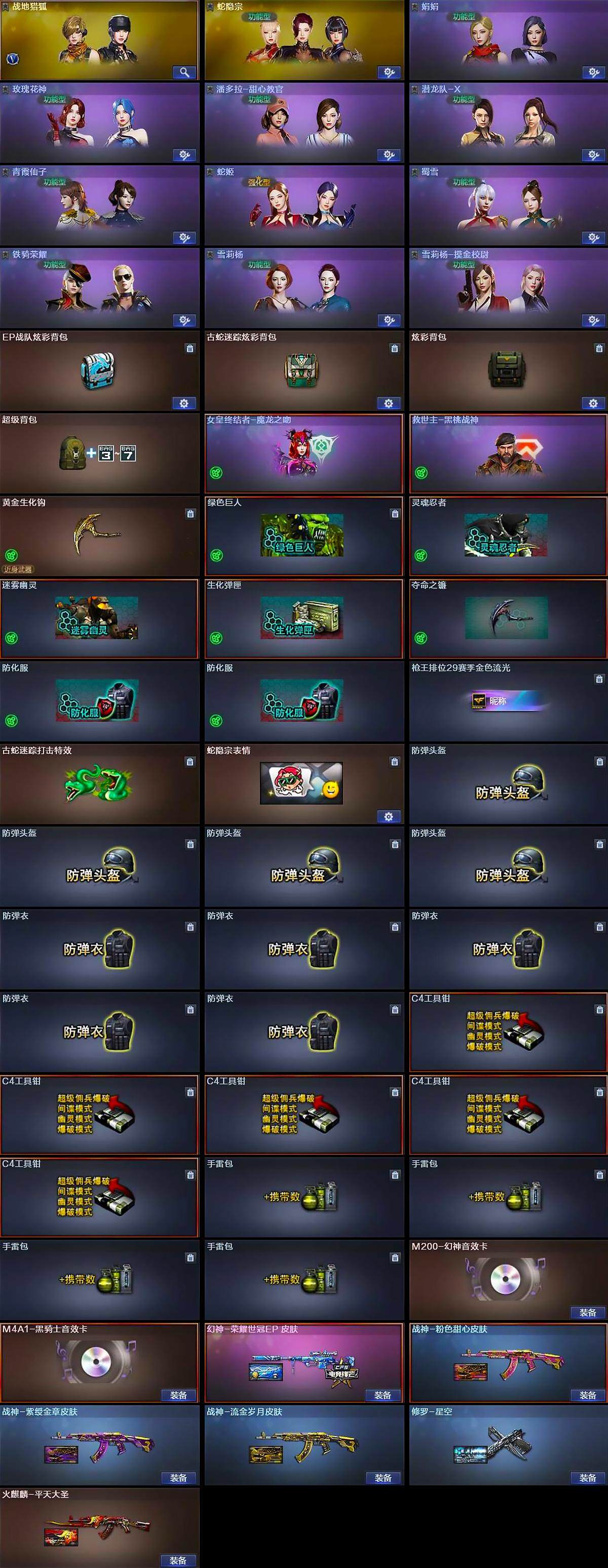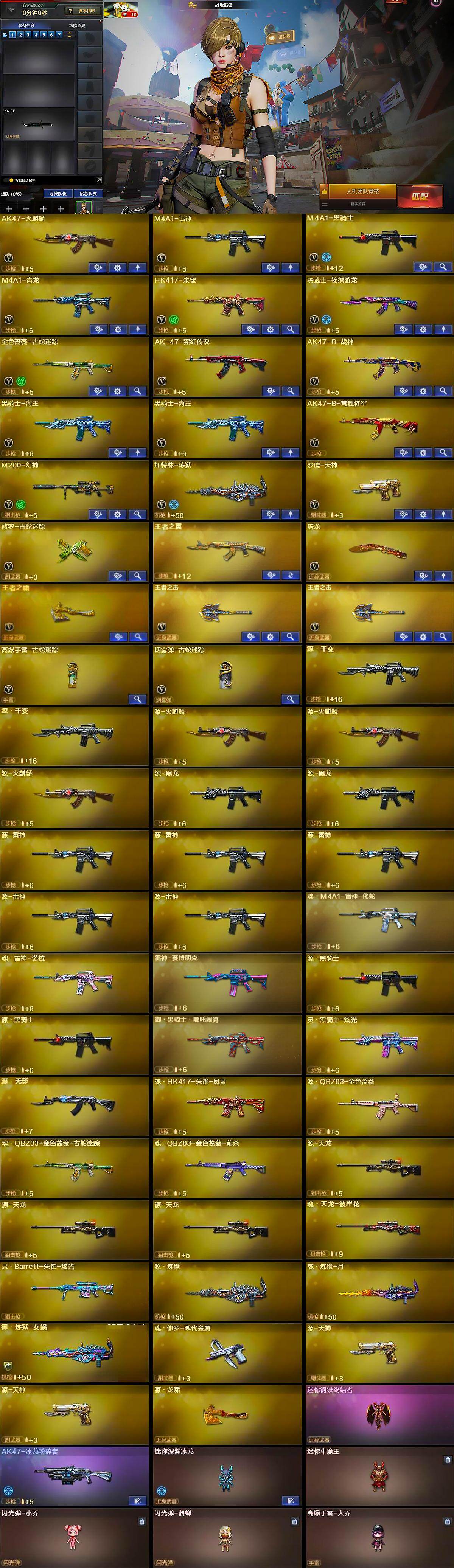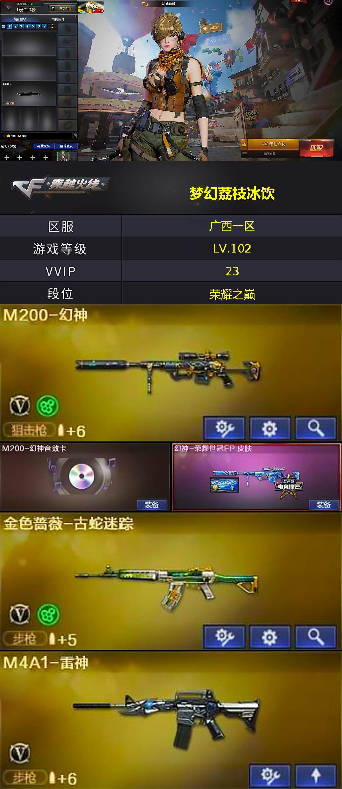广西一区-20v-5王者-0炫金 【热门武器】:hk417-朱雀,m4a1-青龙,m200-幻神,金色蔷薇-古蛇迷踪,修罗-古蛇迷踪,m4a1-黑骑士,加特林-炼狱 【王者炫金武器】:王者之翼 【音效卡】:m200-幻神音效卡,m4a1-黑骑士音效卡 【皮肤】:幻神-荣耀世冠ep 皮肤,火麒麟-平天大圣,战神-粉色甜心皮肤,战神-紫绶金章皮肤,战神-流金岁月皮肤,ak47-b-常胜将军-曹操,ak47-b-常胜将军-刘备,ak47-b-常胜将军-孙权,修罗-星空 【角色】:战地猎狐,蛇隐宗,娟娟,兰-新年限定,玫瑰花神,潘多拉-甜心教官,潜龙队-x,青霞仙子,蛇姬,蜀雪,铁骑荣耀,雪莉杨,雪莉杨-摸金校尉,智影 【人偶武器】:迷你钢铁终结者,迷你深渊冰龙,迷你牛魔王,闪光丹-小乔,闪光丹-貂蝉,高爆手蕾-大乔 【挑战大师】:ak47-冰龙粉碎者 【英雄级武器】:ak47-火麒麟,m4a1-雷神,m4a1-黑骑士,m4a1-青龙,hk417-朱雀,黑武士-锦绣游龙,金色蔷薇-古蛇迷踪,ak-47-猩红传说,ak47-b-战神,黑骑士-海王2,ak47-b-常胜将军,m200-幻神,加特林-炼狱,沙鹰-天神,修罗-古蛇迷踪,屠龙,王者之啸-觉醒版,王者之击-觉醒版2,高爆手蕾-古蛇迷踪,盐雾蛋-古蛇迷踪,盐雾蛋-荣耀世冠ep 【道具】:ep战队炫彩背包,古蛇迷踪炫彩背包,炫彩背包,超级背包,女皇终结者-魔龙之吻,救世主-黑桃战神,黄金生化钩,绿色巨人,灵魂忍者,迷雾幽灵,生化弹匣,夺命之镰,防化服2,呛王排位29赛季金色流光,古蛇迷踪打击特效,蛇隐宗表情,防弹头盔4,防弹衣5,c4工具钳5,手蕾包4 【特殊呛械】:1黑骑士,1炼狱