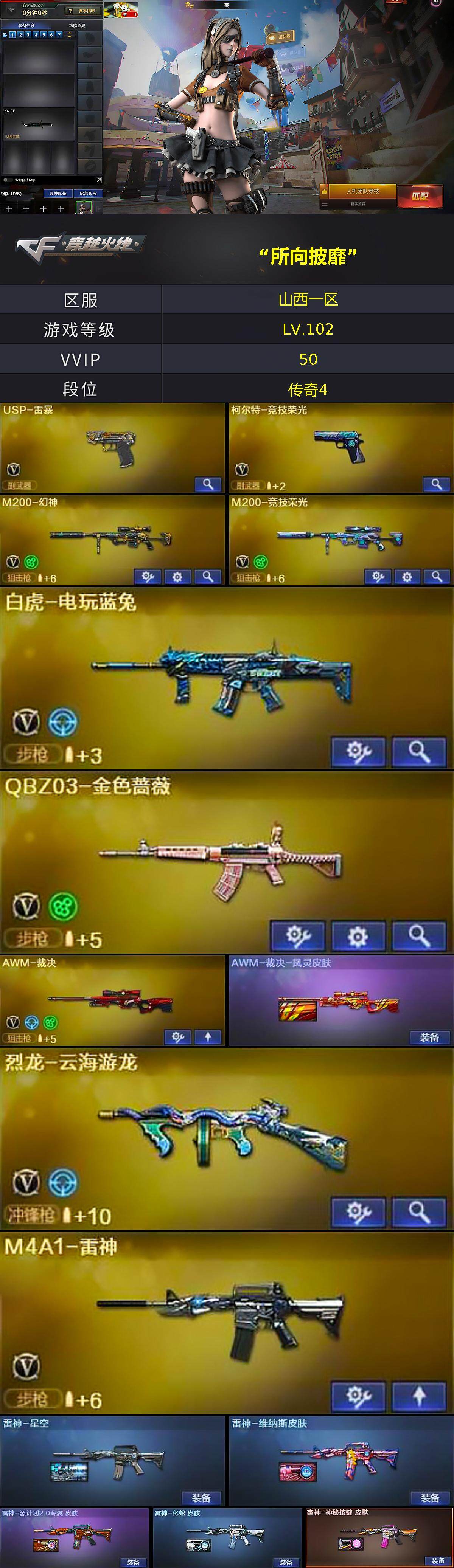 山西一区-46v-2王者-0炫金 【热门武器】:q03-金色蔷薇,m200-幻神,m200-竞技荣光,死亡之眼,白虎-电玩蓝兔,usp-雷暴 【音效卡】:barrett-碧霄极光音效卡,awm-昌龙-怀旧音效卡 【皮肤】:awm-裁决-凤灵皮肤,雷神-星空,雷神-维纳斯皮肤,雷神-源计划2.0专属 皮肤,雷神-化蛇 皮肤,雷神-神秘按键 皮肤,火麒麟-雷神2,火麒麟-平天大圣,毁灭-航天
