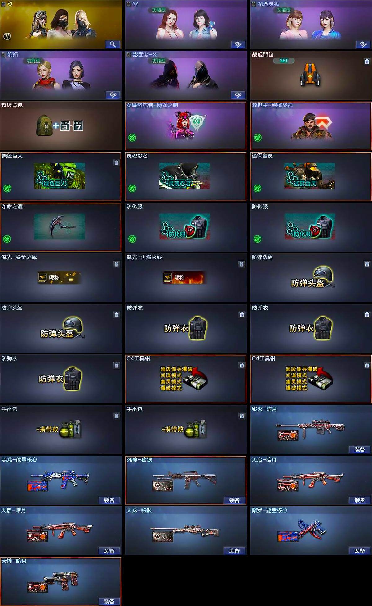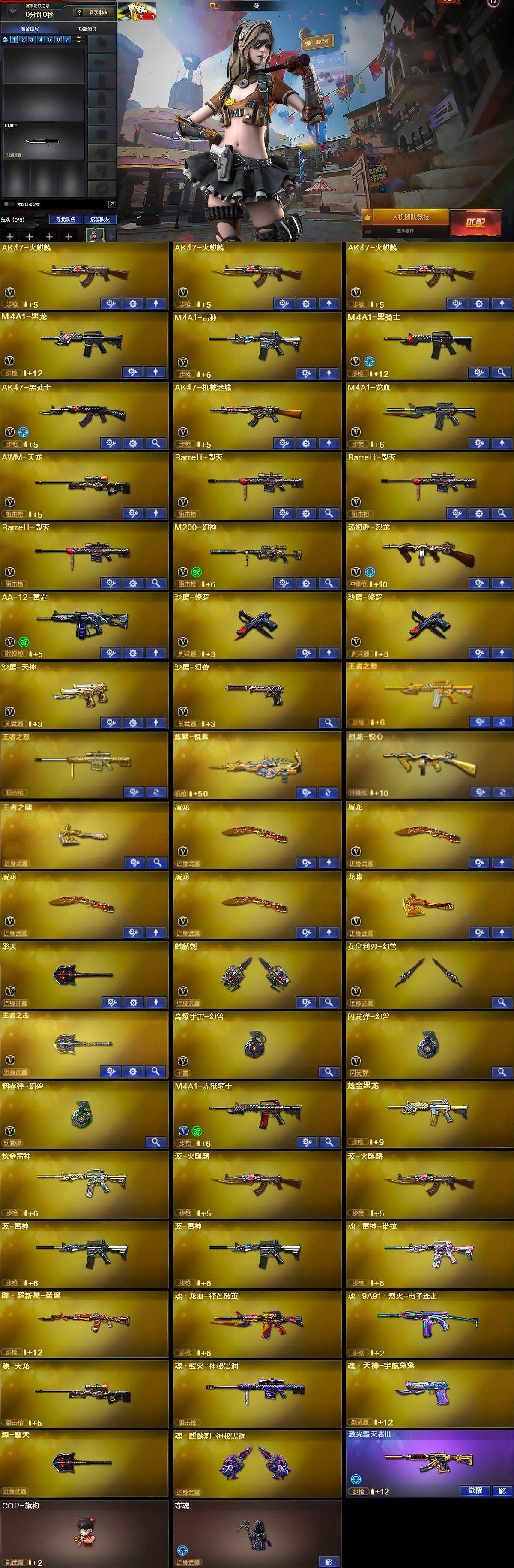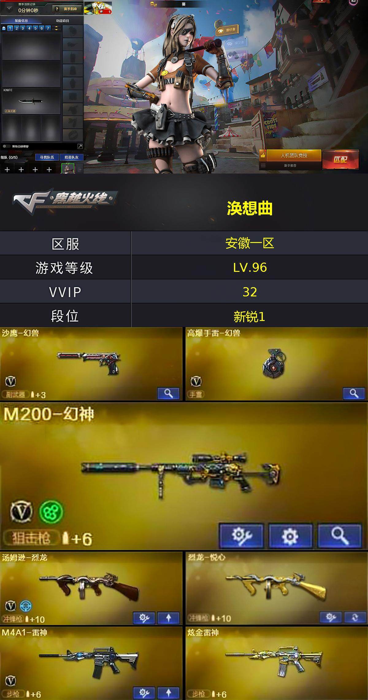 安徽一区-32v-6王者-2炫金 【热门武器】:m200-幻神,m4a1-黑骑士,汤姆逊-烈龙,沙鹰-修罗2,高爆手蕾-幻兽 【王者炫金武器】:王者之势,王者之怒,炼狱-悦蓝,烈龙-悦心,王者之啸,炫金黑龙,炫金雷神 【皮肤】:毁灭-暗月,黑龙-能量核心,死神-秘银,天启-暗月2,天龙-秘银,修罗-能量核心,天神-暗月 【角色】:葵,空,初恋灵狐,娟娟,兔囡囡,影武者-x 【人偶武器】:c