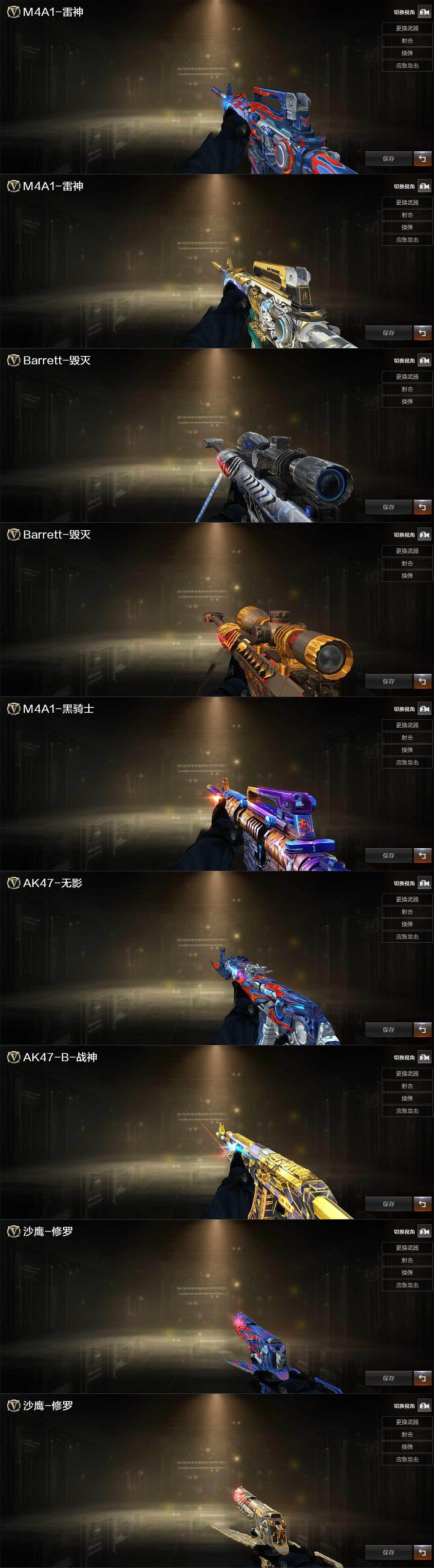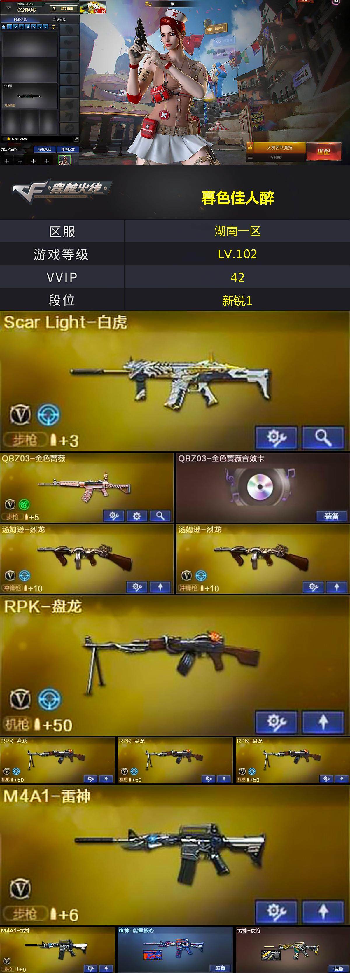 湖南一区-42v-3王者-2炫金 【热门武器】:q03-金色蔷薇,scar light-白虎,m4a1-黑骑士4,汤姆逊-烈龙2,rpk-盘龙4,加特林-炼狱2,沙鹰-修罗3 【王者炫金武器】:王者之戮,王者之影,炫金武士,炫金修罗 【皮肤】:雷神-能量核心,雷神-虎将,毁灭-星空,毁灭-英雄计划 皮肤,黑骑士-破浪10年皮肤,无影-能量核心,战神-流金岁月皮肤,修罗-能量核心,