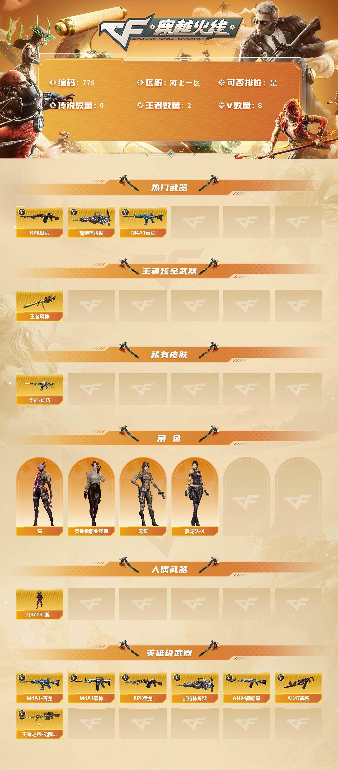 [14423646]河北一区-8v-2王者-0炫金 【热门武器】:m4a1-青龙,rpk-盘龙,加特林-炼狱 【王者炫金武器】:王者风神 【皮肤】:雷神-虎将 【角色】:隼,灵狐者-职业经理,麻雀,潜龙队-x 【人偶武器】:q03-斯沃特 【英雄级武器】:m4a1-雷神,an94-超新星,ak47-黑鲨,m4a1-青龙,王者之怒-觉醒版,rpk-盘龙,加特林-炼狱 【道具】:绿色巨人,灵魂忍者,变异宝贝,迷雾幽灵,夺命之镰,防化服2,金色流光-呛王排位,星辰流光-呛王排位,呛王排位28赛季金色流光,防弹头盔2,防弹衣2,c4工具钳2,手蕾包2 【特殊呛械】:1盘龙,1炼狱