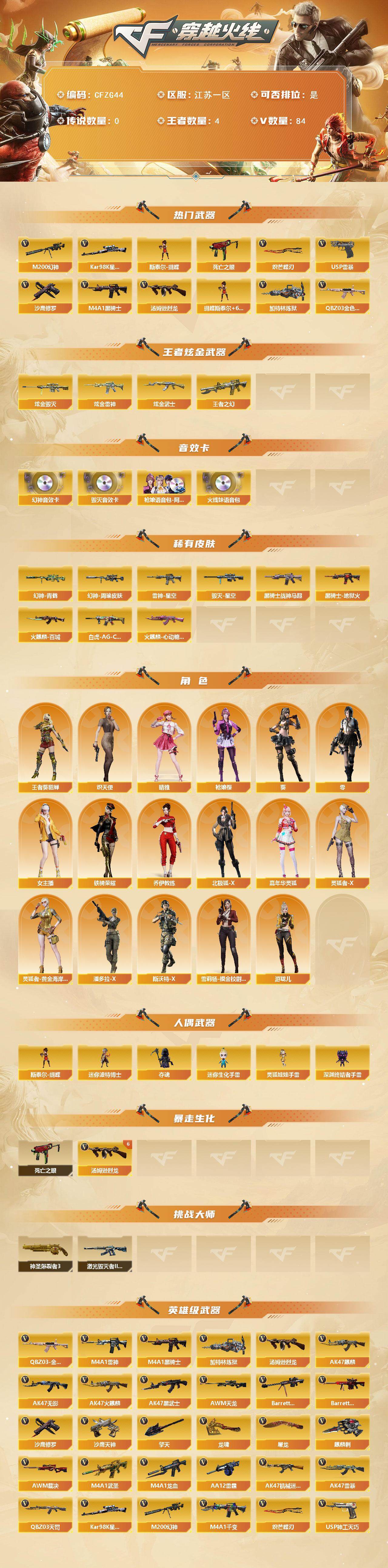 【cfzg44】80v/102级/荣耀元首/4王者/3炫金/4英雄/q03-金色蔷薇/m200-幻神/死亡之眼/kar98k-星神/m4a1-黑骑士/汤姆逊-烈龙/加特林-炼狱/斯泰尔-蝴蝶/usp-雷暴/沙鹰-修罗/炽芒蝶刃/蝴蝶斯泰尔6烈龙/王者之幻/炫金雷神/炫金武士/炫金毁灭/m200-幻神音效卡/barrett-毁灭音效卡/呛娘语音包-阿敏/火线妹语音包/幻神-周瑜皮肤/幻神-青鹤/白虎-ag-cfpls20冠军/雷神-星空/火麒麟-百城/火麒麟-心动糖果/毁灭-星空/黑骑士-地狱火/黑骑士-战神马超/零/葵/呛娘樱/晴雅/王者-葵-貂蝉/乔伊教练/炽天使/北极狐-x/嘉年华灵狐/灵狐者-x/灵狐者-黄金海岸/女主播/潘多拉-x/斯沃特-x/铁骑荣耀/雪莉杨-摸金校尉/游珑儿/迷你波特博士/夺魂/迷你生化手蕾/深渊终结者手蕾/灵狐娃娃手蕾/6烈龙/神圣爆裂者iii/激光毁灭者iii-白马银呛/m4a1-千变/ak47-火麒麟/ak47-麒麟/m4a1-雷神/ak47-无影/ak47-黑武士/m4a1-武圣/ak47-机械迷城/m4a1-龙血/ak47-雷暴/q03-天罚/无影-神兵利器/烈火-动感闪耀/王者之心-觉醒版/awm-天龙/barrett-毁灭/barrett-极光/awm-裁决/王者之怒-觉醒版/aa-12-雷霆/沙鹰-天神/usp-神工天巧/glock18-武圣/天神-动感闪耀/屠龙/龙啸/擎天/麒麟刺/唐刀-神工天巧/屠龙-动感闪耀/斩神刀-雷暴/高爆手蕾-雷暴/高爆手蕾-神工天巧/手蕾-动感闪耀/闪光丹-雷暴/闪光丹-神工天巧/盐雾蛋-雷暴/盐雾蛋-神工天巧/q9战队炫彩背包/全能呛王背包/炫彩背包/虎牙炫彩背包/超级背包/绿色巨人/灵魂忍者/迷雾幽灵/夺命之镰/防化服/金色流光-呛王排位/星辰流光-呛王排位/呛王排位28赛季金色流光/动感闪耀表情/ep战队收纳包/c4-沙漠/防弹头盔/防弹衣/c4工具钳/手蕾包