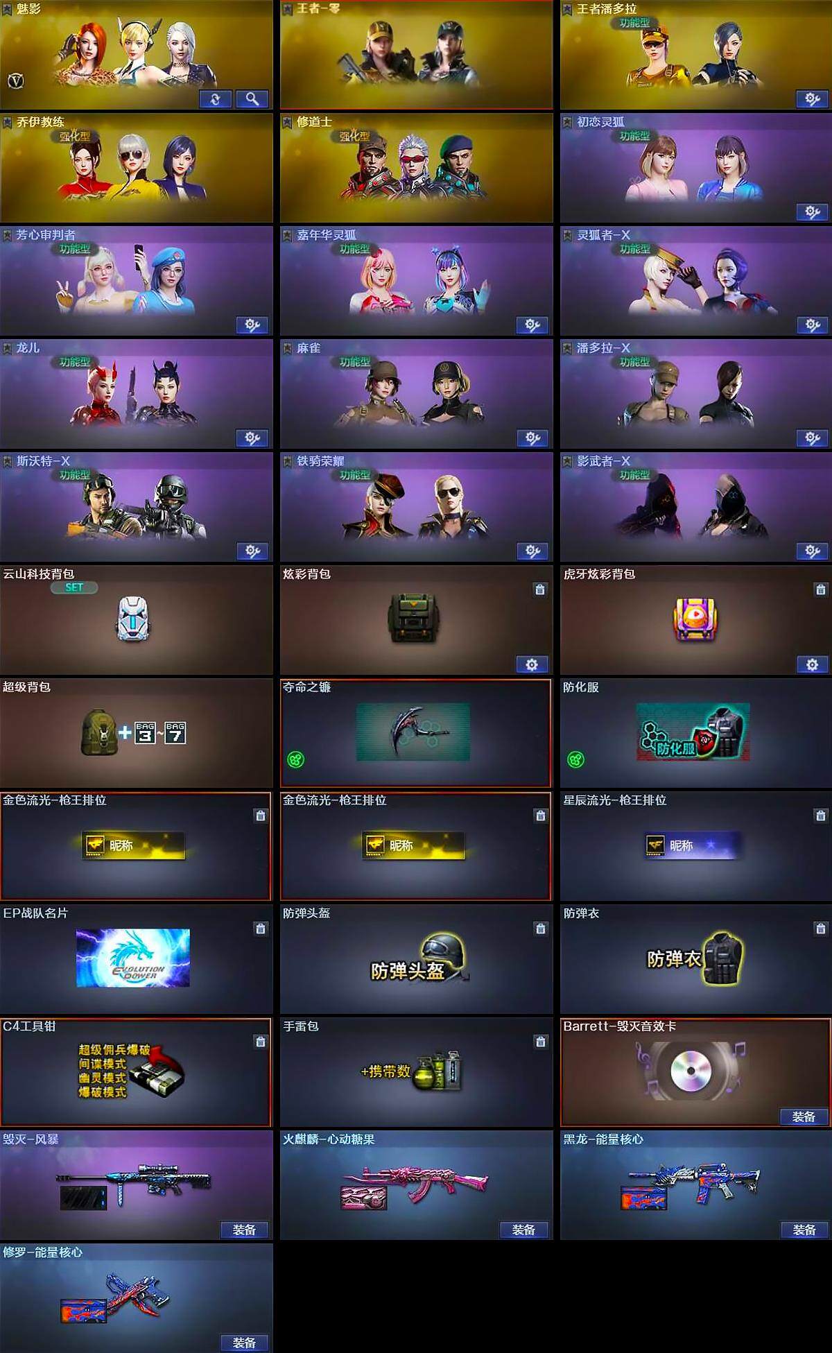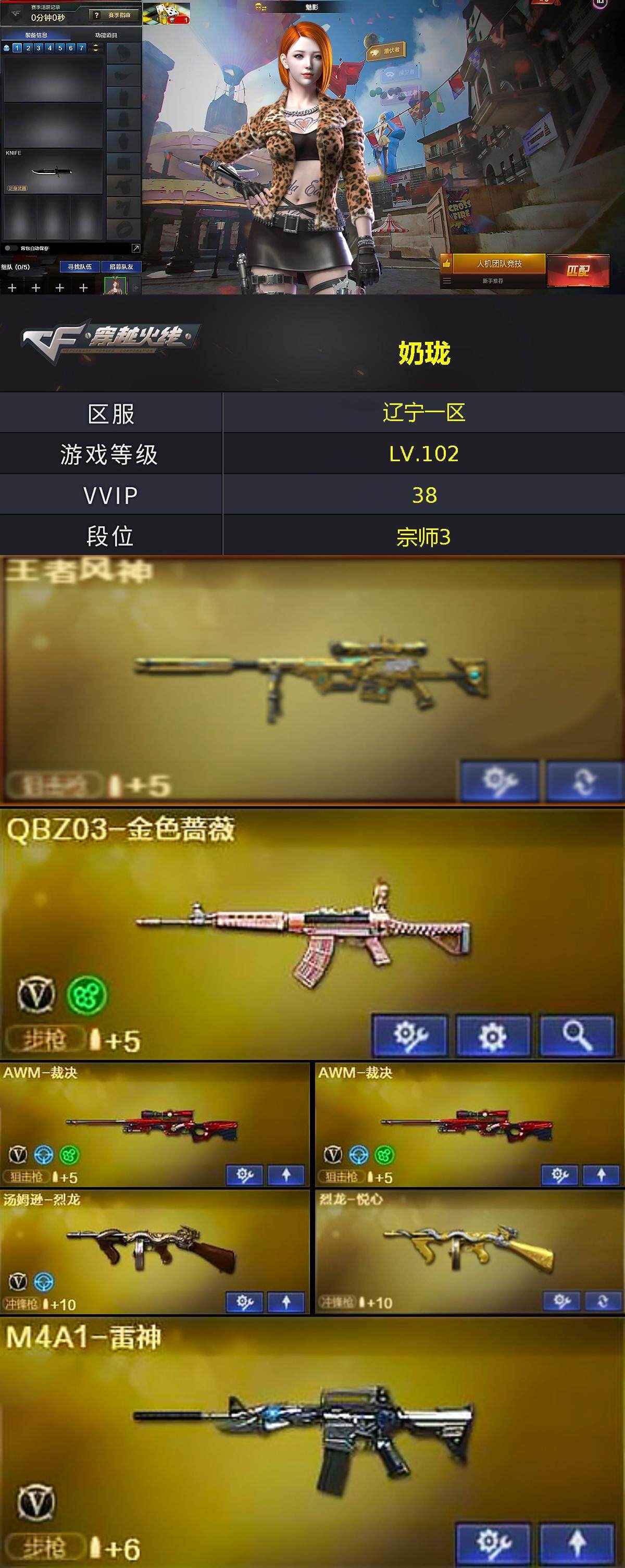 辽宁一区-38v-7王者-6炫金 【热门武器】:q03-金色蔷薇,死亡之眼,m4a1-黑骑士,汤姆逊-烈龙,沙鹰-修罗3 【王者炫金武器】:天启-悦智,王者风神,烈龙-悦心,王者之啸,炫金骑士,炫金武士2,炫金天龙,炫金天神,炫金修罗 【音效卡】:barrett-毁灭音效卡 【皮肤】:火麒麟