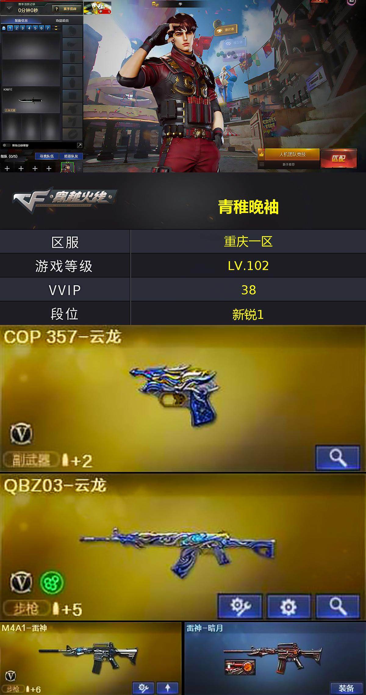 重庆一区-35v-0王者-0炫金 【热门武器】:mk5-炽火炎龙 【皮肤】:雷神-暗月,火麒麟-雷神,火麒麟-心动糖果 【角色】:华,奇洋探员,乔伊教练,暗夜-x,北极狐-x,电竞少女,芳心审判者,飞虎队-x,风暴女,虎妞,嘉年华灵狐,娟娟,猎狐者-追月,0号玩家,灵狐-花神,麻雀,曼陀罗-x,曼陀