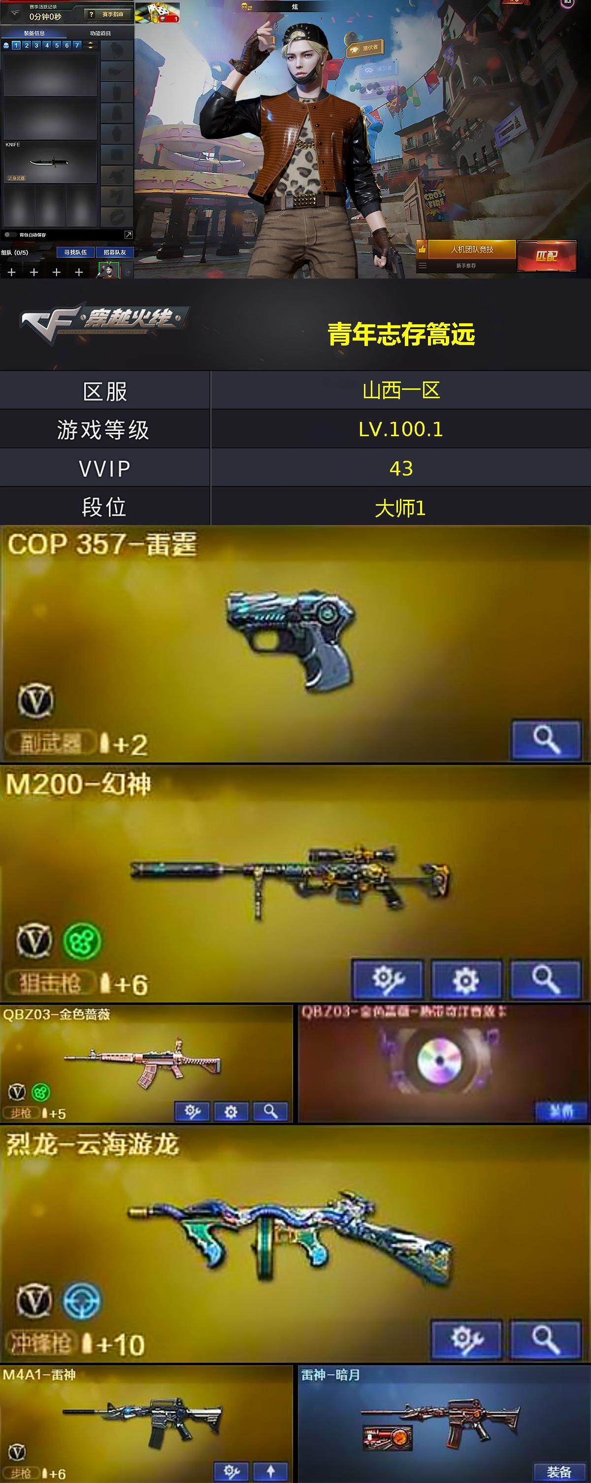 山西一区-40v-0王者-1炫金 【热门武器】:q03-金色蔷薇,m200-幻神,m4a1-黑骑士,沙鹰-修罗 【王者炫金武器】:炫金毁灭 【音效卡】:q03-金色蔷薇-热带奇洋音效卡,m4a1-黑骑士音效卡 【皮肤】:雷神-暗月,火麒麟-心动糖果,黑龙-暗月,黑骑士-破界 皮肤,无影-能量