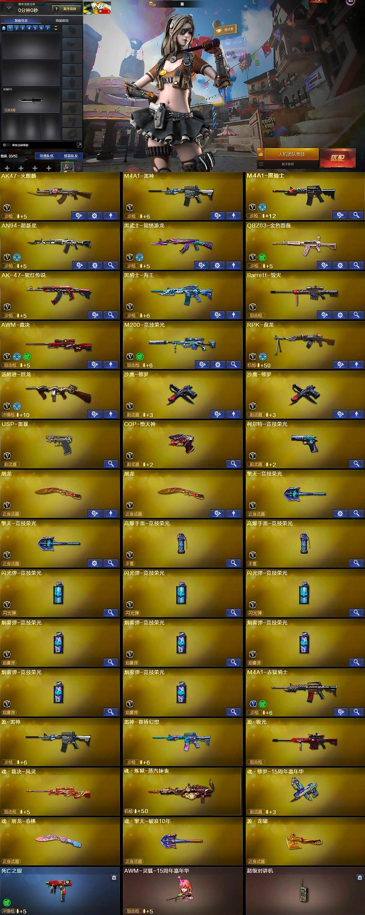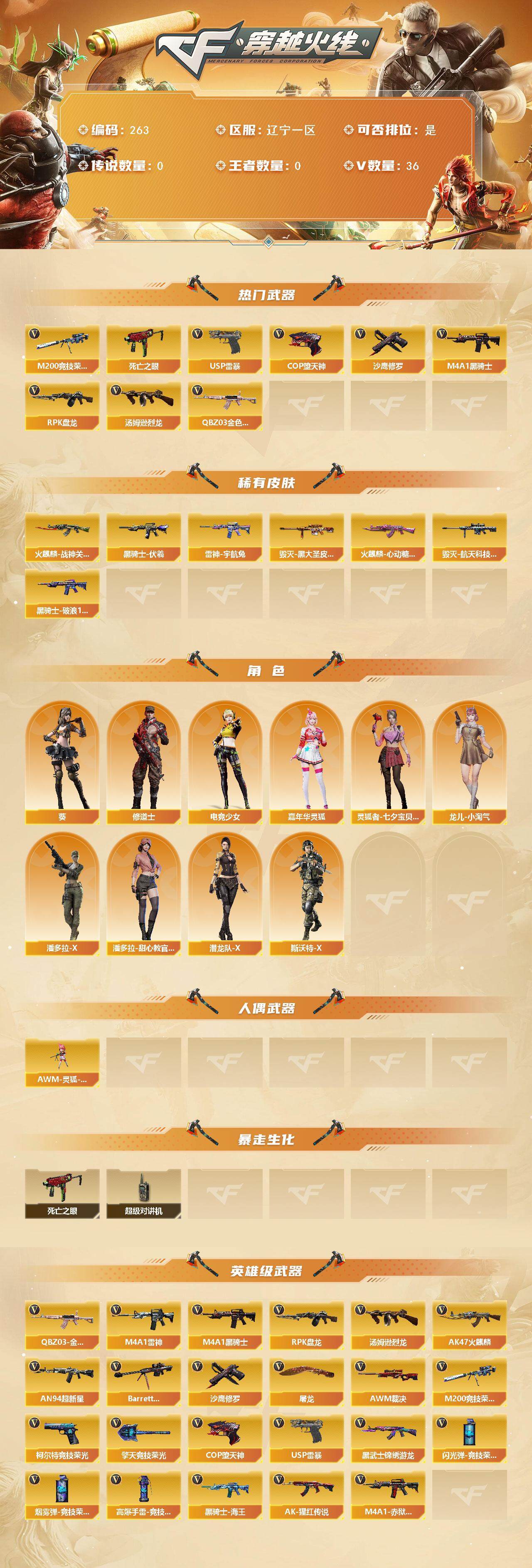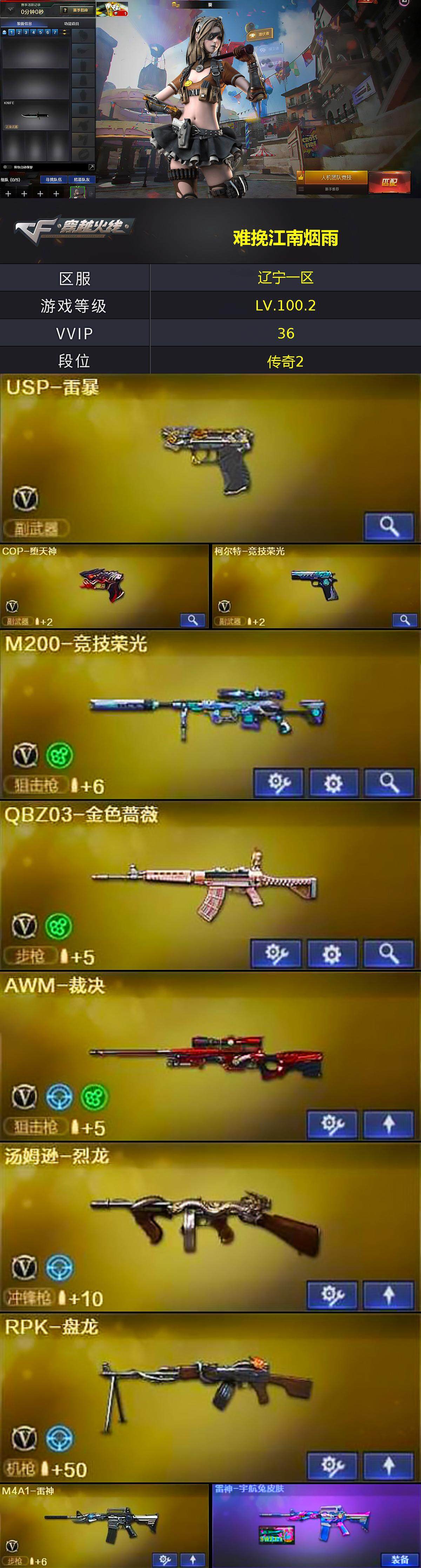 辽宁一区-36v-0王者-0炫金 【热门武器】:q03-金色蔷薇,m200-竞技荣光,死亡之眼,m4a1-黑骑士,汤姆逊-烈龙,rpk-盘龙,usp-雷暴,cop-堕天神,沙鹰-修罗2 【皮肤】:雷神-宇航兔皮肤,火麒麟-战神关羽,火麒麟-心动糖果,毁灭-黑大圣皮肤,毁灭-航天科技皮肤,黑骑士