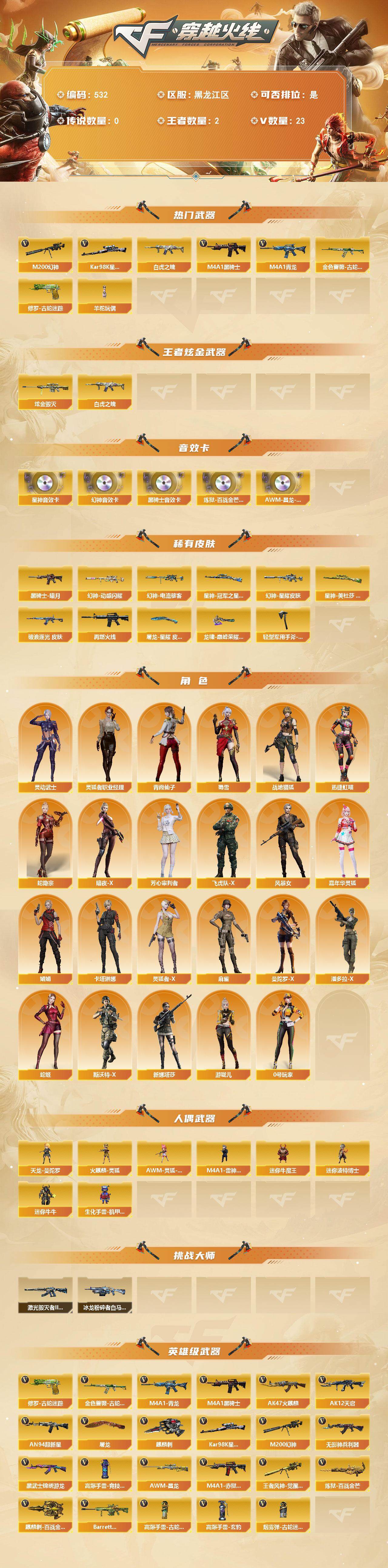 [14436983]黑龙江区-23v-2王者-1炫金 【热门武器】:m4a1-青龙,m200-幻神,金色蔷薇-古蛇迷踪,修罗-古蛇迷踪,白虎之魄,kar98k-星神,m4a1-黑骑士,羊驼玩偶 【王者炫金武器】:白虎之魄,炫金毁灭 【音效卡】:m200-幻神音效卡,m4a1-黑骑士音效卡,kar98k-星神音效卡,炼狱-百战金芒-庆典舞曲音效卡,awm-昌龙-怀旧音效卡 【皮肤】:幻神-星耀 皮肤,幻神-动感闪耀 皮肤,幻神-电流骇客 皮肤,金色蔷薇-破浪逐光 皮肤,kar98k-星神-冠军之星皮肤,星神-美杜莎 皮肤,m4a1-再燃火线,黑骑士-暗月,屠龙-星耀 皮肤,龙啸-巅峰荣耀 皮肤,轻型军用手斧-再燃火线 【角色】:迅捷虹喵,战地猎狐,蛇隐宗,暗夜-x,芳心审判者,飞虎队-x,风暴女,嘉年华灵狐,娟娟,卡塔琳娜,0号玩家,灵动武士,灵狐者-x,灵狐者-职业经理,麻雀,曼陀罗-x,潘多拉-x,青霞仙子,蛇姬,斯沃特-x,蜀雪,新娜塔莎,游珑儿 【人偶武器】:天龙-曼陀罗,火麒麟-灵狐,m4a1-雷神-精英刀锋,awm-灵狐-15周年嘉年华,迷你牛魔王,迷你波特博士,迷你牛牛,生化手蕾-机甲核心 【挑战大师】:冰龙粉碎者-白马银呛,激光毁灭者iii-白马银呛2 【英雄级武器】:ak47-火麒麟,m4a1-黑骑士,ak12-天启,an94-超新星,m4a1-青龙,无影-神兵利器,黑武士-锦绣游龙,金色蔷薇-古蛇迷踪,m200-幻神,kar98k-星神,王者风神-觉醒版,炼狱-百战金芒,修罗-古蛇迷踪,屠龙,麒麟刺,麒麟刺-百战金芒,高爆手蕾-竞技荣光,高爆手蕾-古蛇迷踪,高爆手蕾-玄豹,盐雾蛋-古蛇迷踪,m4a1-赤狱骑士,awm-昌龙,barrett-碧霄极光 【道具】:bs战队炫彩背包,cfs限定背包,全能呛王背包,古蛇迷踪炫彩背包,百战金芒炫彩背包,超级背包,女皇终结者-魔龙之吻,救世主-黑桃战神,绿色巨人,灵魂忍者,迷雾幽灵,夺命之镰,防化服3,金色流光-呛王排位2,星辰流光-呛王排位,流光-再燃火线,呛王排位28赛季金色流光,呛王排位29赛季金色流光,语音特效-盛典烟火,古蛇迷踪打击特效,蛇隐宗表情,萌萌小葵表情,ep战队名片,ep战队喷图,ep战队击杀图标,防弹头盔4,防弹衣4,c4工具钳4,手蕾包4 【特殊呛械】:1黑骑士