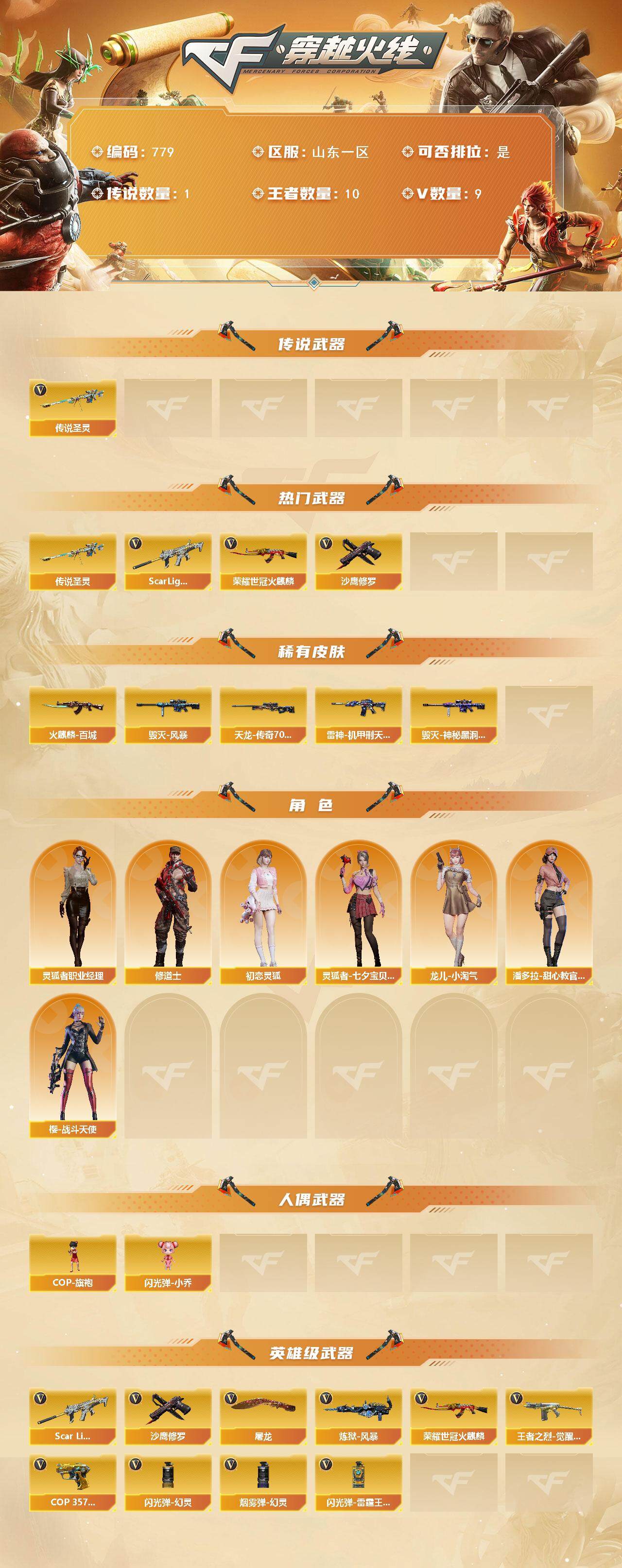 [14443838]山东一区-9v-10王者-0炫金 【传说武器】:传说圣灵 【热门武器】:传说圣灵,scar light-白虎,荣耀世冠-火麒麟,沙鹰-修罗3 【皮肤】:雷神-机甲刑天皮肤,火麒麟-百城,毁灭-风暴2,毁灭-神秘黑洞皮肤,awm-天龙-传奇70kg 【角色】:修道士,初恋灵狐,灵狐者-七夕宝贝,灵狐者-职业经理,龙儿-小淘气,潘多拉-甜心教官,樱-战斗天使 【人偶武器】:cop-旗袍,闪光丹-小乔 【英雄级武器】:scar light-白虎,王者之烈-觉醒版,荣耀世冠-火麒麟,炼狱-风暴,沙鹰-修罗3,cop 357-雷霆王者-觉醒版,屠龙,闪光丹-幻灵,闪光丹-雷霆王者-觉醒版,盐雾蛋-幻灵 【道具】:炫彩背包,超级背包,夺命之镰,防化服,呛王排位29赛季金色流光,防弹头盔,防弹衣,c4工具钳,手蕾包 【特殊呛械】:1白虎