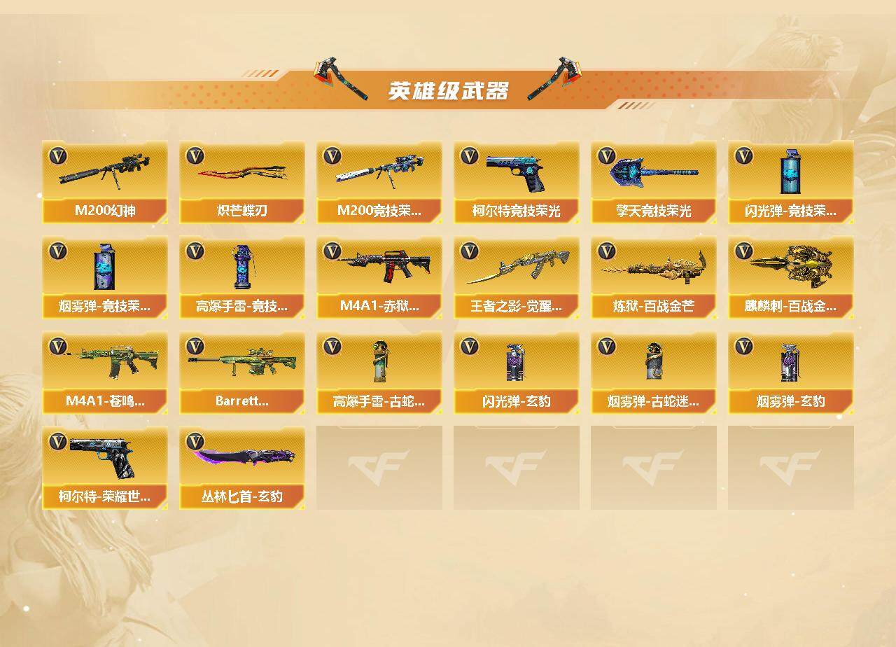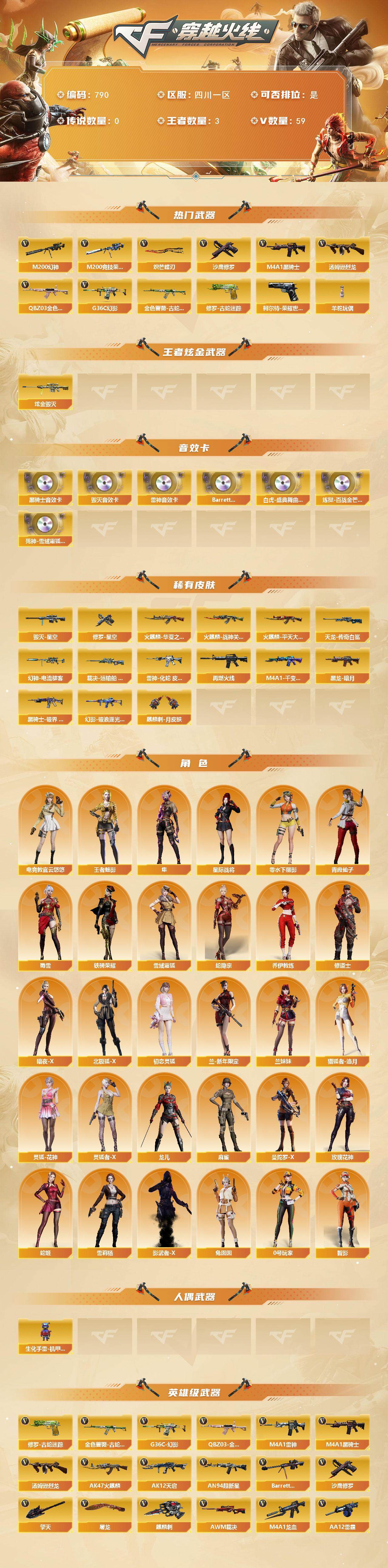 [14444371]四川一区-59v-3王者-1炫金 【热门武器】:g36c-幻影,q03-金色蔷薇,m200-幻神,柯尔特-荣耀世冠白鲨2023,金色蔷薇-古蛇迷踪,修罗-古蛇迷踪,m200-竞技荣光,m4a1-黑骑士,汤姆逊-烈龙2,羊驼玩偶2,沙鹰-修罗,炽芒蝶刃 【王者炫金武器】:炫金毁灭 【音效卡】:m4a1-雷神音效卡,m4a1-黑骑士音效卡,barrett-毁灭音效卡,barrett-碧霄极光音效卡2,白虎-盛典舞曲音效卡,炼狱-百战金芒-庆典舞曲音效卡,死神-雪域霜狐-怀旧音效卡 【皮肤】:幻神-电流骇客 皮肤,裁决-运输船 皮肤,雷神-化蛇 皮肤,m4a1-再燃火线,火麒麟-华夏之心,火麒麟-战神关羽,火麒麟-平天大圣,毁灭-星空,m4a1-千变-孔明皮肤,黑龙-暗月2,黑骑士-破界 皮肤,幻影-破浪逐光 皮肤,awm-天龙-传奇白鲨,修罗-星空,麒麟刺-月皮肤 【角色】:电竞教官-云悠悠,隼,星际战将,王者-魅影,雪域霜狐,蛇隐宗,乔伊教练,修道士,暗夜-x,北极狐-x,初恋灵狐,兰-新年限定,兰妹妹,猎狐者-追月,0号玩家,零-水下丽影,灵狐-花神,灵狐者-x,龙儿,麻雀,曼陀罗-x,玫瑰花神,青霞仙子,蛇姬,蜀雪,铁骑荣耀,兔囡囡,雪莉杨,影武者-x,智影 【人偶武器】:生化手蕾-机甲核心3 【英雄级武器】:ak47-火麒麟,m4a1-雷神2,m4a1-黑骑士,ak12-天启2,an94-超新星2,m4a1-龙血,g36c-幻影,金色蔷薇-古蛇迷踪,q03-金色蔷薇,王者之影-觉醒版,barrett-毁灭,awm-裁决,m200-幻神,m200-竞技荣光,炼狱-百战金芒,汤姆逊-烈龙2,aa-12-雷霆,沙鹰-修罗,柯尔特-荣耀世冠白鲨2023,柯尔特-竞技荣光,修罗-古蛇迷踪,屠龙,擎天,麒麟刺,擎天-竞技荣光2,炽芒蝶刃,麒麟刺-百战金芒,丛林匕首-玄豹,高爆手蕾-竞技荣光6,高爆手蕾-古蛇迷踪,闪光丹-竞技荣光4,闪光丹-玄豹,盐雾蛋-竞技荣光5,盐雾蛋-古蛇迷踪,盐雾蛋-玄豹,m4a1-赤狱骑士,m4a1-苍鸣雷神,barrett-碧霄极光 【道具】:bs战队炫彩背包,cfs限定背包,亚洲杯纪念炫彩背包,古蛇迷踪炫彩背包,女皇终结者-背包,炫彩背包-诺拉,百战金芒炫彩背包,老虎背包,超级背包,迷你冰龙背包,雪域霜狐炫彩