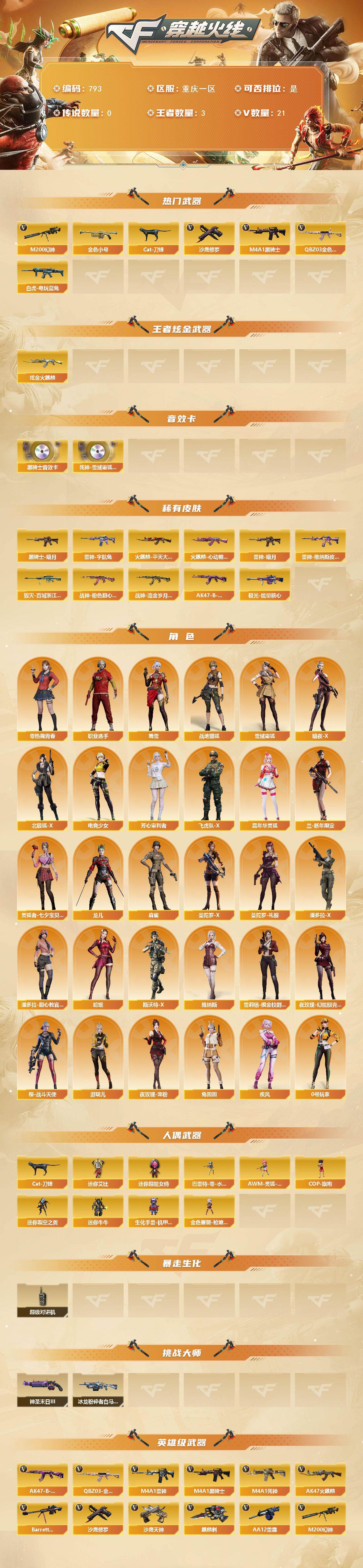 [14444495]重庆一区-21v-3王者-1炫金 【热门武器】:q03-金色蔷薇,m200-幻神,白虎-电玩蓝兔,金色小号,cat-刀锋,m4a1-黑骑士,沙鹰-修罗 【王者炫金武器】:炫金火麒麟 【音效卡】:m4a1-黑骑士音效卡,死神-雪域霜狐-怀旧音效卡 【皮肤】:雷神-暗月,雷神-宇航兔皮肤,雷神-维纳斯皮肤,火麒麟-平天大圣2,火麒麟-心动糖果,毁灭-百城浙江 皮肤,黑骑士-暗月,战神-粉色甜心皮肤,战神-流金岁月皮肤,ak47-b-常胜将军-曹操,极光-能量核心 【角色】:战地猎狐,雪域霜狐,暗夜-x,北极狐-x,电竞少女,芳心审判者,飞虎队-x,嘉年华灵狐,疾风,兰-新年限定,0号玩家,零-热舞青春,灵狐者-七夕宝贝,龙儿,麻雀,曼陀罗-x,曼陀罗-礼服,潘多拉-x,潘多拉-甜心教官,蛇姬,斯沃特-x,蜀雪,兔囡囡,维纳斯,雪莉杨-摸金校尉,夜玫瑰-幻能朋克,夜玫瑰-宠粉,樱-战斗天使,游珑儿,职业选手 【人偶武器】:金色蔷薇-呛娘阿敏,芭蕾特-零-水下丽影,awm-灵狐-15周年嘉年华,cop-旗袍,cat-刀锋,迷你裂空之翼,迷你牛牛,生化手蕾-机甲核心,迷你艾比,迷你超能女侍 【暴走生化】:超级对讲机 【挑战大师】:冰龙粉碎者-白马银呛,神圣爆裂者-末日iii 【英雄级武器】:ak47-火麒麟,m4a1-雷神2,m4a1-黑骑士,m4a1-死神,无影-神兵利器,黑武士-锦绣游龙,q03-金色蔷薇,ak-47-猩红传说,黑骑士-海王,ak47-b-常胜将军,白虎-电玩蓝兔,王者芳薇-觉醒版,barrett-毁灭,m200-幻神,王者星神-觉醒版,aa-12-雷霆,沙鹰-修罗,沙鹰-天神,麒麟刺,awm-昌龙 【道具】:cfs限定背包,古蛇迷踪炫彩背包,机械魔影背包-红色,超级背包,雪域霜狐炫彩背包,救世主-黑桃战神,夺命之镰,防化服,金色流光-呛王排位2,星辰流光-呛王排位,呛王排位28赛季金色流光,呛王排位29赛季金色流光,语音特效-怀旧,雪域霜狐表情,电玩兔兔表情,ep战队名片,ep战队喷图,ep战队击杀图标,c4-沙漠,c4-再燃火线,防弹头盔2,防弹衣2,c4工具钳2,手蕾包2 【特殊呛械】:1黑骑士