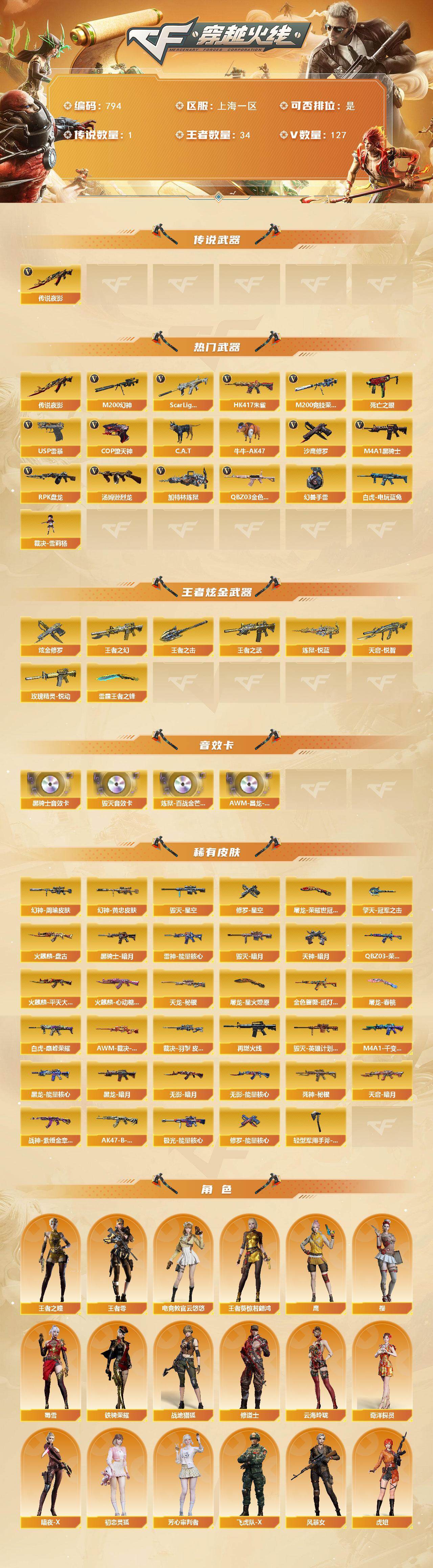 [14444520]上海一区-127v-34王者-1炫金 【传说武器】:传说夜影 【热门武器】:传说夜影,q03-金色蔷薇,scar light-白虎,hk417-朱雀,m200-幻神,m200-竞技荣光,死亡之眼,白虎-电玩蓝兔,c.a.t,牛牛-ak47,m4a1-黑骑士,汤姆逊-烈龙7,rpk-盘龙6,加特林-炼狱,裁决-雪莉杨,usp-雷暴,cop-堕天神,沙鹰-修罗3,高爆手蕾-幻兽 【王者炫金武器】:天启-悦智2,王者之幻,王者之武,玫瑰精灵-悦动2,炼狱-悦蓝4,王者之击,雷霆王者之锋,炫金修罗 【音效卡】:m4a1-黑骑士音效卡,barrett-毁灭音效卡,炼狱-百战金芒-庆典舞曲音效卡,awm-昌龙-怀旧音效卡2 【皮肤】:m200-幻神-黄忠皮肤,幻神-周瑜皮肤,白虎-巅峰荣耀 皮肤,q03-荣耀世冠白鲨,金色蔷薇-纸灯龙皮肤,awm-裁决-凤灵皮肤,裁决-羽掣 皮肤,雷神-能量核心,m4a1-再燃火线,火麒麟-平天大圣,火麒麟-盘古,火麒麟-心动糖果,毁灭-暗月5,毁灭-星空,毁灭-英雄计划 皮肤,m4a1-千变-孔明皮肤,黑龙-能量核心,黑龙-暗月2,黑骑士-暗月3,无影-暗月8,无影-能量核心2,死神-秘银2,天启-暗月3,战神-紫绶金章皮肤4,ak47-b-常胜将军-刘备,天龙-秘银,极光-能量核心,修罗-能量核心3,修罗-星空,天神-暗月4,屠龙-荣耀世冠ag,屠龙-星火燎原,屠龙-春桃 皮肤,轻型军用手斧-再燃火线,擎天-冠军之击 【角色】:樱,电竞教官-云悠悠,鹰,战地猎狐,王者葵-惊若翩鸿,王者-零,王者之瞳,奇洋探员,修道士,云海玲珑,暗夜-x,初恋灵狐,芳心审判者,飞虎队-x,风暴女,虎妞,嘉年华灵狐,卡塔琳娜,兰-新年限定,灵狐者-x,麻雀,曼陀罗-x,潘多拉-x,斯沃特-x,蜀雪,铁骑荣耀,雪莉杨-摸金校尉 【人偶武器】:裁决-雪莉杨,天龙-曼陀罗,火麒麟-灵狐,awm-灵狐-15周年嘉年华,m37-葵,c.a.t,牛牛-ak47,迷你牛魔王,夺魂,迷你牛牛,迷你火种,ak47-斯沃特,barrett-夜玫瑰,迷你超能女侍 【暴走生化】:死亡之眼 【挑战大师】:冰龙粉碎者-白马银呛,神圣爆裂者-末日iii 【英雄级武器】:ak47-火麒麟2,m4a1-雷神3,m4a1-黑骑士,ak47-无影4
