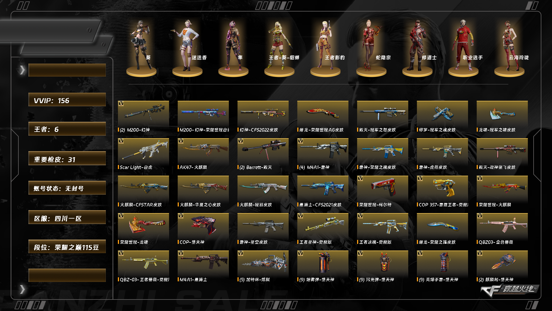 8183//西部/四川一区/可排位/段位荣耀之巅/154v/【两把幻神】/幻神/幻神荣耀世冠白鲨/幻神cfs2022/王者星神/【白虎三件套】/白虎/白虎音效卡/白虎电玩粉兔/玄武/q金色蔷薇/q巅峰荣耀/q王者蔷薇/王者芳薇/幻灵套/cop堕天神/cop幻灵/柯尔特电竞装甲/柯