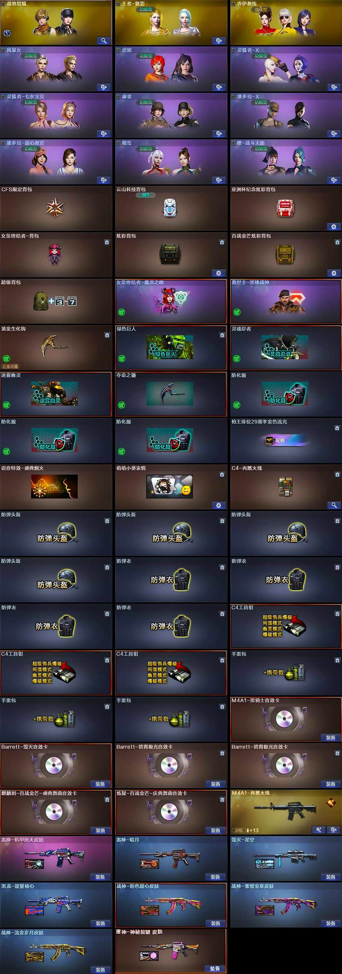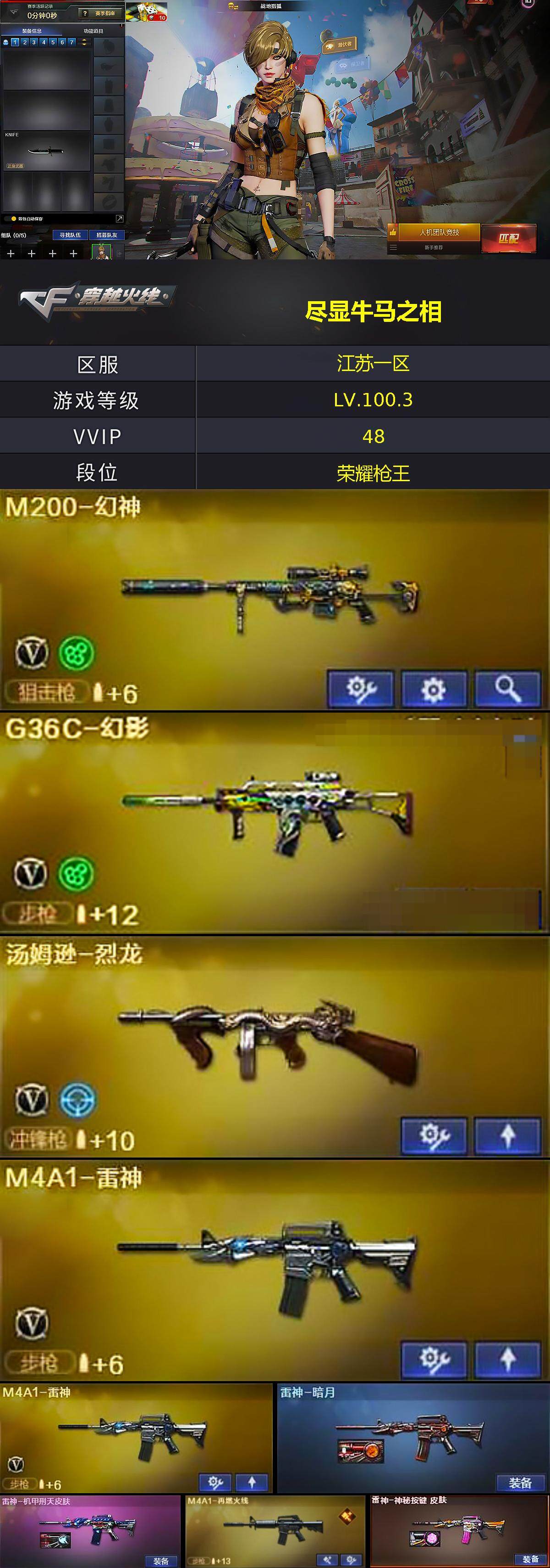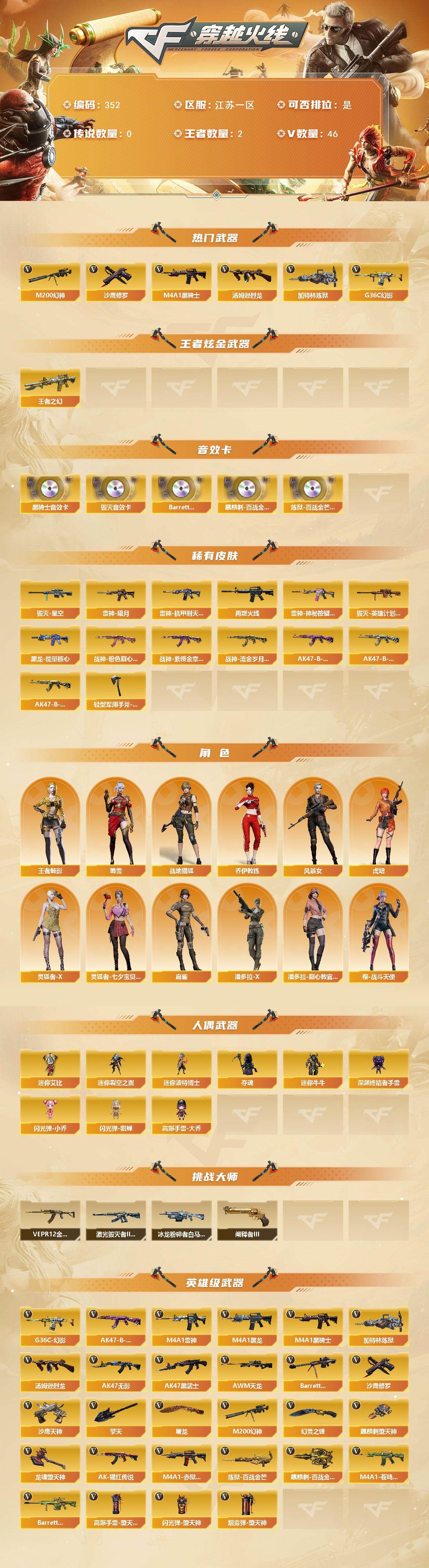 [14446255]江苏一区-46v-2王者-0炫金 【热门武器】:g36c-幻影,m200-幻神,m4a1-黑骑士,汤姆逊-烈龙,加特林-炼狱,沙鹰-修罗2 【王者炫金武器】:王者之幻 【音效卡】:m4a1-黑骑士音效卡,barrett-毁灭音效卡,barrett-碧霄极光音效卡2,麒麟刺-百战金芒-盛典舞曲音效卡,炼狱-百战金芒-庆典舞曲音效卡 【皮肤】:雷神-暗月,雷神-机甲刑天皮肤,m4a1-再燃火线,雷神-神秘按键 皮肤,毁灭-星空,毁灭-英雄计划 皮肤,黑龙-能量核心,战神-粉色甜心皮肤,战神-紫绶金章皮肤,战神-流金岁月皮肤,ak47-b-常胜将军-曹操,ak47-b-常胜将军-刘备,ak47-b-常胜将军-孙权2,轻型军用手斧-再燃火线 【角色】:战地猎狐,王者-魅影,乔伊教练,风暴女,虎妞,灵狐者-x,灵狐者-七夕宝贝,麻雀,潘多拉-x,潘多拉-甜心教官,蜀雪,樱-战斗天使 【人偶武器】:迷你裂空之翼,迷你波特博士2,夺魂,迷你牛牛,深渊终结者手蕾,闪光丹-小乔,闪光丹-貂蝉,高爆手蕾-大乔,迷你艾比 【挑战大师】:冰龙粉碎者-白马银呛,激光毁灭者iii-白马银呛,vepr-12-金魔,阐释者iii 【英雄级武器】:m4a1-黑龙,m4a1-雷神2,m4a1-黑骑士,ak47-无影2,ak47-黑武士,g36c-幻影,ak-47-猩红传说,ak47-b-常胜将军,awm-天龙,barrett-毁灭2,m200-幻神,加特林-炼狱,炼狱-百战金芒,汤姆逊-烈龙,沙鹰-修罗2,沙鹰-天神2,屠龙,麒麟刺-堕天神2,擎天,幻灵之锋,龙啸-堕天神,麒麟刺-百战金芒,高爆手蕾-堕天神2,闪光丹-堕天神2,盐雾蛋-堕天神2,m4a1-赤狱骑士,m4a1-苍鸣雷神,barrett-碧霄极光 【道具】:cfs限定背包,云山科技背包,亚洲杯纪念炫彩背包,女皇终结者-背包,炫彩背包,百战金芒炫彩背包,超级背包,女皇终结者-魔龙之吻,救世主-黑桃战神,黄金生化钩,绿色巨人,灵魂忍者,迷雾幽灵,夺命之镰,防化服3,呛王排位29赛季金色流光,语音特效-盛典烟火,萌萌小葵表情,c4-再燃火线,防弹头盔4,防弹衣4,c4工具钳3,手蕾包3 【特殊呛械】:1黑骑士,1烈龙,1炼狱