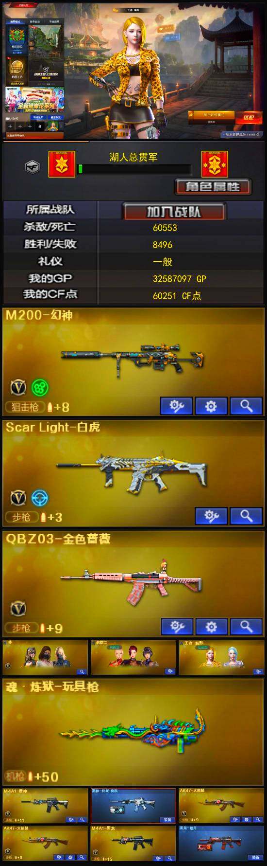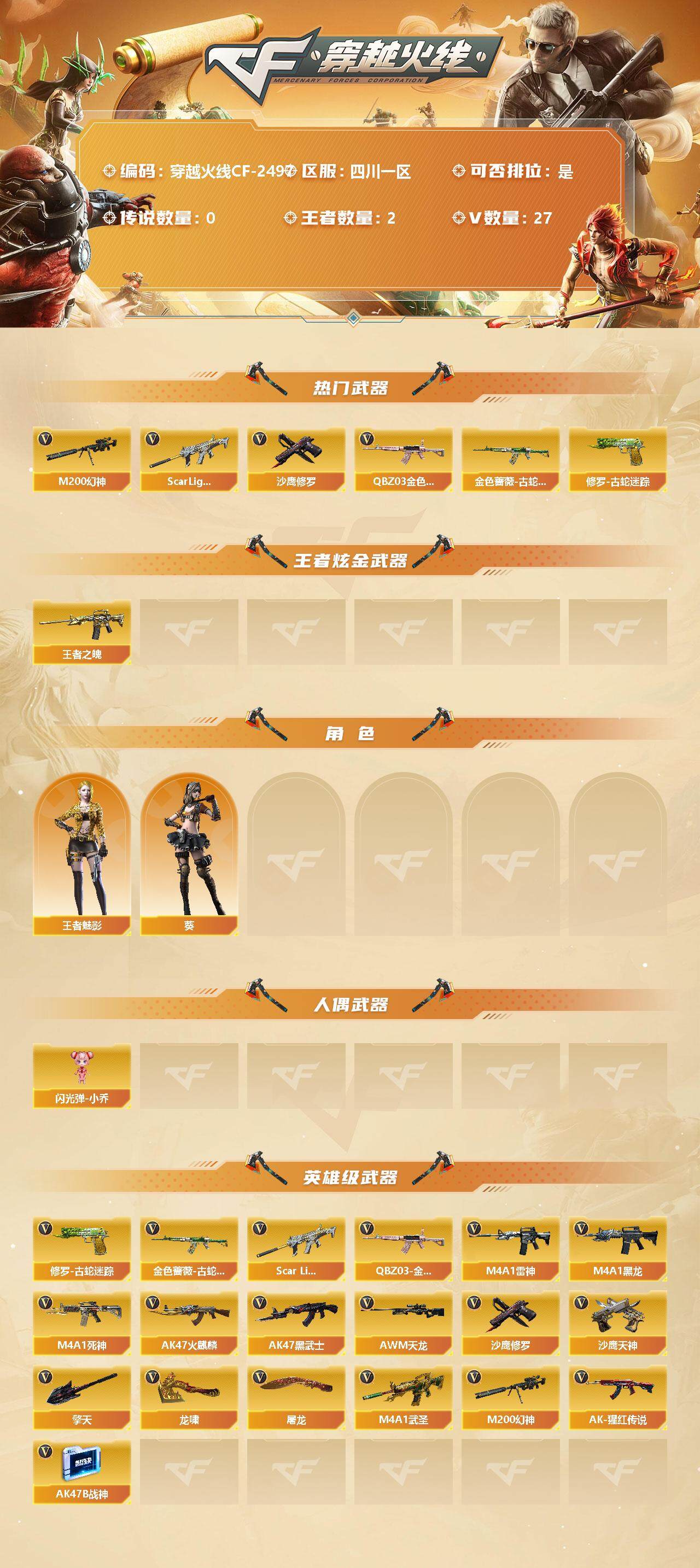 【商品标题】:四川一区-27v-2王者-0炫金 【热门武器】:q03-金色蔷薇,scar light-白虎,m200-幻神,金色蔷薇-古蛇迷踪,修罗-古蛇迷踪,沙鹰-修罗4 【王者炫金武器】:王者之魄 【角色】:王者-魅影,葵 【人偶武器】:闪光丹-小乔 【英雄级武器】:m4a1-武圣,q03-金色蔷薇,scar light-白虎,金色蔷薇-古蛇迷踪,m4a1-雷神,m4a1-黑龙,