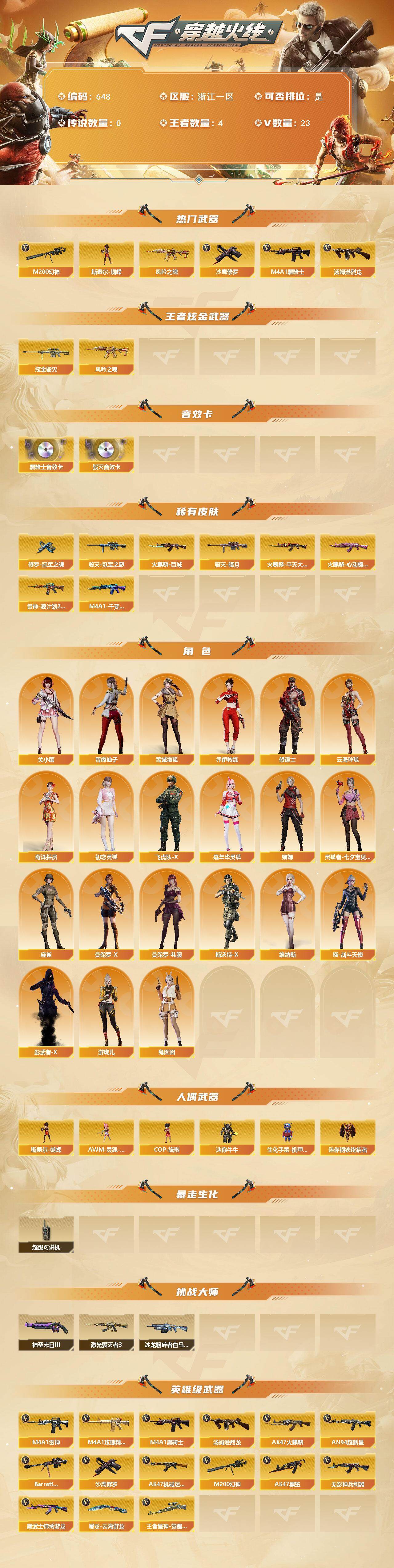 [14452167]浙江一区-23v-4王者-1炫金 【热门武器】:m200-幻神,凤吟之魄,m4a1-黑骑士2,汤姆逊-烈龙4,斯泰尔-蝴蝶,沙鹰-修罗 【王者炫金武器】:凤吟之魄,炫金毁灭 【音效卡】:m4a1-黑骑士音效卡,barrett-毁灭音效卡 【皮肤】:雷神-源计划2.0专属 皮肤,火麒麟-平天大圣,火麒麟-百城,火麒麟-心动糖果,毁灭-暗月,毁灭-冠军之怒,m4a1-千变-孔明皮肤,修罗-冠军之魂 【角色】:关小雨,雪域霜狐,奇洋探员,乔伊教练,修道士,云海玲珑,初恋灵狐,飞虎队-x,嘉年华灵狐,娟娟,灵狐者-七夕宝贝,麻雀,曼陀罗-x,曼陀罗-礼服,青霞仙子,斯沃特-x,兔囡囡,维纳斯,樱-战斗天使,影武者-x,游珑儿 【人偶武器】:迷你钢铁终结者,斯泰尔-蝴蝶,awm-灵狐-15周年嘉年华,cop-旗袍,迷你牛牛,生化手蕾-机甲核心 【暴走生化】:超级对讲机 【挑战大师】:冰龙粉碎者-白马银呛,激光毁灭者iii,神圣爆裂者-末日iii 【英雄级武器】:ak47-火麒麟2,m4a1-雷神2,m4a1-黑骑士2,an94-超新星,ak47-机械迷城,ak47-黑鲨,无影-神兵利器,黑武士-锦绣游龙,m4a1-玫瑰精灵,barrett-毁灭,m200-幻神,王者星神-觉醒版,汤姆逊-烈龙4,沙鹰-修罗,屠龙-云海游龙 【道具】:cfs限定背包,云山科技背包,背包-洛丽塔,超级背包,雪域霜狐炫彩背包,虚空终结者-暗域熔岩,女皇终结者-魔龙之吻,救世主-黑桃战神,绿色巨人,灵魂忍者2,变异宝贝,迷雾幽灵2,生化弹匣,夺命之镰,防化服3,流光-鎏金之域,语音特效-机器人,语音特效-生化,防弹头盔4,防弹衣4,c4工具钳4,手蕾包4 【特殊呛械】:蝴蝶斯泰尔4烈龙,2黑骑士,4烈龙,1蝴蝶斯泰尔