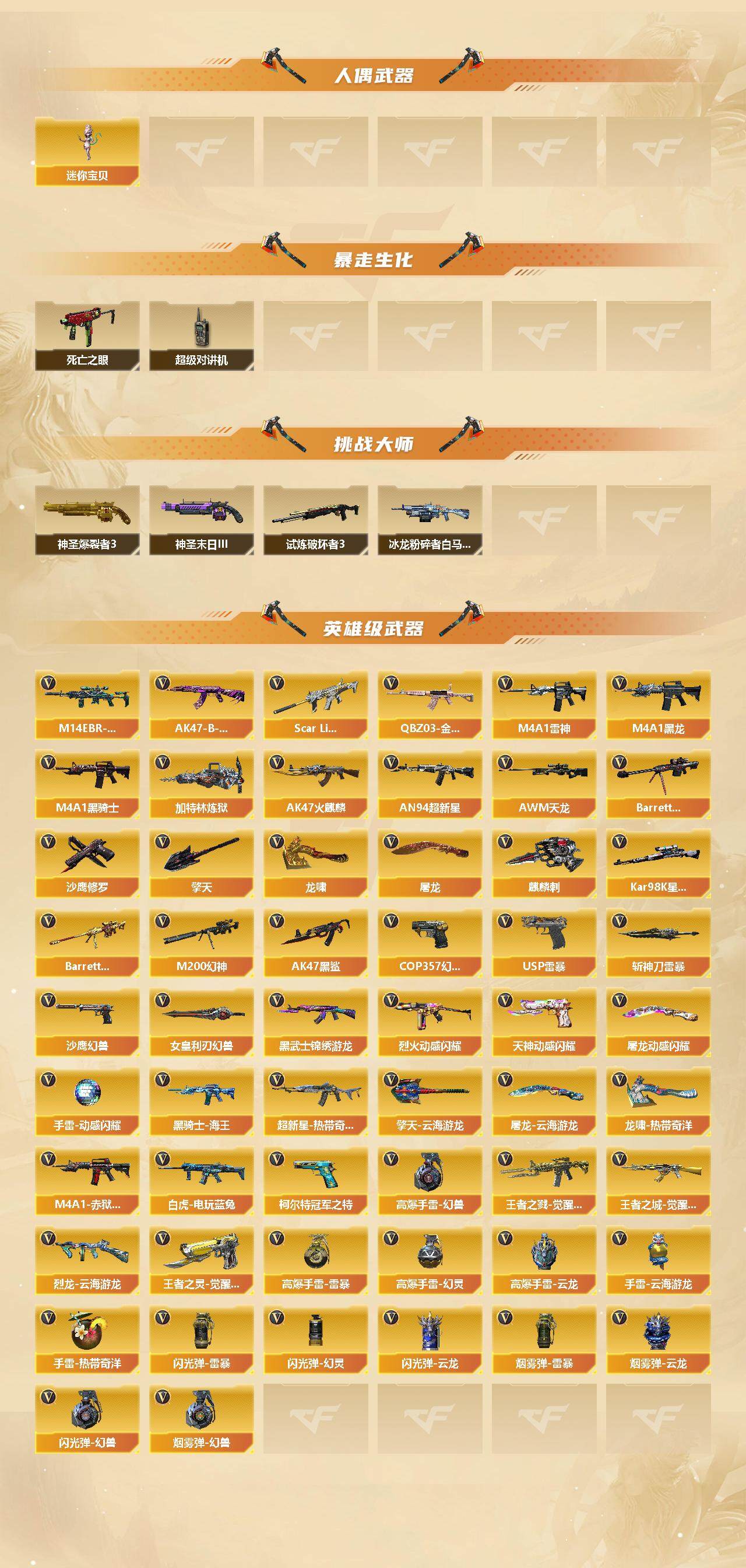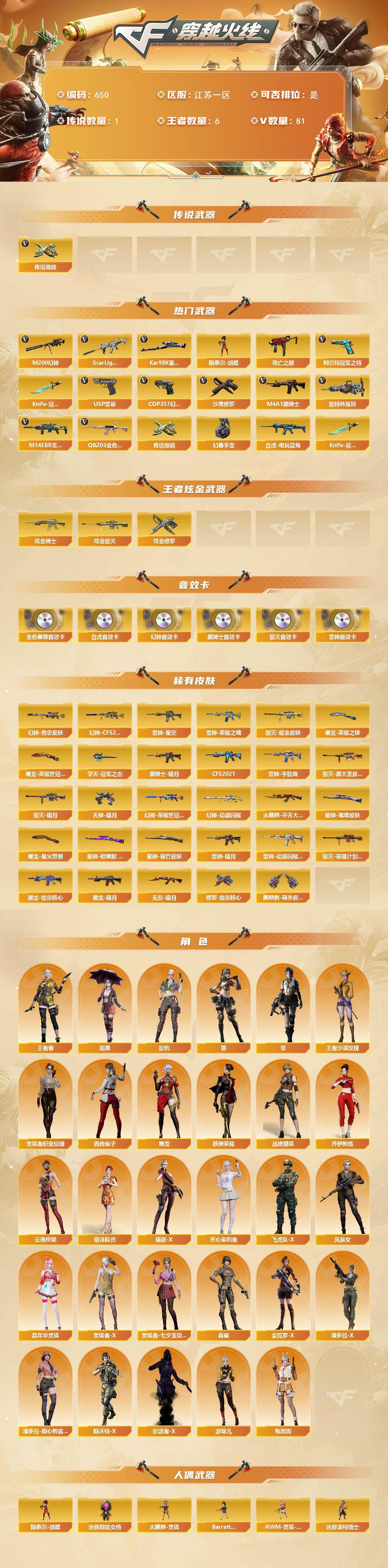 [14452934]江苏一区-81v-6王者-5炫金 【传说武器】:传说破晓 【热门武器】:传说破晓,q03-金色蔷薇2,m14ebr-玄武,scar light-白虎,m200-幻神2,死亡之眼,白虎-电玩蓝兔,柯尔特-冠军之特,kar98k-星神,m4a1-黑骑士2,加特林-炼狱,斯泰尔-蝴蝶,usp-雷暴,cop 357-幻灵,沙鹰-修罗2,knife-冠军之刃2,高爆手蕾-幻兽 【王者炫金武器】:炫金骑士,炫金毁灭,炫金修罗3 【音效卡】:m200-幻神音效卡,m4a1-雷神音效卡,m4a1-黑骑士音效卡,barrett-毁灭音效卡,q03-金色蔷薇音效卡,scar light-白虎音效卡 【皮肤】:m200-幻神-黄忠皮肤,幻神-cfs2022,m200-幻神-荣耀世冠白鲨,幻神-动感闪耀 皮肤,星神-璀璨皮肤,星神-呛娘默 皮肤,星神-破竹皮肤,雷神-暗月,雷神-荣耀之魄,雷神-星空,雷神-宇航兔皮肤,雷神-动感闪耀 皮肤2,火麒麟-平天大圣,毁灭-暗月,毁灭耀金皮肤,毁灭-黑大圣皮肤,毁灭-英雄计划 皮肤,黑龙-能量核心,黑龙-暗月,黑骑士-暗月2,黑骑士-cfs2021,无影-暗月2,修罗-能量核心,天神-暗月,屠龙-荣耀之锋,屠龙-荣耀世冠ag,屠龙-星火燎原,擎天-冠军之击,麒麟刺-萌杀皮肤 【角色】:零,葵,雨棠,影豹,战地猎狐,王者春,王者沙漠玫瑰,奇洋探员,乔伊教练,云海玲珑,暗夜-x,芳心审判者,飞虎队-x,风暴女2,嘉年华灵狐,灵狐者-x,灵狐者-七夕宝贝,灵狐者-职业经理,麻雀,曼陀罗-x,潘多拉-x,潘多拉-甜心教官,青霞仙子,斯沃特-x,蜀雪,铁骑荣耀,兔囡囡,影武者-x,游珑儿 【人偶武器】:火麒麟-灵狐,迷你宝贝,斯泰尔-蝴蝶,awm-灵狐-15周年嘉年华,迷你波特博士,barrett-夜玫瑰,迷你超能女侍 【暴走生化】:死亡之眼,超级对讲机 【挑战大师】:神圣爆裂者iii2,冰龙粉碎者-白马银呛,试炼破坏者iii,神圣爆裂者-末日iii 【英雄级武器】:ak47-火麒麟,m4a1-黑龙,m4a1-雷神,m4a1-黑骑士2,an94-超新星,ak47-黑鲨3,scar light-白虎,m14ebr-玄武,黑武士-锦绣游龙,超新星-热带奇洋,q03-金色蔷薇2,烈火-动感闪耀,王者之戮-觉醒版,王者之城-