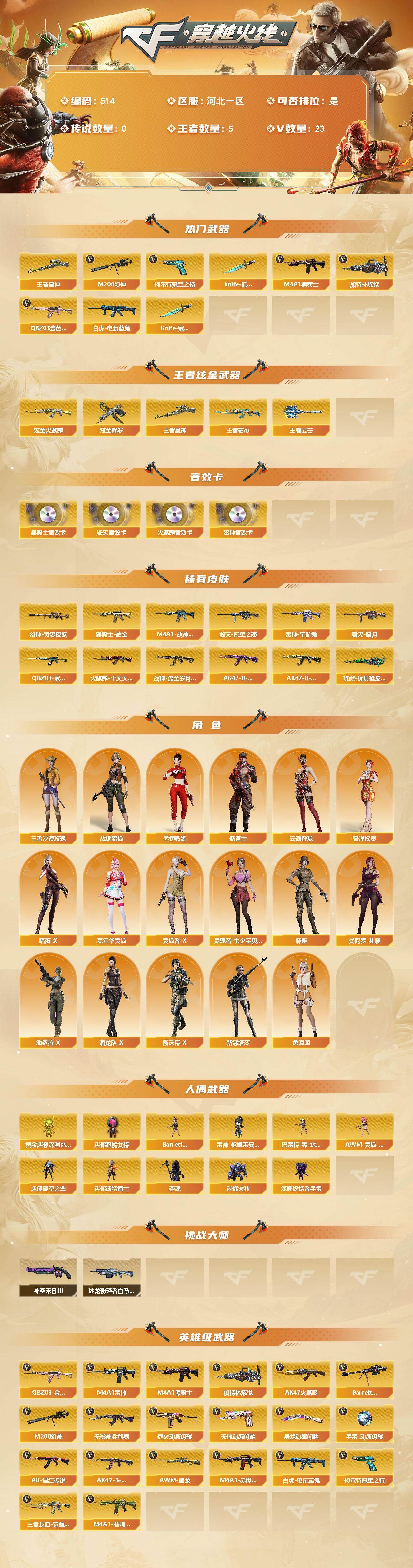 [14452961]河北一区-23v-5王者-2炫金 【热门武器】:王者星神,q03-金色蔷薇2,m200-幻神2,白虎-电玩蓝兔,柯尔特-冠军之特,m4a1-黑骑士,加特林-炼狱,knife-冠军之刃2 【王者炫金武器】:王者霜心,王者星神,王者云击,炫金火麒麟,炫金修罗 【音效卡】:ak47-火麒麟音效卡,m4a1-雷神音效卡,m4a1-黑骑士音效卡,barrett-毁灭音效卡 【皮肤】:m200-幻神-黄忠皮肤,q03-冠军之薇,m4a1-战神赵云,雷神-宇航兔皮肤,火麒麟-平天大圣,毁灭-暗月,毁灭-冠军之怒,黑骑士耀金皮肤,战神-流金岁月皮肤,ak47-b-常胜将军-曹操,ak47-b-常胜将军-孙权,炼狱-玩具呛皮肤 【角色】:战地猎狐,王者沙漠玫瑰,奇洋探员,乔伊教练,修道士,云海玲珑,暗夜-x,嘉年华灵狐,灵狐者-x,灵狐者-七夕宝贝,麻雀,曼陀罗-礼服,潘多拉-x,潜龙队-x,斯沃特-x,兔囡囡,新娜塔莎 【人偶武器】:雷神-呛娘蕾安娜,芭蕾特-零-水下丽影,awm-灵狐-15周年嘉年华,黄金迷你深渊冰龙,迷你裂空之翼,迷你波特博士3,夺魂,迷你火种2,深渊终结者手蕾,barrett-夜玫瑰,迷你超能女侍 【挑战大师】:冰龙粉碎者-白马银呛,神圣爆裂者-末日iii 【英雄级武器】:ak47-火麒麟,m4a1-雷神,m4a1-黑骑士,无影-神兵利器,q03-金色蔷薇2,烈火-动感闪耀,ak-47-猩红传说,ak47-b-战神2,王者龙血-觉醒版,白虎-电玩蓝兔,barrett-毁灭,m200-幻神2,加特林-炼狱,柯尔特-冠军之特,天神-动感闪耀,屠龙-动感闪耀,手蕾-动感闪耀,m4a1-赤狱骑士,m4a1-苍鸣雷神,awm-昌龙 【道具】:bs战队炫彩背包,cfs限定背包,云山科技背包,亚洲杯纪念炫彩背包,全能呛王背包,女皇终结者-魔龙之吻,救世主-黑桃战神,绿色巨人,灵魂忍者,迷雾幽灵,夺命之镰,防化服3,金色流光-呛王排位,呛王排位29赛季金色流光,电玩兔兔表情2,动感闪耀表情2,cfpl选手表情-第1套,c4-再燃火线,防弹头盔3,防弹衣3,c4工具钳3,手蕾包3 【特殊呛械】:1黑骑士,1炼狱