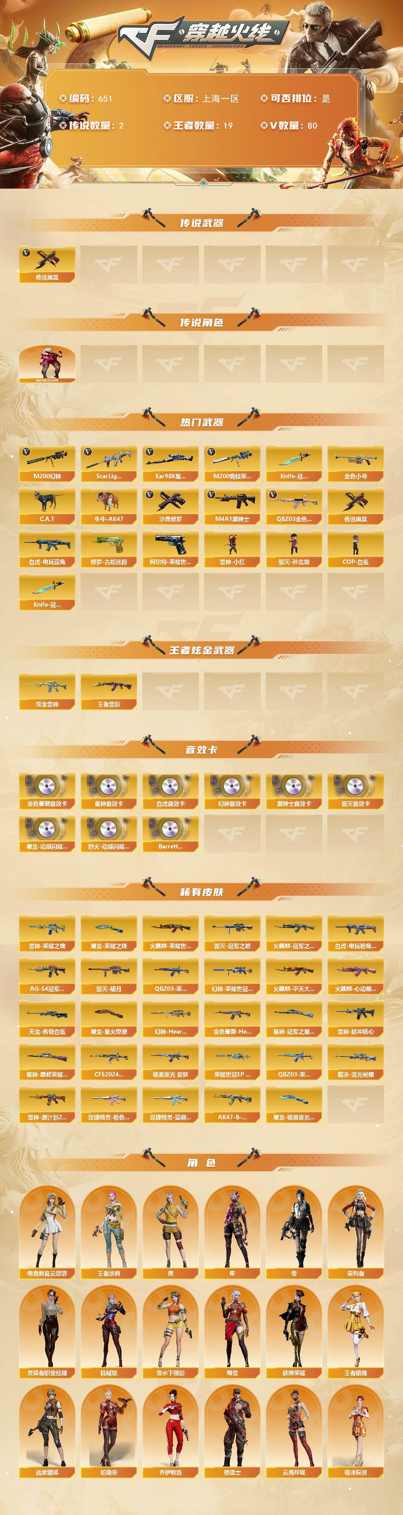 [14455487]上海一区-80v-19王者-1炫金 【传说武器】:传说幽冥 【传说角色】:传说影煞 【热门武器】:传说幽冥,q03-金色蔷薇2,scar light-白虎,m200-幻神,柯尔特-荣耀世冠白鲨2023,修罗-古蛇迷踪,m200-竞技荣光,白虎-电玩蓝兔,kar98k-星神,金色小号,c.a.t,牛牛-ak47,m4a1-黑骑士,雷神-小红,毁灭-孙三炮,cop-白鲨,沙鹰-修罗,knife-冠军之刃2 【王者炫金武器】:王者雷影,炫金雷神 【音效卡】:屠龙-动感闪耀 音效卡,烈火-动感闪耀 音效卡,m200-幻神音效卡,m4a1-黑骑士音效卡,barrett-毁灭音效卡,q03-金色蔷薇音效卡,scar light-白虎音效卡,kar98k-星神音效卡,barrett-碧霄极光音效卡 【皮肤】:m200-幻神-荣耀世冠白鲨,幻神-heartshot 皮肤,幻神-荣耀世冠ep 皮肤,白虎-电玩粉兔皮肤,q03-荣耀世冠白鲨,金色蔷薇-heartshot皮肤,q03-cfs2024 皮肤,金色蔷薇-破浪逐光 皮肤,q03-荣耀世冠ep 皮肤,裁决-流光秘银,kar98k-星神-冠军之星皮肤,星神-巅峰荣耀 皮肤,雷神-荣耀之魄,雷神-脉冲核心,雷神-源计划2.0专属 皮肤,火麒麟-冠军之心,火麒麟-平天大圣,火麒麟-荣耀世冠ag,火麒麟-心动糖果,毁灭-暗月,毁灭-冠军之怒,黑骑士-ag-s4冠军典藏,玫瑰精灵-粉色浪漫 皮肤,玫瑰精灵-蓝调梦幻 皮肤,ak47-b-常胜将军-刘备2,awm-天龙-传奇白鲨,屠龙-荣耀之锋2,屠龙-星火燎原,屠龙-破浪逐光 皮肤 【角色】:零,电竞教官-云悠悠,鹰,隼,机械姬,审判者,妮妮,战地猎狐,王者涂鸦,王者晴雅,蛇隐宗,奇洋探员,乔伊教练,修道士,云海玲珑,北极狐-x,初恋灵狐,芳心审判者,飞虎队-x,风暴女2,嘉年华灵狐,兰妹妹,零-水下丽影,灵狐-花神,灵狐者-x,灵狐者-黄金海岸,灵狐者-职业经理,龙儿,龙儿-小淘气,潘多拉-x,潘多拉-甜心教官,蛇姬,斯沃特-x,蜀雪,铁骑荣耀,兔囡囡,维纳斯,游珑儿 【人偶武器】:雷神-小红,cop-白鲨,毁灭-孙三炮,天龙-曼陀罗,天龙-乔伊教练,scar light-马呛,awm-灵狐-15周年嘉年华,c.a.t,牛牛-ak47,夺魂,迷你超能女侍,