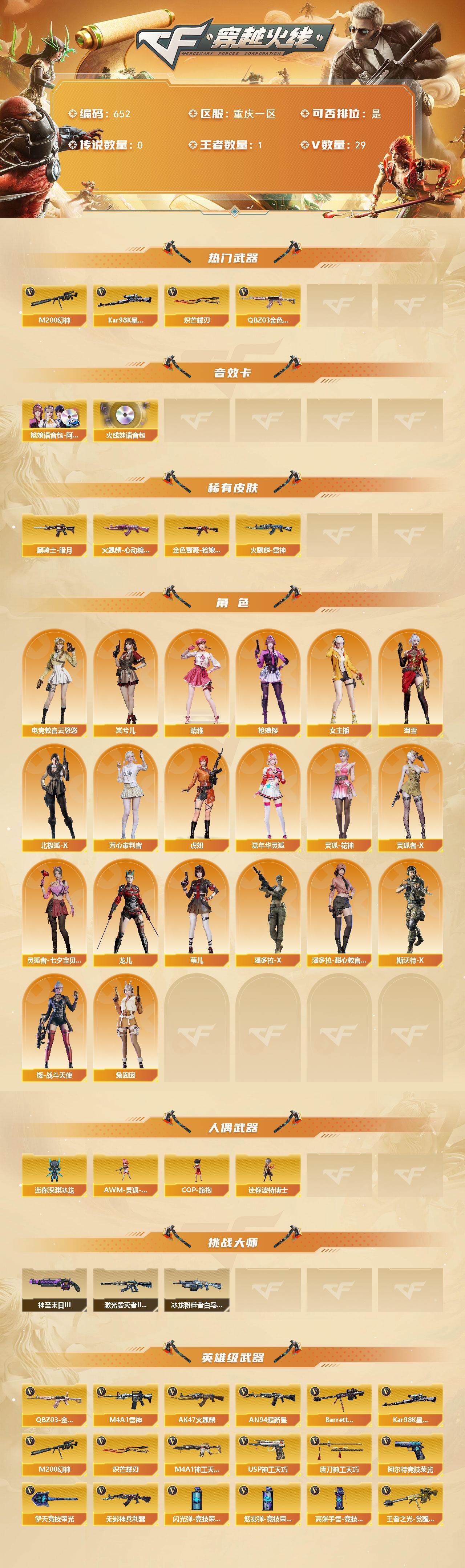 [14457827]重庆一区-29v-1王者-0炫金 【热门武器】:q03-金色蔷薇,m200-幻神,kar98k-星神,炽芒蝶刃 【音效卡】:呛娘语音包-阿敏,火线妹语音包 【皮肤】:金色蔷薇-呛娘阿敏 皮肤,火麒麟-雷神,火麒麟-心动糖果,黑骑士-暗月2 【角色】:电竞教官-云悠悠,呛娘樱,晴雅,岚兮儿,北极狐-x,芳心审判者,虎妞,嘉年华灵狐,灵狐-花神,灵狐者-x,灵狐者-七夕宝贝,龙儿,萌儿,女主播,潘多拉-x,潘多拉-甜心教官,斯沃特-x,蜀雪,兔囡囡,樱-战斗天使 【人偶武器】:awm-灵狐-15周年嘉年华,cop-旗袍,迷你深渊冰龙,迷你波特博士2 【挑战大师】:冰龙粉碎者-白马银呛,激光毁灭者iii-白马银呛,神圣爆裂者-末日iii 【英雄级武器】:ak47-火麒麟,m4a1-雷神,an94-超新星,m4a1-神工天巧,无影-神兵利器,q03-金色蔷薇,barrett-毁灭,m200-幻神,kar98k-星神,王者之光-觉醒版,柯尔特-竞技荣光,usp-神工天巧,擎天-竞技荣光,炽芒蝶刃,唐刀-神工天巧,高爆手蕾-竞技荣光2,闪光丹-竞技荣光4,盐雾蛋-竞技荣光5 【道具】:炫彩背包,超级背包,夺命之镰,防化服,金色流光-呛王排位2,星辰流光-呛王排位,呛王排位28赛季金色流光,呛王排位29赛季金色流光,防弹头盔2,防弹衣2,c4工具钳2,手蕾包2 【特殊呛械】:
