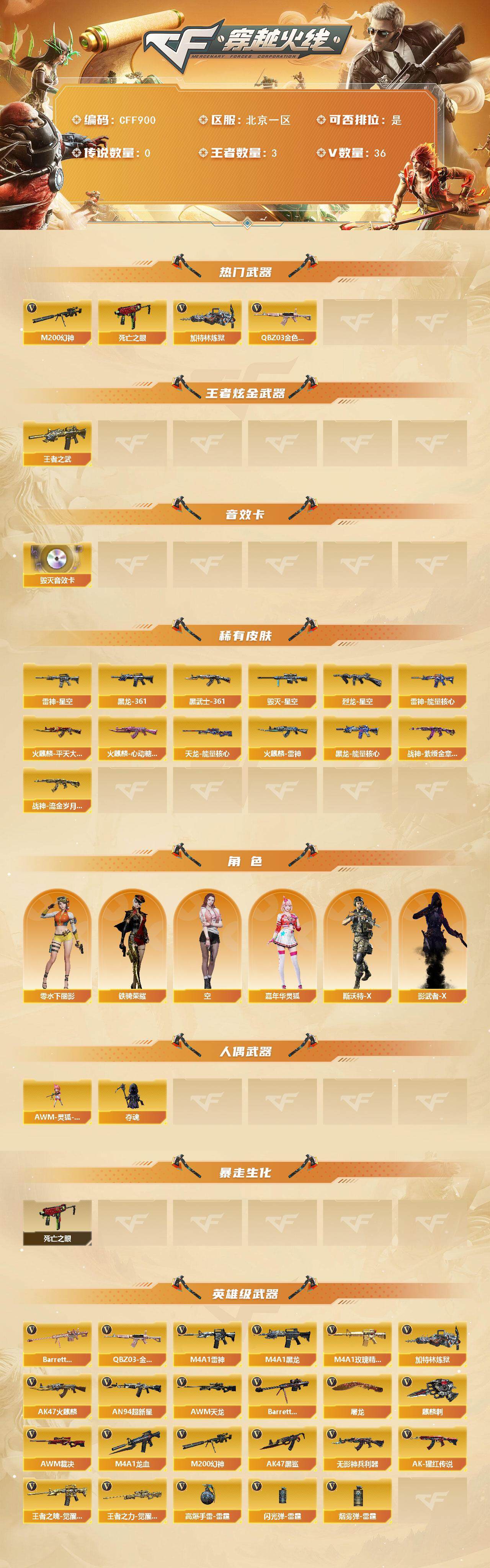 【cff900】36v/102级/荣耀元首/3王者/q03-金色蔷薇/m200-幻神/死亡之眼/加特林-炼狱/王者之武/barrett-毁灭音效卡/烈龙-星空/雷神-能量核心/雷神-星空/火麒麟-雷神/火麒麟-平天大圣/火麒麟-心动糖果/毁灭-星空/黑龙-能量核心/m4a1-黑龙-361/ak47-黑武士-361/战神-紫绶金章皮肤/战神-流金岁月皮肤/天龙-能量核心/空/嘉年华灵狐/零-水下丽影/斯沃特-x/铁骑荣耀/影武者-x/awm-灵狐-15周年嘉年华/夺魂/ak47-火麒麟/m4a1-黑龙/m4a1-雷神/an94-超新星/ak47-黑鲨/m4a1-龙血/无影-神兵利器/m4a1-玫瑰精灵/王者之魄-觉醒版/ak-47-猩红传说/awm-天龙/barrett-毁灭/awm-裁决/barrett-金色蔷薇/王者之力-觉醒版/屠龙/麒麟刺/高爆手蕾-雷霆/闪光丹-雷霆/盐雾蛋-雷霆/炫彩背包/超级背包/变异宝贝/夺命之镰/防化服/金色流光-呛王排位/星辰流光-呛王排位/呛王排位28赛季金色流光/语音特效-生化/防弹头盔/防弹衣/c4工具钳/手蕾包
