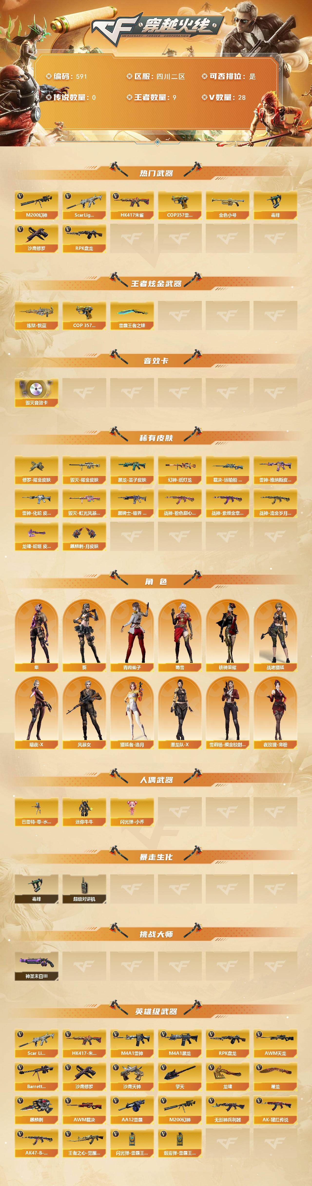 [14507672]四川二区-28v-9王者-0炫金 【热门武器】:scar light-白虎,hk417-朱雀,m200-幻神2,金色小号,毒蜂,rpk-盘龙,cop 357-雷霆王者,沙鹰-修罗 【王者炫金武器】:炼狱-悦蓝,cop 357-雷霆王者,雷霆王者之锋 【音效卡】:barrett-毁灭音效卡 【皮肤】:幻神-纸灯龙皮肤,裁决-运输船 皮肤,雷神-维纳斯皮肤,雷神-化蛇 皮肤,毁灭耀金皮肤,毁灭-虹光风暴 皮肤,黑龙-墨子皮肤,黑骑士-破界 皮肤,战神-粉色甜心皮肤3,战神-紫绶金章皮肤,战神-流金岁月皮肤,修罗耀金皮肤,龙啸-蛇姬 皮肤,麒麟刺-月皮肤 【角色】:葵,隼,战地猎狐,暗夜-x,风暴女,猎狐者-追月,潜龙队-x,青霞仙子,蜀雪,铁骑荣耀,雪莉杨-摸金校尉,夜玫瑰-宠粉 【人偶武器】:芭蕾特-零-水下丽影,迷你牛牛,闪光丹-小乔 【暴走生化】:毒蜂,超级对讲机 【挑战大师】:神圣爆裂者-末日iii 【英雄级武器】:m4a1-黑龙,m4a1-雷神,hk417-朱雀,scar light-白虎,无影-神兵利器,王者之心-觉醒版,ak-47-猩红传说4,ak47-b-战神,awm-天龙,barrett-毁灭,awm-裁决,m200-幻神2,rpk-盘龙,aa-12-雷霆,沙鹰-修罗,沙鹰-天神,屠龙,龙啸,擎天,麒麟刺,闪光丹-雷霆王者-觉醒版2,盐雾蛋-雷霆王者-觉醒版 【道具】:bs战队炫彩背包,cfs限定背包,云山科技背包,战舰背包,机械魔影背包-红色,炫彩背包,超级背包,女皇终结者-魔龙之吻,救世主-黑桃战神,绿色巨人,夺命之镰,防化服2,金色流光-呛王排位,巅峰赛先锋-金色流光,呛王排位28赛季金色流光,呛王排位29赛季金色流光,ep战队名片,ep战队喷图,ep战队击杀图标,防弹头盔2,防弹衣2,c4工具钳2,手蕾包2 【特殊呛械】:1白虎,1盘龙