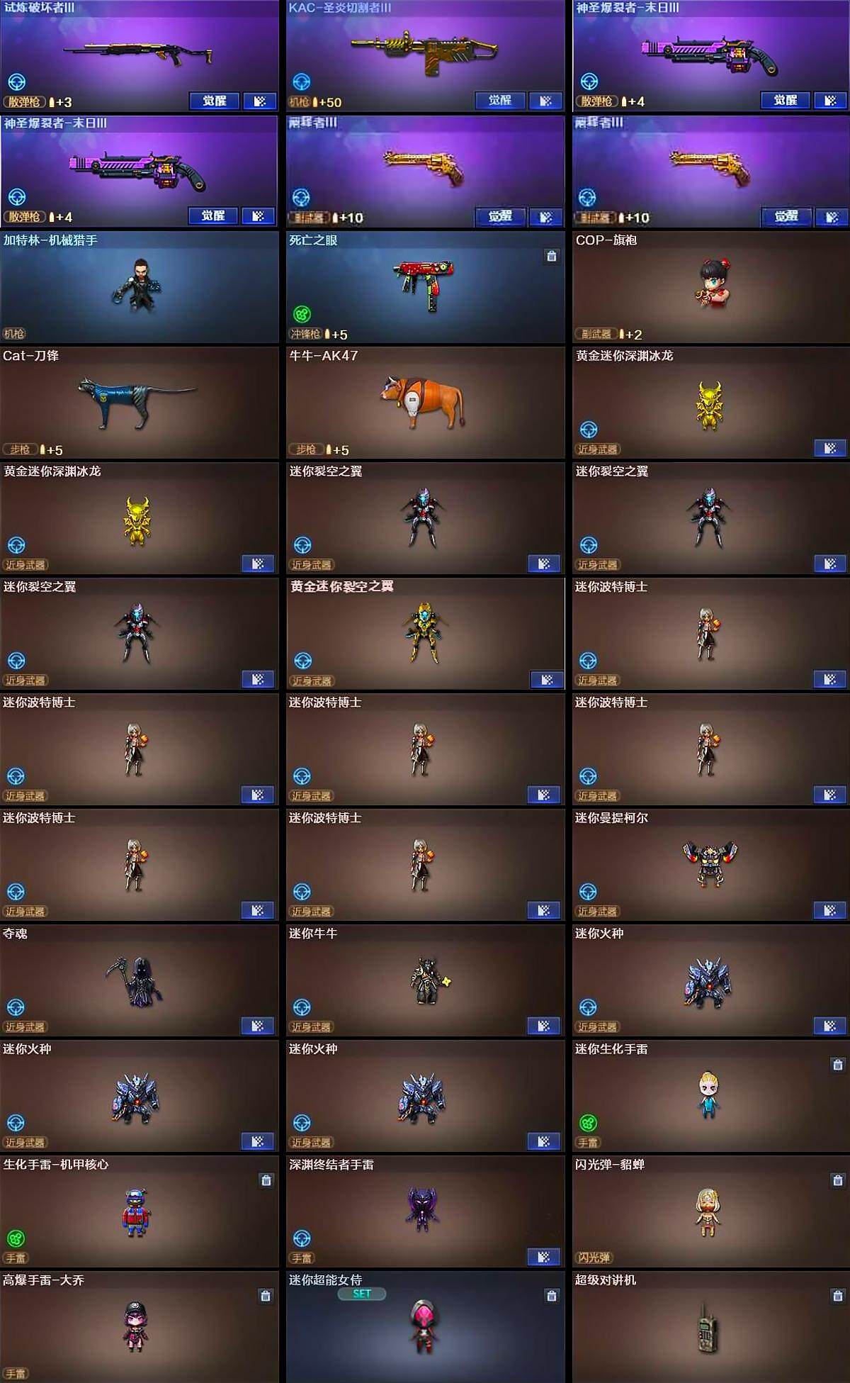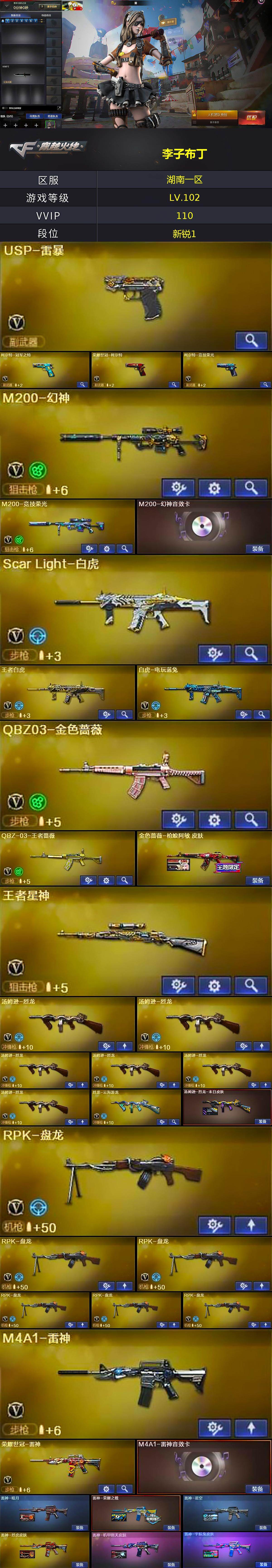 [14507856]湖南一区-110v-38王者-3炫金 【热门武器】:q03-金色蔷薇,scar light-白虎,hk417-朱雀,m4a1-青龙,m200-幻神,m200-竞技荣光,死亡之眼,荣耀世冠-火麒麟,荣耀世冠-雷神,白虎-电玩蓝兔,柯尔特-冠军之特,荣耀世冠-柯尔特,金色小号,cat-刀锋,牛牛-ak47,m4a1-黑骑士5,汤姆逊-烈龙6,rpk-盘龙6,羊驼玩偶2,usp-雷暴,沙鹰-修罗3 【王者炫金武器】:王者之圣,天启-悦智,王者蔷薇,炫金骑士,炫金无影2 【音效卡】:屠龙-动感闪耀 音效卡,m200-幻神音效卡,ak47-火麒麟音效卡,m4a1-雷神音效卡,m4a1-黑龙音效卡,m4a1-黑骑士音效卡,barrett-毁灭音效卡 【皮肤】:金色蔷薇-呛娘阿敏 皮肤,汤姆逊-烈龙-末日皮肤,雷神-暗月,雷神-荣耀之魄,雷神-星空,雷神-烈虎皮肤,雷神-机甲刑天皮肤,雷神-宇航兔皮肤,火麒麟-华夏之心,火麒麟-百城,火麒麟-心动糖果,毁灭-荣耀之怒,毁灭耀金皮肤,毁灭-星空,毁灭-黑大圣皮肤,毁灭-魔灵皮肤,毁灭-神秘黑洞皮肤,m4a1-千变-孔明皮肤2,黑骑士耀金皮肤,黑骑士-地狱火,烈火-动感闪耀 皮肤,战神-粉色甜心皮肤3,战神-紫绶金章皮肤2,战神-流金岁月皮肤,ak47-b-常胜将军-刘备2,ak47-b-常胜将军-孙权3,修罗-能量核心,屠龙-荣耀之锋,擎天-秘银 【角色】:葵,樱,魅影,电竞教官-云悠悠,王者-瞳-闭月羞花,王者零-华冠丽服,王者樱-热浪之夏,王者葵-惊若翩鸿,王者玲珑,王者沙漠玫瑰,乔伊教练,云海玲珑,暗夜-x,初恋灵狐,芳心审判者,风暴女,虎妞,嘉年华灵狐,娟娟,灵动武士,灵狐者-x,灵狐者-七夕宝贝,灵狐者-职业经理,龙儿-小淘气,麻雀,曼陀罗-x,潘多拉-x,潘多拉-甜心教官,莎莎,斯沃特-x,蜀雪,铁骑荣耀,兔囡囡,雪莉杨-摸金校尉,樱-战斗天使,职业选手 【人偶武器】:加特林-机械猎手,cop-旗袍,cat-刀锋,牛牛-ak47,黄金迷你深渊冰龙2,迷你裂空之翼3,黄金迷你裂空之翼,迷你波特博士6,迷你曼提柯尔,夺魂,迷你牛牛,迷你火种3,迷你生化手蕾,生化手蕾-机甲核心,深渊终结者手蕾,闪光丹-貂蝉,高爆手蕾-大乔,迷你超能女侍,灵狐娃娃手蕾 【暴走生化】:死亡之眼,超级对讲机 【挑