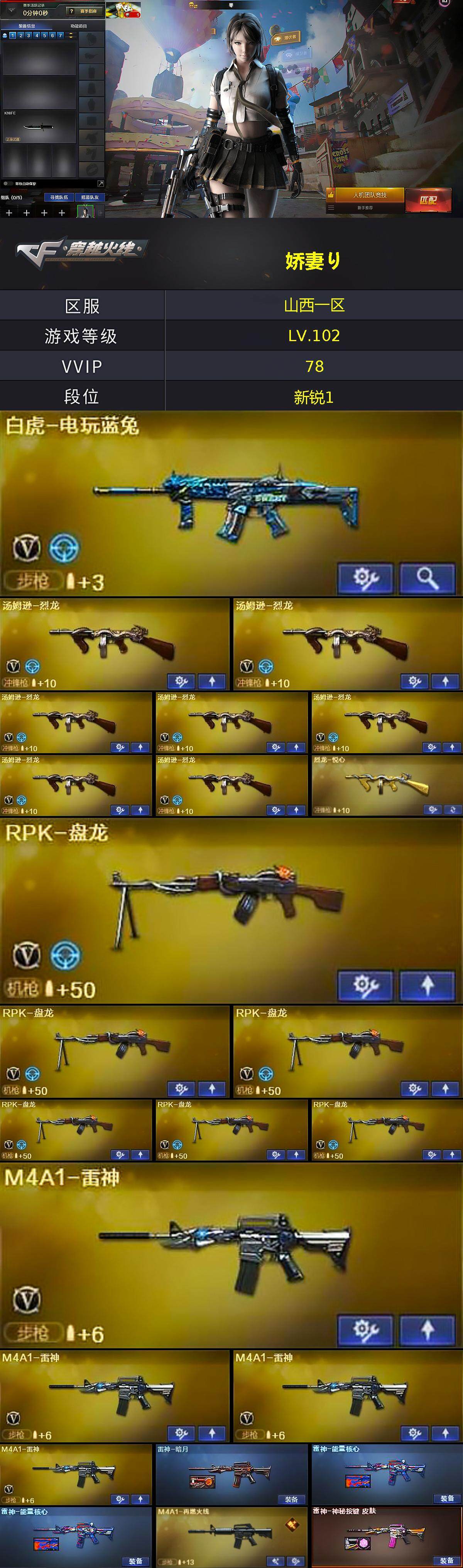 山西一区-78v-9王者-5炫金 【热门武器】:死亡之眼3,白虎-电玩蓝兔,cat-刀锋,m4a1-黑骑士2,汤姆逊-烈龙7,rpk-盘龙6,加特林-炼狱2,沙鹰-修罗6 【王者炫金武器】:王者之影,王者之怒2,炼狱-悦蓝2,烈龙-悦心,王者之魂,王者之啸,炫金火麒麟,炫金黑龙,炫金毁灭2,炫金修罗 【音效卡】:barrett-碧霄极光音效卡,炼狱-百战金芒-庆典舞曲音效卡