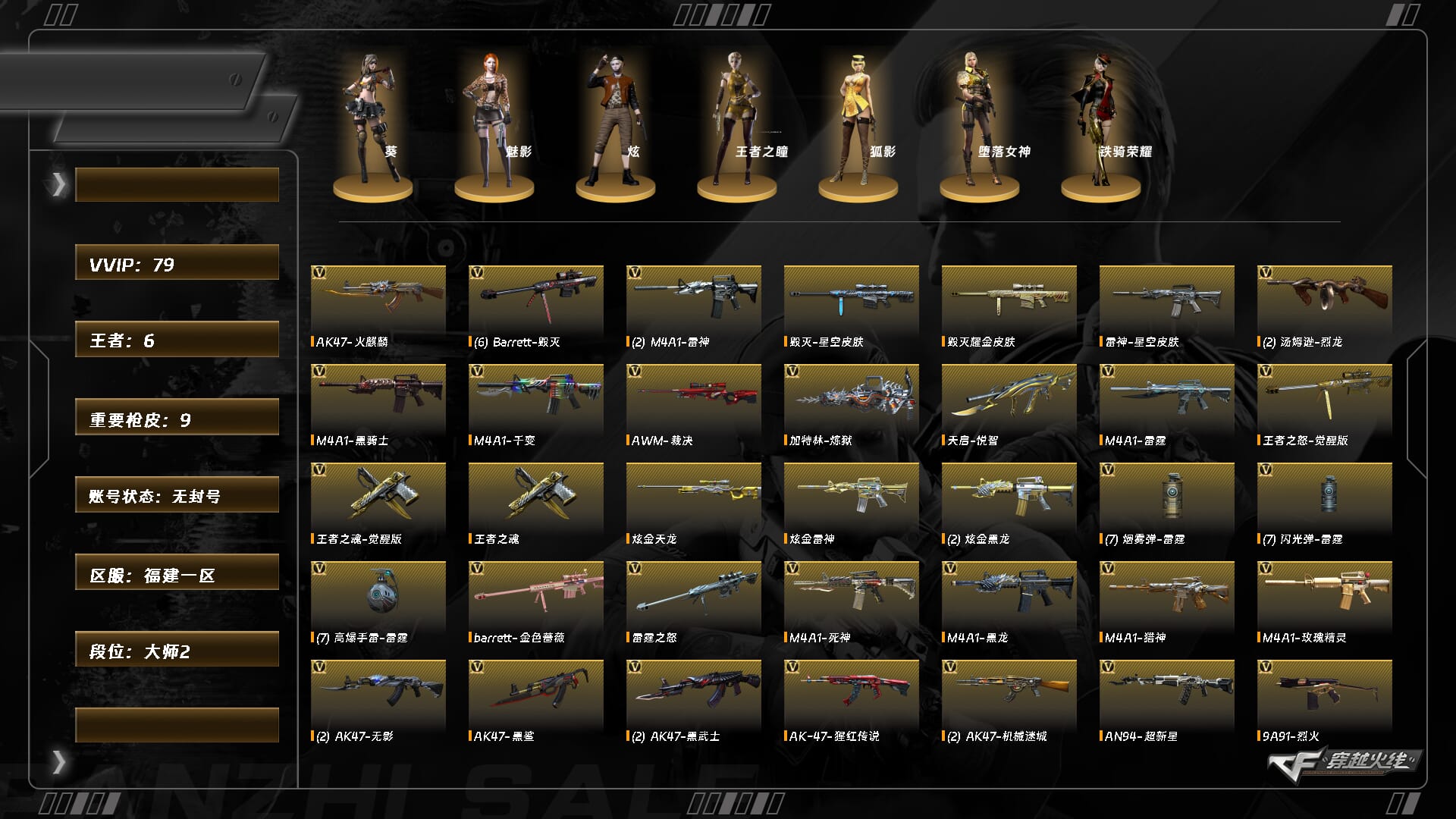 8913/钱包无法注销/东部/福建一区/【大师2】/lv.102 荣耀元帅/79v/雷霆套/cop雷霆/毁灭/6/毁灭音效卡/芭蕾特金色蔷薇/裁决/火麒麟/雷神/黑骑士/2烈龙/cop旗袍/七套雷霆雷/【角色】/葵/魅影/炫/王者之瞳/狐影/堕落女神/铁骑荣耀/【道具】/永久护目镜/超级背包/