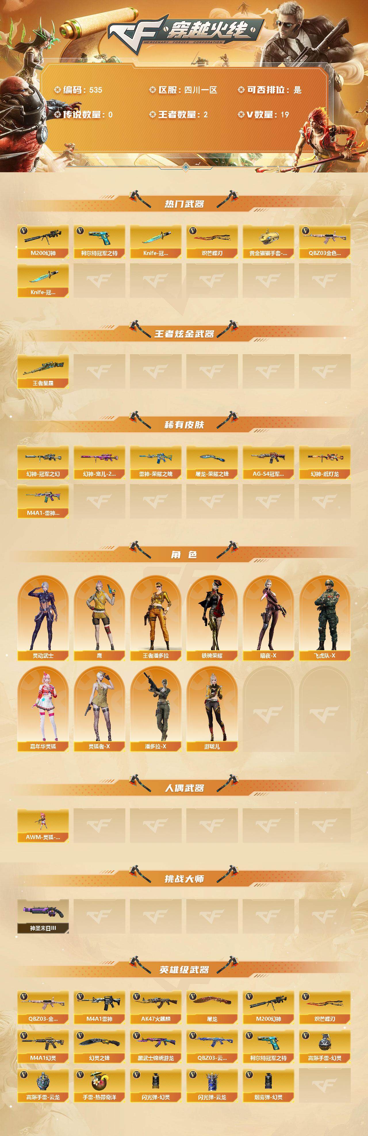 [14513862]四川一区-19v-2王者-0炫金 【热门武器】:q03-金色蔷薇,m200-幻神,柯尔特-冠军之特,knife-冠军之刃2,炽芒蝶刃,黄金猫猫手套-白鲨 【王者炫金武器】:王者星霆 【皮肤】:幻神-冠军之幻,幻神-宠儿-2021mvp,幻神-纸灯龙皮肤,雷神-荣耀之魄,m4a1-雷神-巅峰荣耀皮肤,黑骑士-ag-s4冠军典藏,屠龙-荣耀之锋 【角色】:鹰,王者潘多拉,暗夜-x,飞虎队-x,嘉年华灵狐,灵动武士,灵狐者-x,潘多拉-x,铁骑荣耀,游珑儿 【人偶武器】:awm-灵狐-15周年嘉年华 【挑战大师】:神圣爆裂者-末日iii 【英雄级武器】:ak47-火麒麟,m4a1-雷神,m4a1-幻灵,q03-云龙,黑武士-锦绣游龙,q03-金色蔷薇,m200-幻神,柯尔特-冠军之特,屠龙,幻灵之锋2,炽芒蝶刃,高爆手蕾-幻灵,高爆手蕾-云龙,手蕾-热带奇洋,闪光丹-幻灵,闪光丹-云龙,盐雾蛋-幻灵2 【道具】:超级背包,灵魂忍者,变异宝贝,迷雾幽灵,夺命之镰,防化服,金色流光-呛王排位,星辰流光-呛王排位,呛王排位28赛季金色流光,呛王排位29赛季金色流光,ep战队收纳包,ep战队击杀图标,防弹头盔3,防弹衣3,c4工具钳3,手蕾包3 【特殊呛械】: