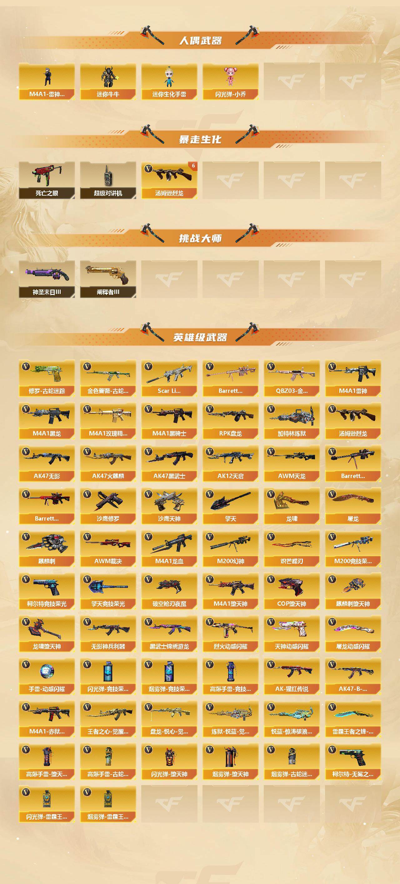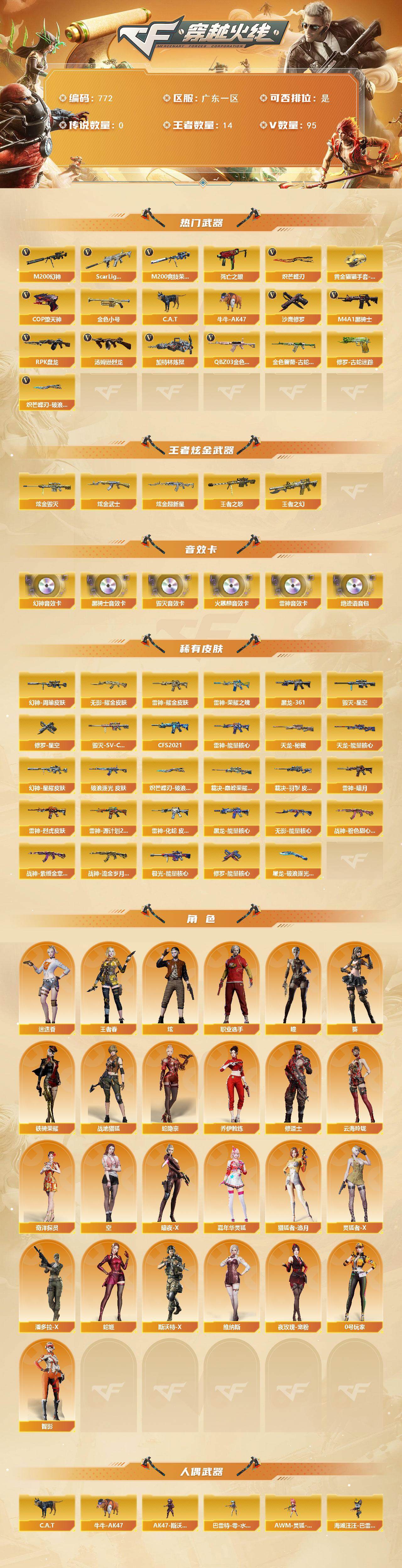 [14513902]广东一区-95v-14王者-5炫金 【热门武器】:q03-金色蔷薇,scar light-白虎,m200-幻神,金色蔷薇-古蛇迷踪,修罗-古蛇迷踪,m200-竞技荣光,死亡之眼2,金色小号,c.a.t,牛牛-ak47,m4a1-黑骑士,汤姆逊-烈龙6,rpk-盘龙2,加特林-炼狱,cop-堕天神2,沙鹰-修罗2,炽芒蝶刃,炽芒蝶刃-破浪逐光 皮肤,黄金猫猫手套-白鲨 【王者炫金武器】:王者之幻,王者之怒,炫金武士,炫金超新星2,炫金毁灭2 【音效卡】:m200-幻神音效卡,ak47-火麒麟音效卡,m4a1-雷神音效卡,m4a1-黑骑士音效卡,barrett-毁灭音效卡,绝迹语音包 【皮肤】:幻神-周瑜皮肤,幻神-星耀 皮肤,金色蔷薇-破浪逐光 皮肤,裁决-巅峰荣耀 皮肤,裁决-羽掣 皮肤,雷神-暗月,雷神-能量核心,雷神-荣耀之魄,雷神-耀金皮肤,雷神-烈虎皮肤,雷神-源计划2.0专属 皮肤,雷神-化蛇 皮肤,毁灭-星空,毁灭-sv-cfpls16冠军,黑龙-能量核心,m4a1-黑龙-361,黑骑士-cfs2021,无影-能量核心,无影耀金皮肤,战神-粉色甜心皮肤,战神-紫绶金章皮肤4,战神-流金岁月皮肤2,天龙-秘银,天龙-能量核心,极光-能量核心,修罗-能量核心2,修罗-星空,屠龙-破浪逐光 皮肤,炽芒蝶刃-破浪逐光 皮肤 【角色】:葵,瞳,炫,迷迭香,战地猎狐,王者春,蛇隐宗,奇洋探员,乔伊教练,修道士,云海玲珑,空,暗夜-x,嘉年华灵狐,猎狐者-追月,0号玩家,灵狐者-x,潘多拉-x,蛇姬,斯沃特-x,铁骑荣耀,维纳斯,夜玫瑰-宠粉,职业选手,智影 【人偶武器】:m4a1-雷神-精英刀锋,芭蕾特-零-水下丽影2,awm-灵狐-15周年嘉年华,海滩汪汪-芭蕾特,c.a.t,牛牛-ak47,迷你牛牛,迷你生化手蕾,闪光丹-小乔,ak47-斯沃特 【暴走生化】:死亡之眼2,超级对讲机 【挑战大师】:神圣爆裂者-末日iii,阐释者iii 【英雄级武器】:ak47-火麒麟,m4a1-黑龙2,m4a1-雷神2,m4a1-黑骑士,ak47-无影,ak47-黑武士,ak12-天启2,m4a1-龙血,m4a1-堕天神,scar light-白虎,无影-神兵利器,黑武士-锦绣游龙,金色蔷薇-古蛇迷踪,m4a1-玫瑰精灵,q03-金色蔷薇,