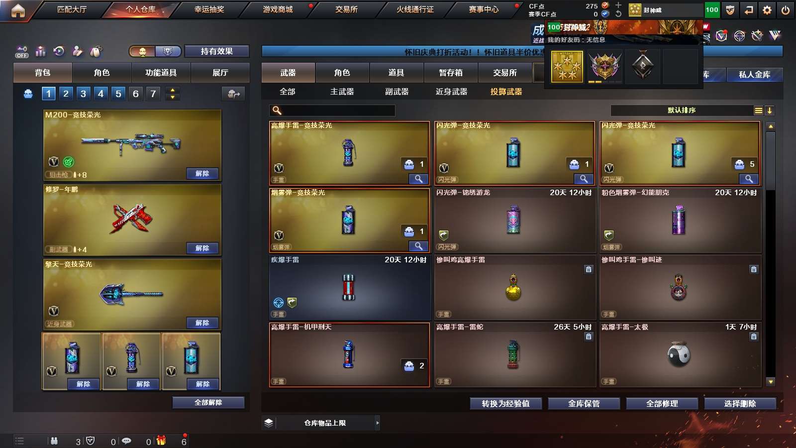 特76631南部湖南一区可排位可二次【湖南一区/8V/vip1【纯白无封号】【M200-竞技荣光】【擎天-竞技荣光】【电竞教官-云悠悠/紫霞/雪莉杨/潘多拉-X/幻影/复仇者】【Barrett-暗月传说】【Colt 1911-大黄蜂/新USP-枪王排位奖励5】【斩神刀】【高爆手雷-竞技荣光/闪光弹-竞技荣光2/烟雾弹-竞技荣光】【语音特效-生化】【防弹头盔4/防弹衣/C4工具钳4/手雷包4/防化服2】截图展示段位不代表实际段位,如赛季更新等不/拒因素发生变化、时限道具不保证所剩时间。标题未写送点卷默认不送766310580 掌火476903391 金额480