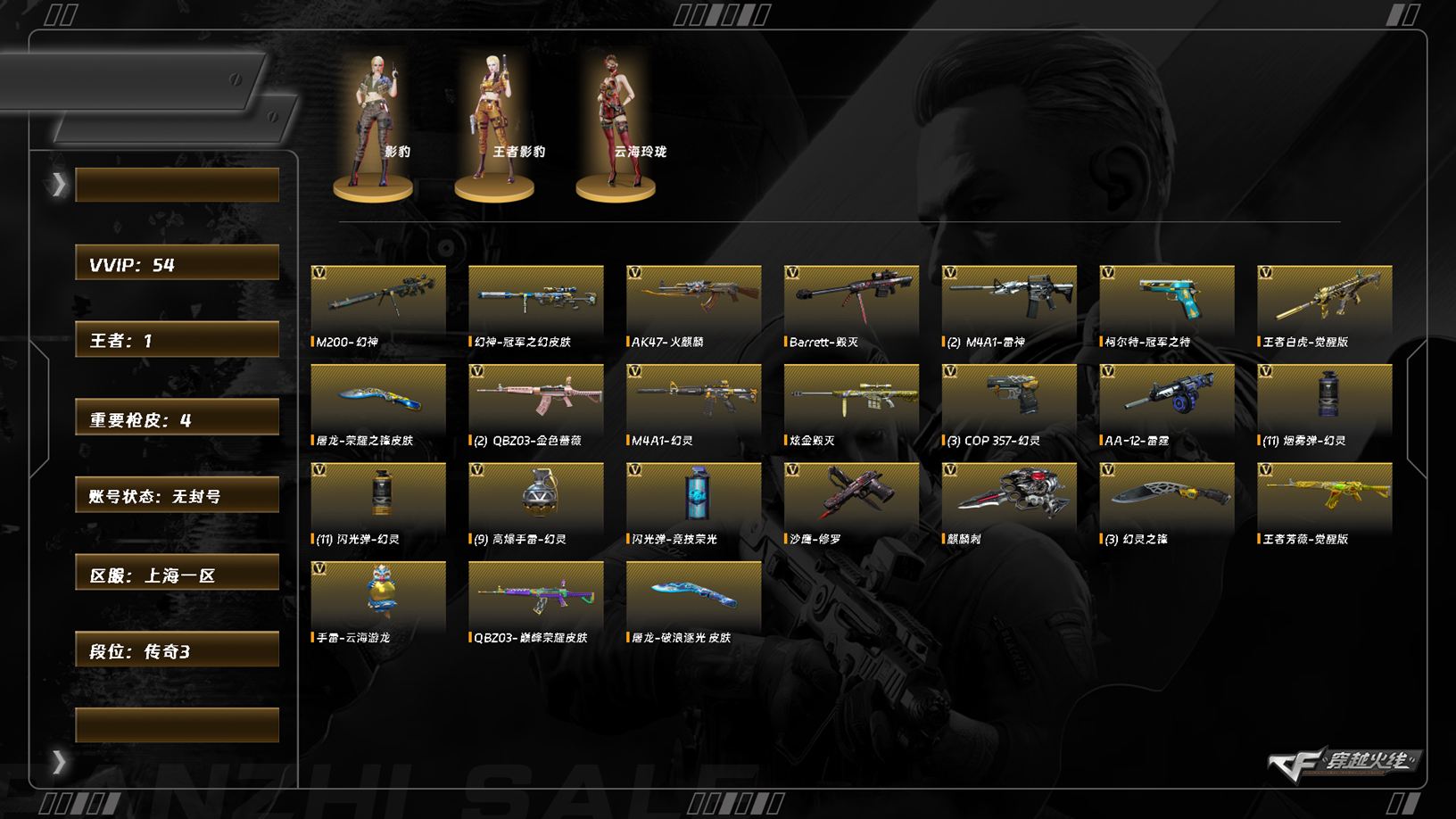 7159,东部,上海一区,可排位,54v,幻神,幻神冠军之幻,王者白虎,觉醒版,q金色蔷薇,2,q巅峰荣耀,幻灵套装,cop幻灵,3,柯尔特冠军之特,【四防角色,影豹,王者影豹,】,【角色】,云海玲珑,王者武器,王者芳薇,炫金武器,炫金毁灭,【小人呛,雷神小红,毁灭孙三炮,】,永久a