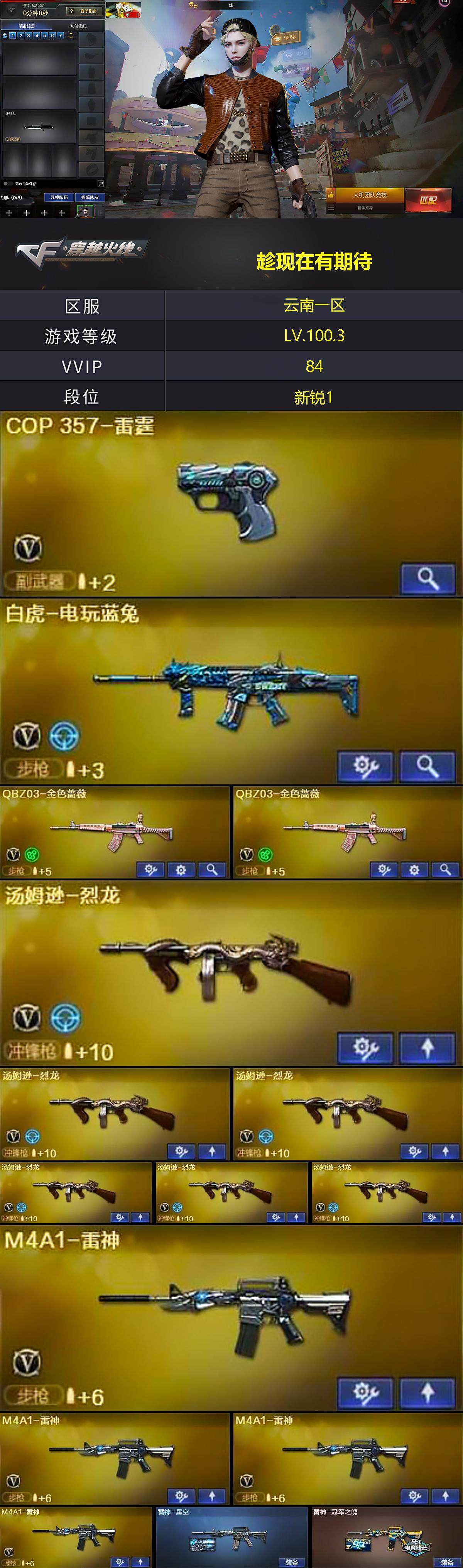 云南一区-84v-5王者-1炫金 【热门武器】:q03-金色蔷薇2,死亡之眼,白虎-电玩蓝兔,金色小号,cat-刀锋,牛牛-ak47,m4a1-黑骑士,汤姆逊-烈龙6,毁灭-孙三炮,cop-白鲨,沙鹰-修罗5 【王者炫金武器】:玫瑰精灵-悦动,王者之锋,炫金骑士 【音效卡】:m4a1-黑骑士音效卡 【皮肤】:雷神-星空,雷神-冠军之魄,毁灭-星空,毁灭-冠军之怒,毁灭-风暴,黑龙-能