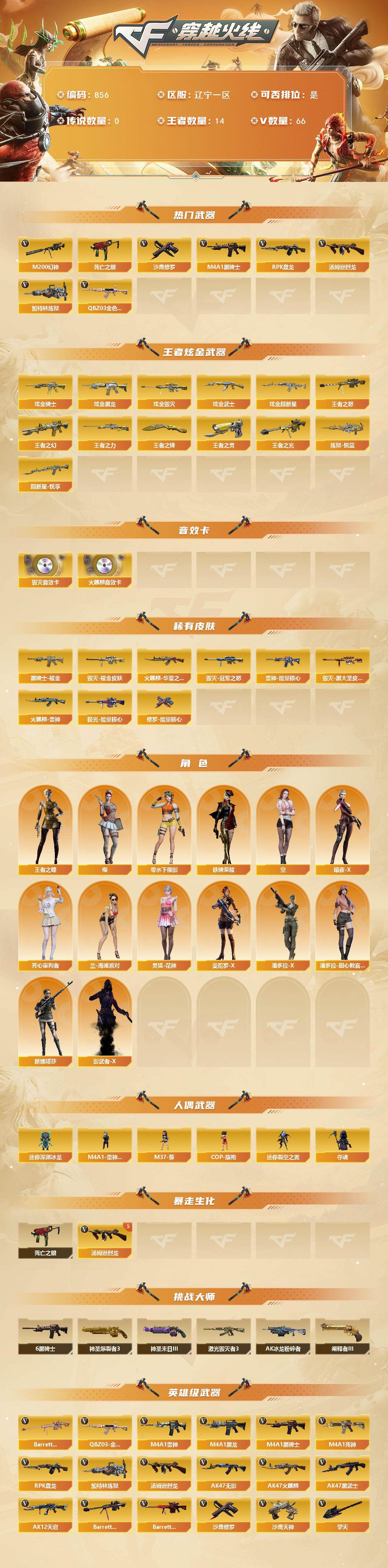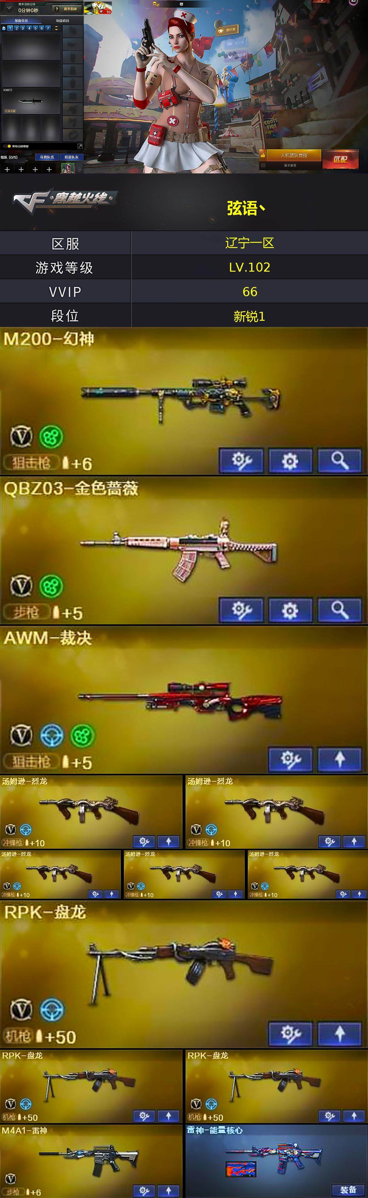 辽宁一区-66v-14王者-5炫金 【热门武器】:q03-金色蔷薇,m200-幻神,死亡之眼,m4a1-黑骑士6,汤姆逊-烈龙5,rpk-盘龙3,加特林-炼狱4,沙鹰-修罗6 【王者炫金武器】:超新星-悦享,王者之幻,王者之光,王者之怒,王者之力,炼狱-悦蓝,王者之灵,王者之锋2,炫金骑士,炫金黑龙,炫金武士,炫金超新星,炫金毁灭 【音效卡】:ak47-火麒麟音效卡,barre