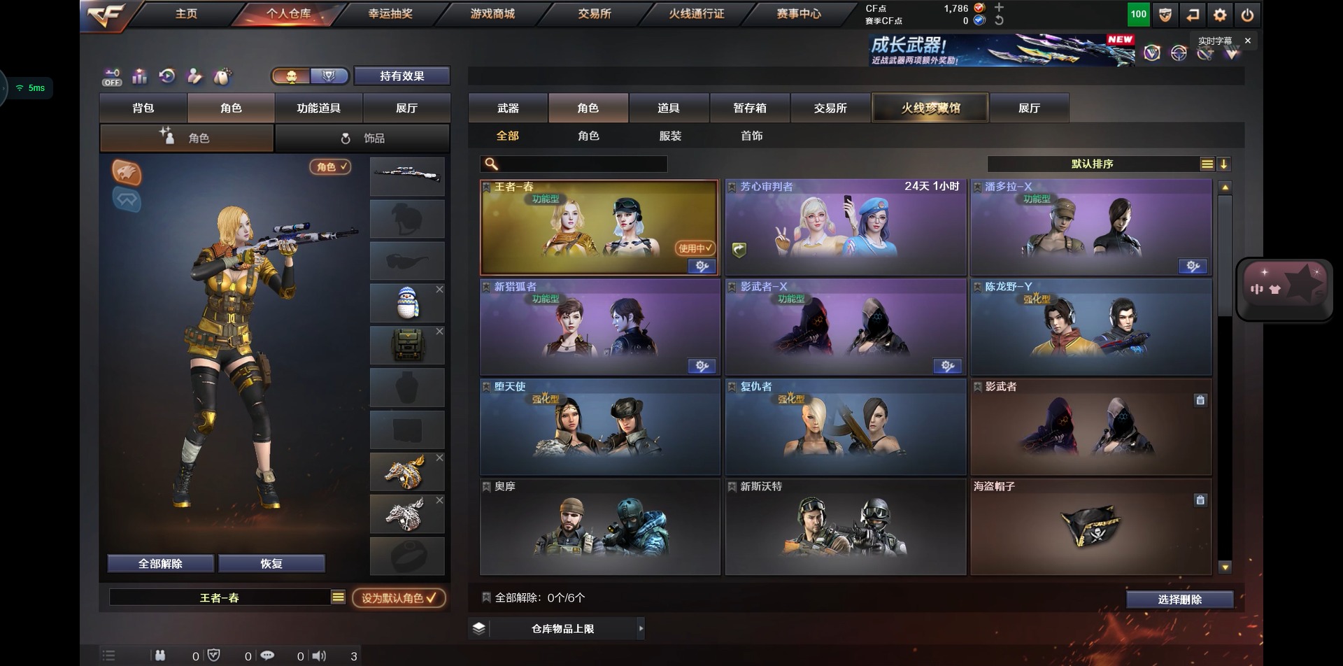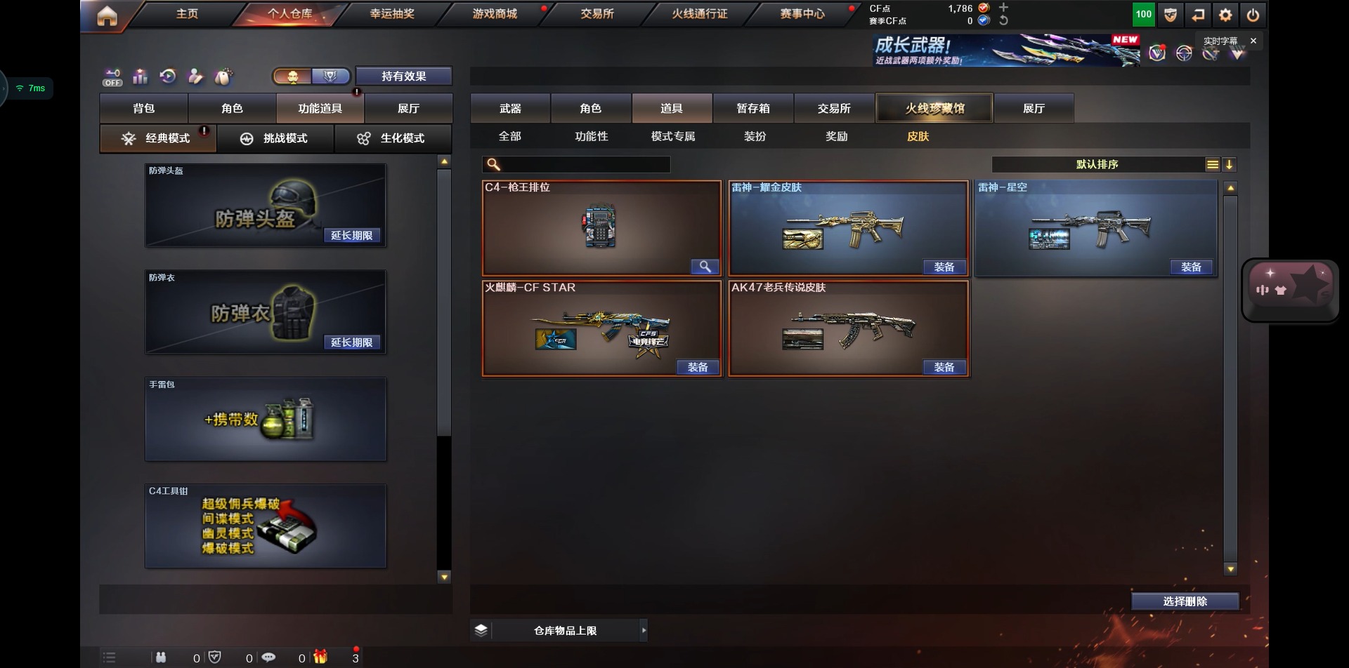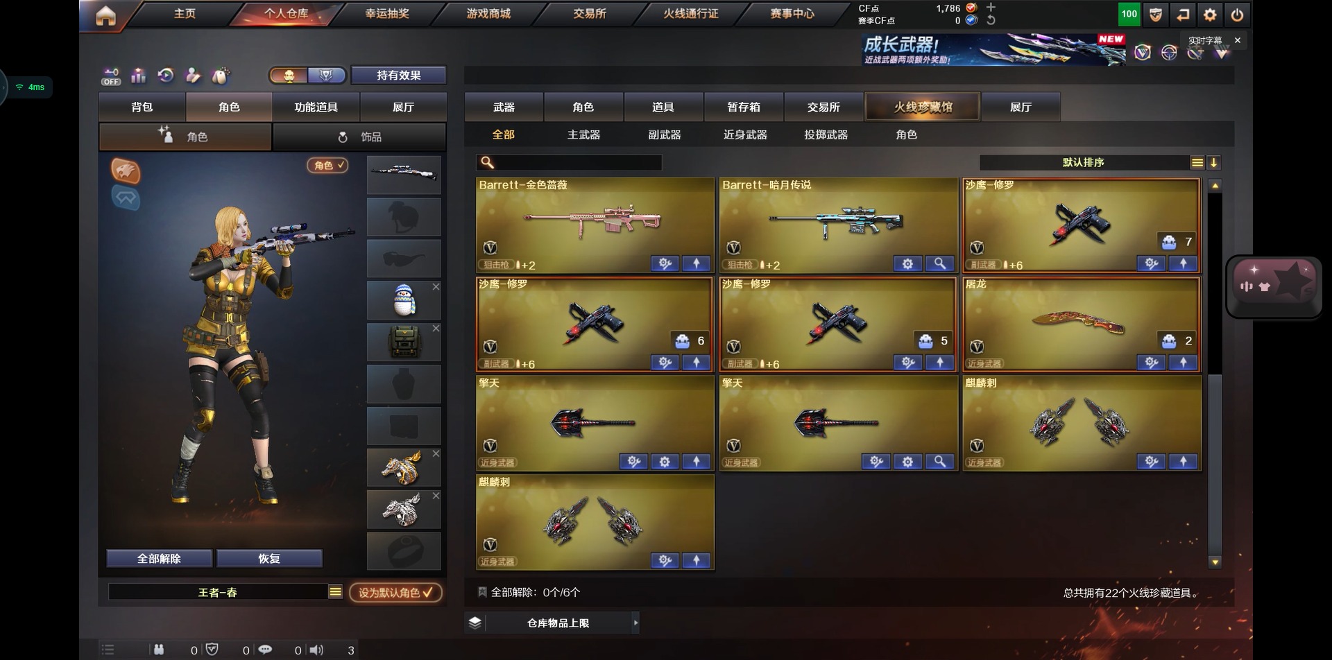5王者武器 3炫金武器 22v武器 可二次 可修改实名 【排位资格】:有 【v武器】:ak47-火麒麟ak47-黑鲨ak47-机械迷城ak-47-猩红传说m4a1-雷神m4a1-龙血m4a1-玫瑰精灵barrett-毁灭barrett-暗月传说q03-金色蔷薇沙鹰-修罗屠