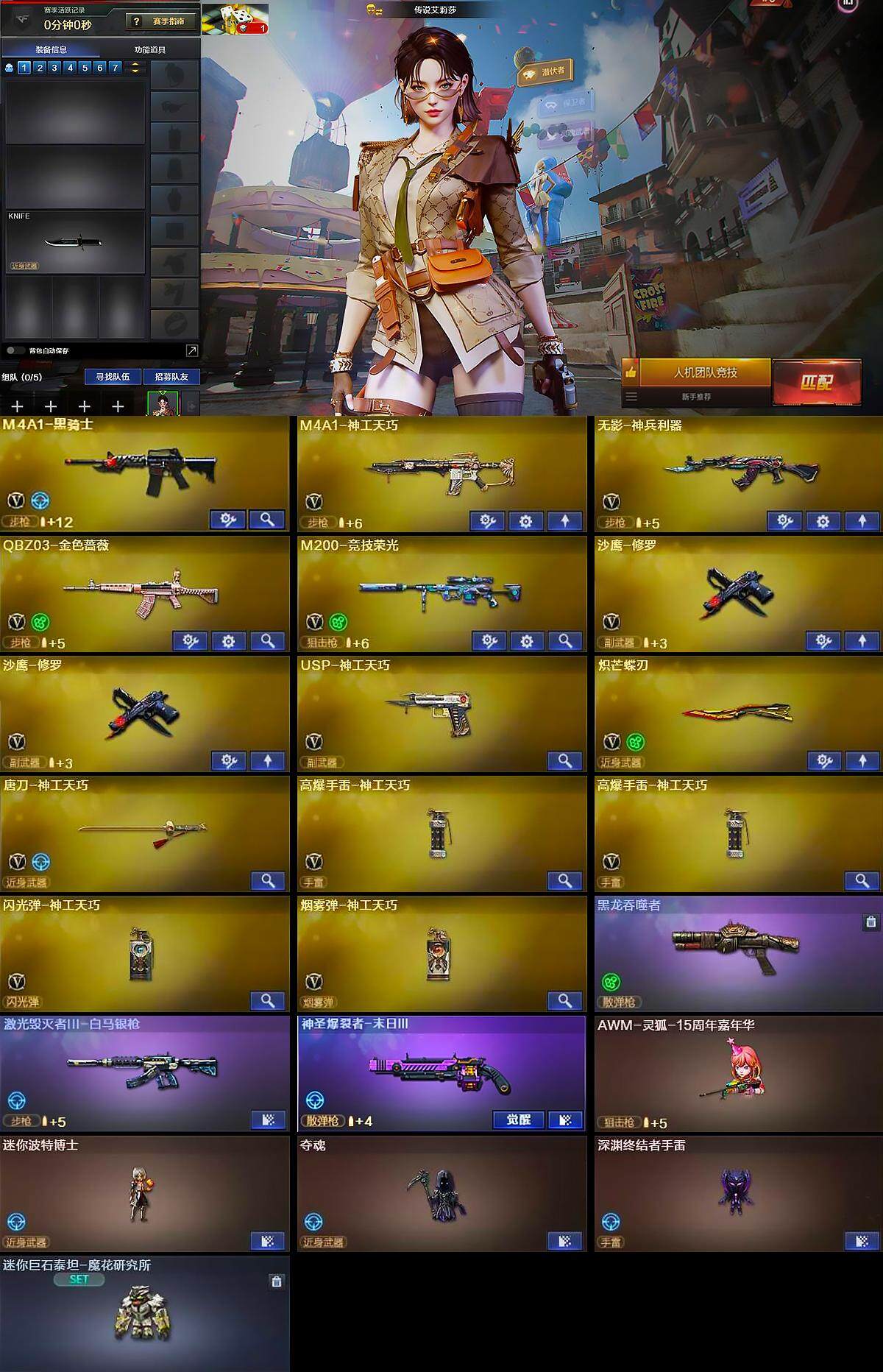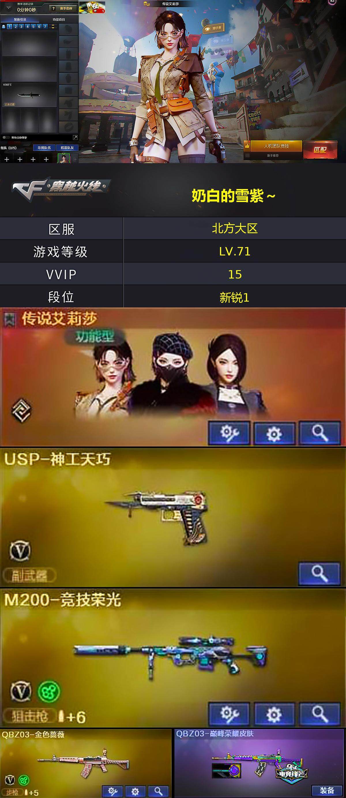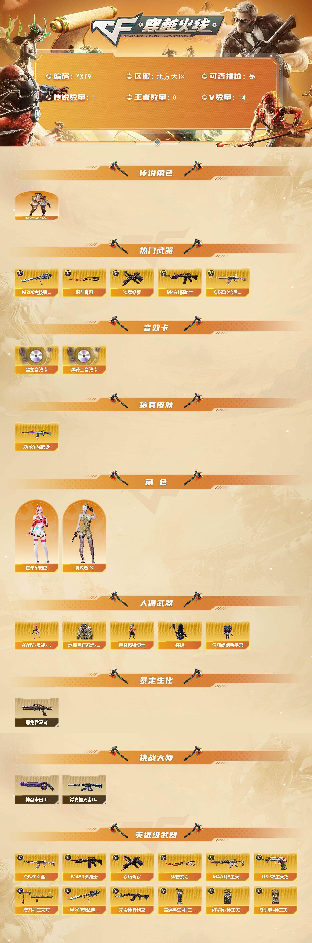 【传说艾莉莎.m200竞技荣光.q金色蔷薇.炽芒蝶刃】f9【可二次】 北方大区-14v-0王者-0炫金 【传说角色】:传说艾莉莎 【热门武器】:q03-金色蔷薇,m200-竞技荣光,m4a1-黑骑士,沙鹰-修罗2,炽芒蝶刃 【音效卡】:m4a1-黑龙音效卡,m4a1-黑骑士音效卡 【皮肤】:q03-巅峰荣耀皮肤 【角色】:嘉年华灵狐,灵狐者-x 【人偶武器】:awm-灵狐-1