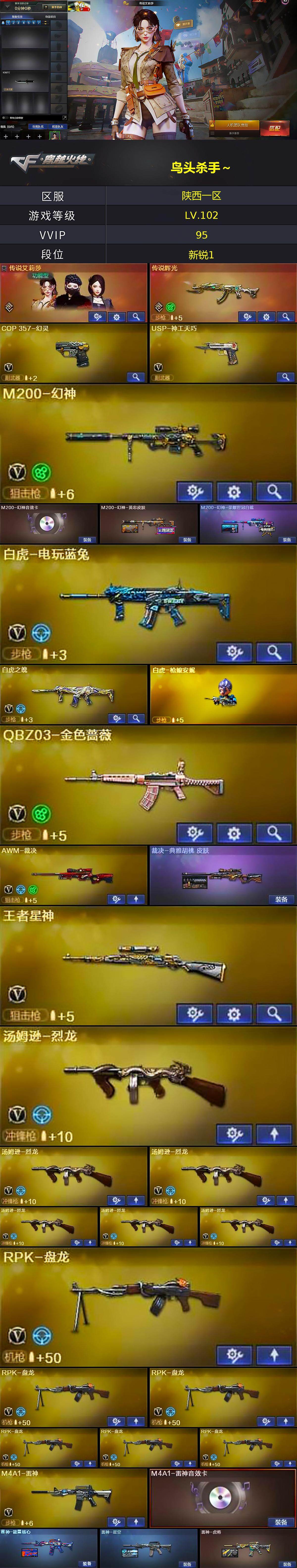 陕西一区-93v-16王者-2炫金 【传说武器】:传说辉光 【传说角色】:传说艾莉莎 【热门武器】:传说辉光,q03-金色蔷薇,m200-幻神,死亡之眼,白虎-电玩蓝兔,cat-刀锋,炼狱-迷你小钢,m4a1-黑骑士2,汤姆逊-烈龙6,rpk-盘龙6,加特林-炼狱,斯泰尔-蝴蝶,白虎-呛娘安妮,cop-白鲨,cop 357-幻灵,沙鹰-修罗4,黄金猫猫手套-白鲨 【王者炫金武器】: